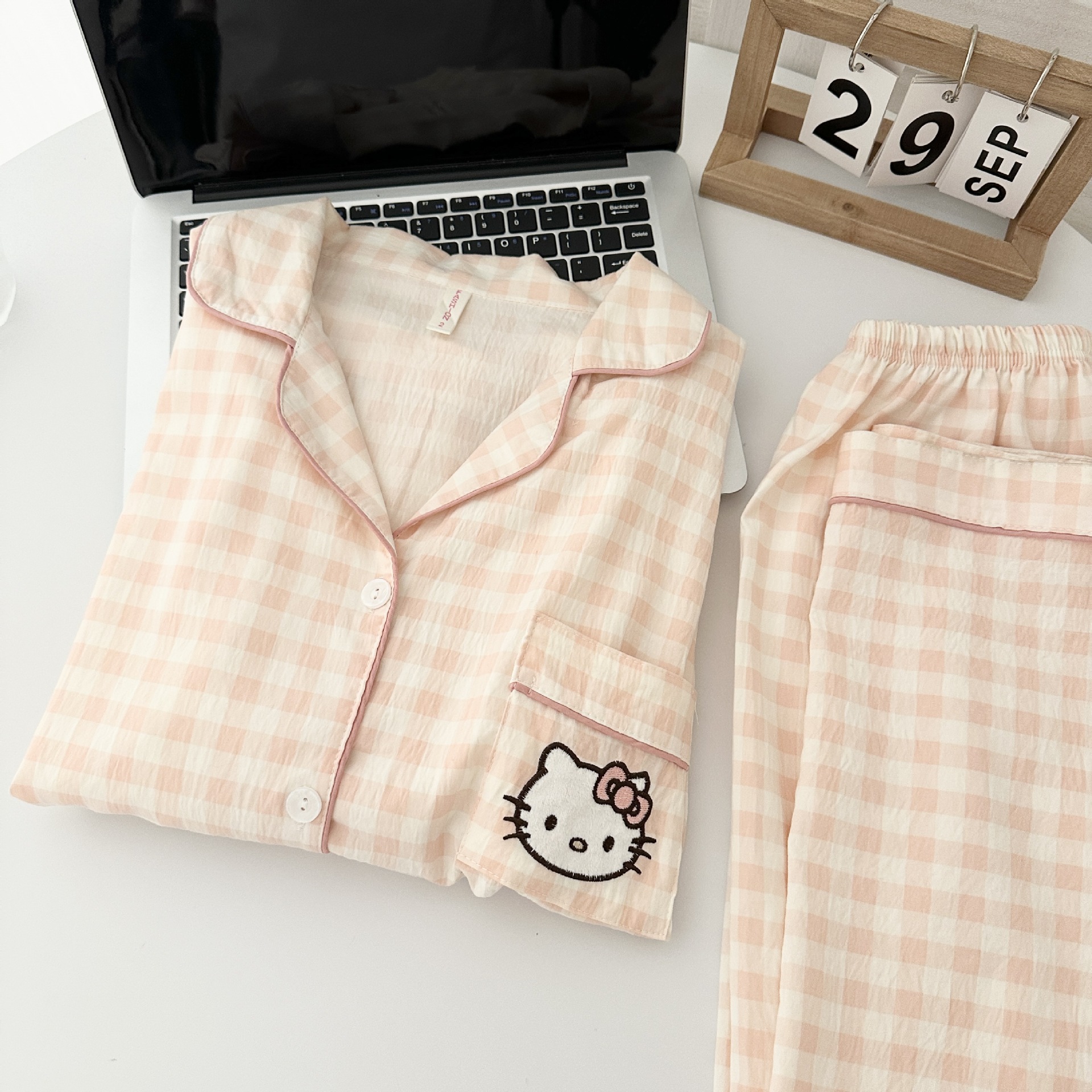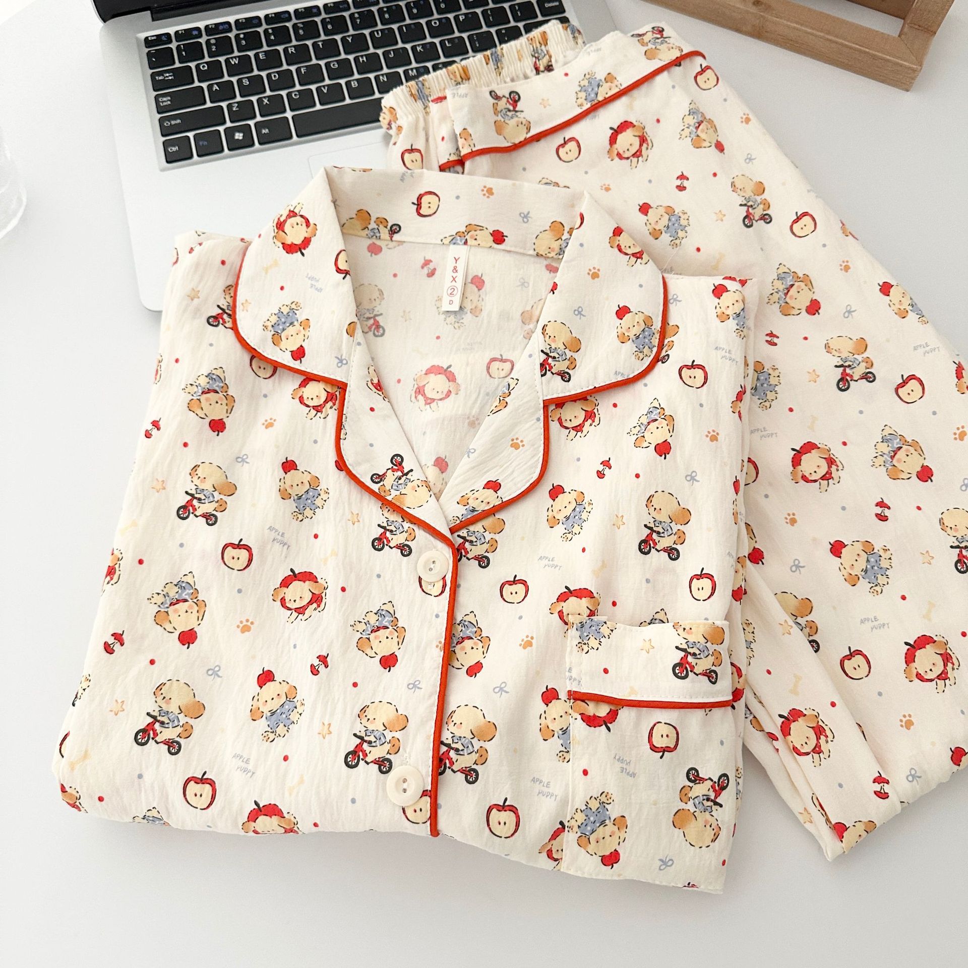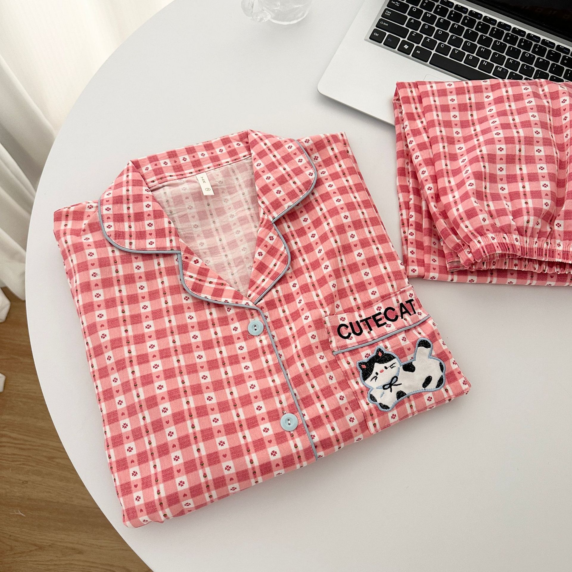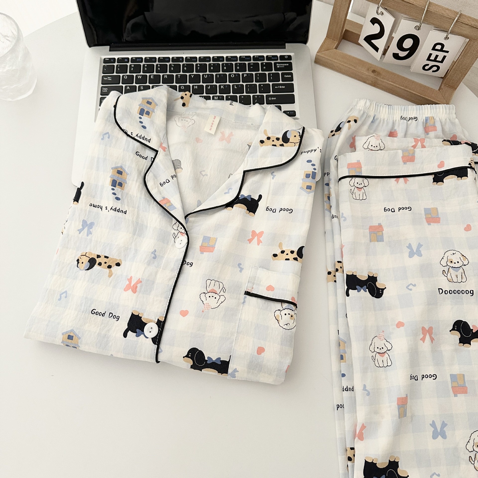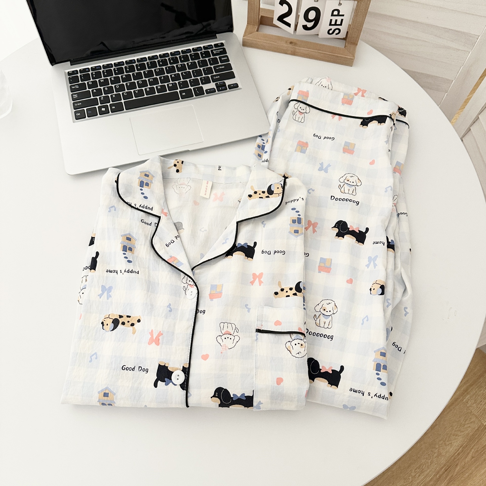 일본식 강아지 잠옷 여성의 봄과 가을 구름 면 긴팔 바지 귀여운 학생의 격자 무늬 외장스토어 가기