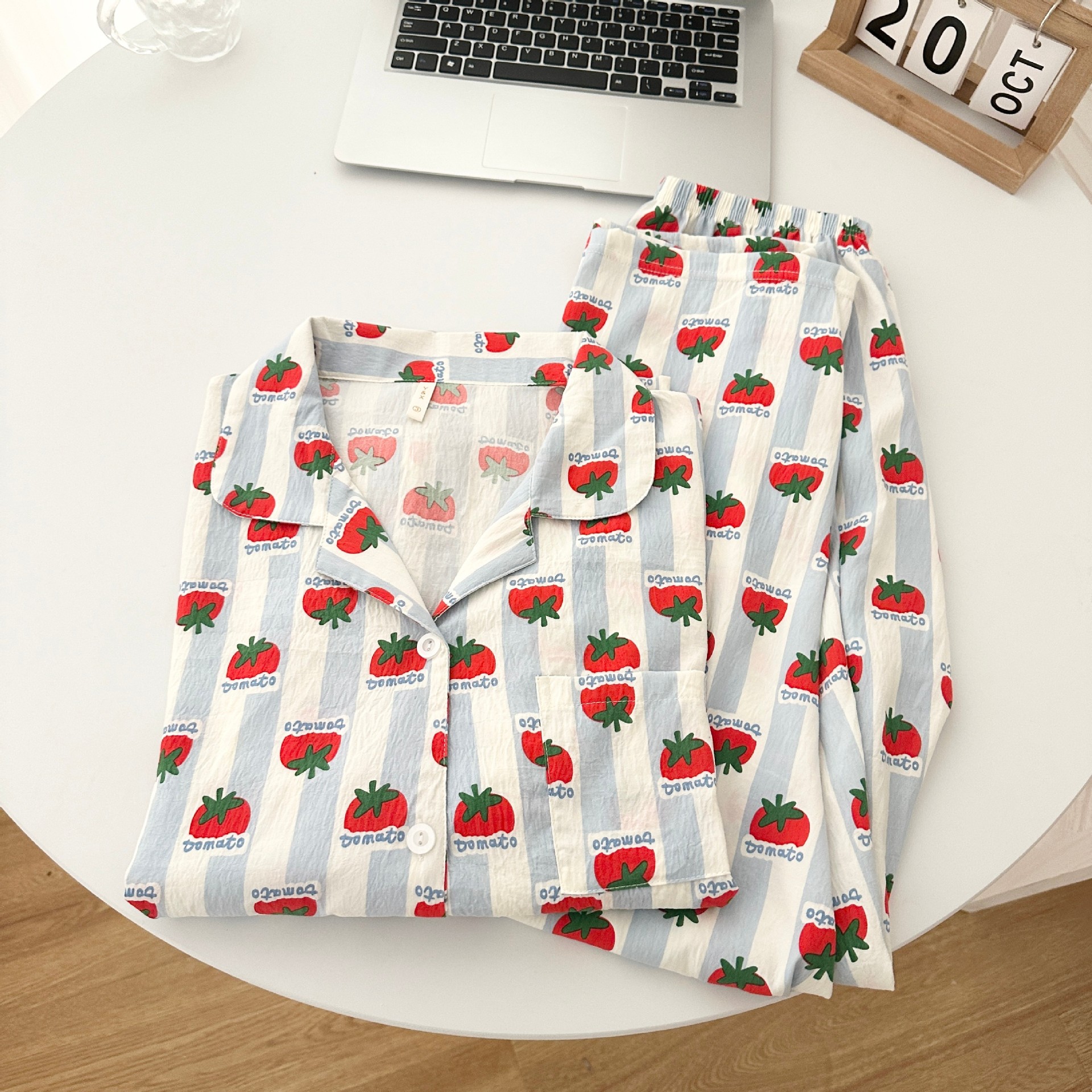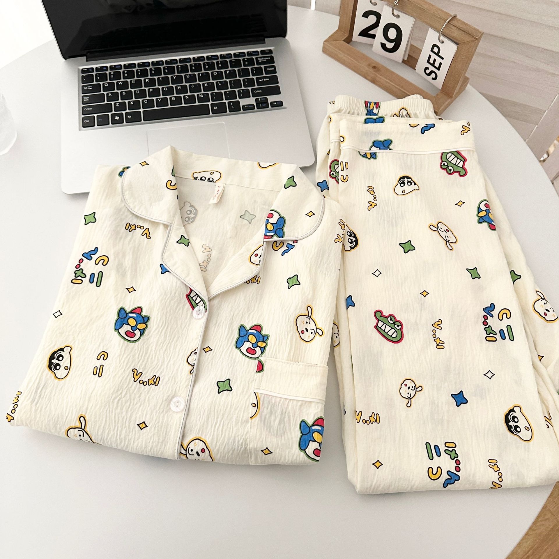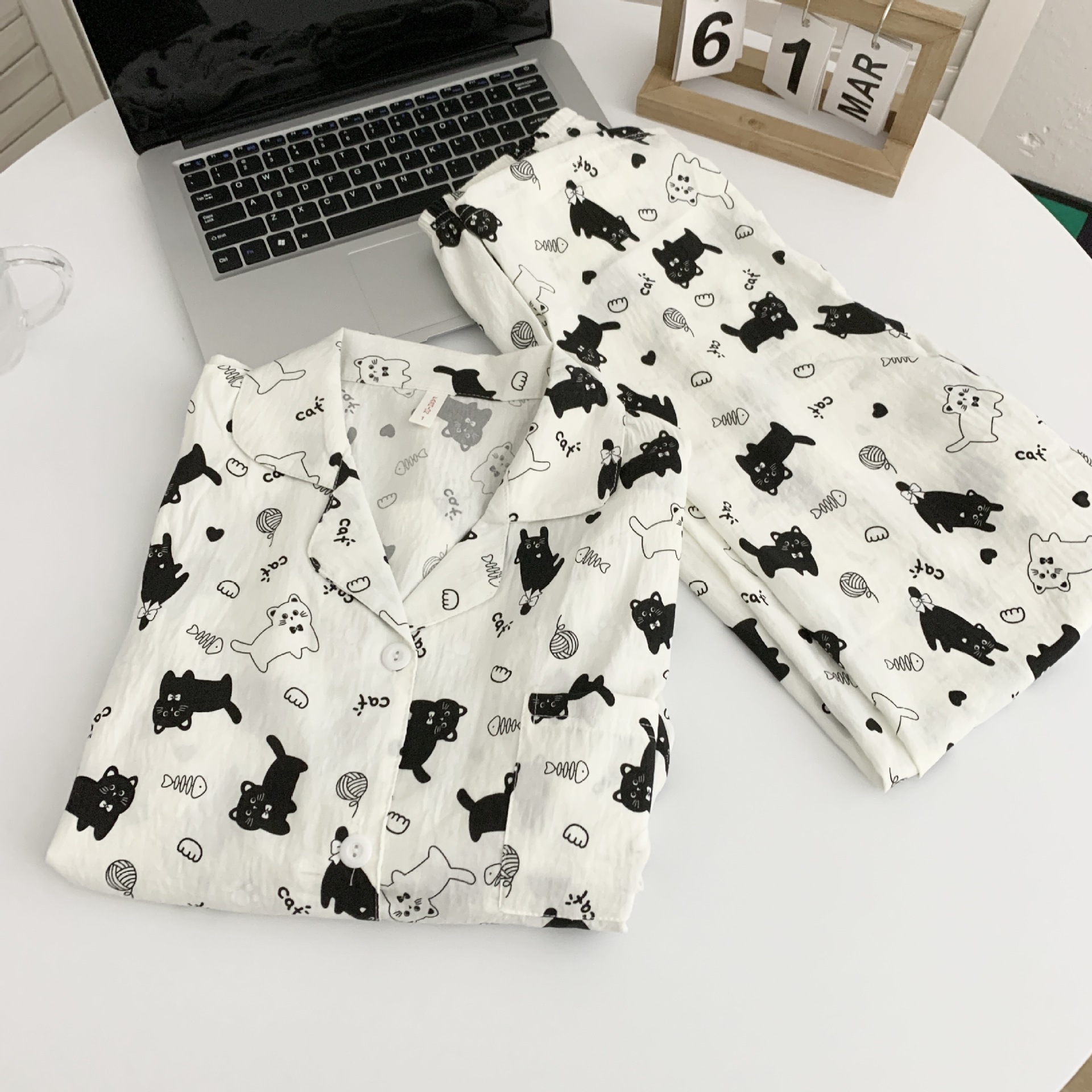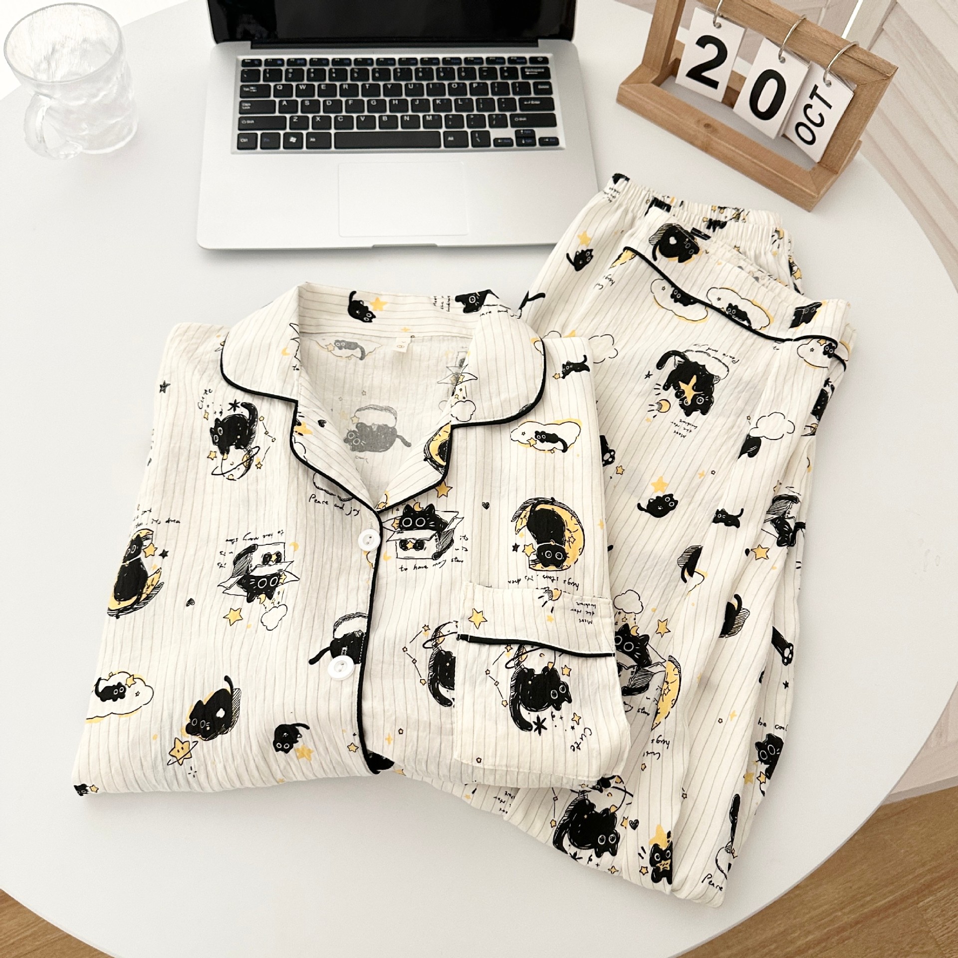 일본식 강아지 잠옷 여성의 봄과 가을 구름 면 긴팔 바지 귀여운 학생의 격자 무늬 외장스토어 가기