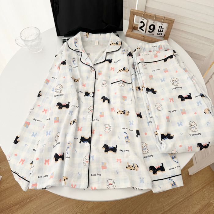 일본식 강아지 잠옷 여성의 봄과 가을 구름 면 긴팔 바지 귀여운 학생의 격자 무늬 외장