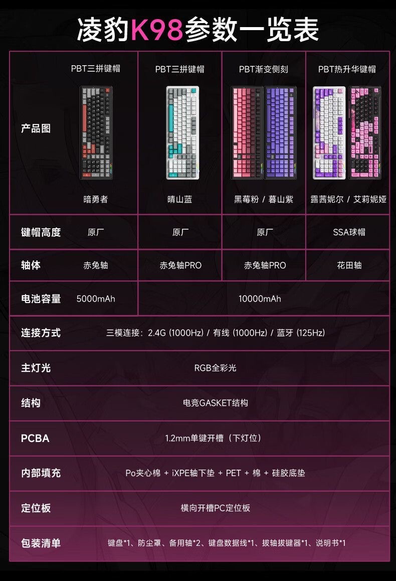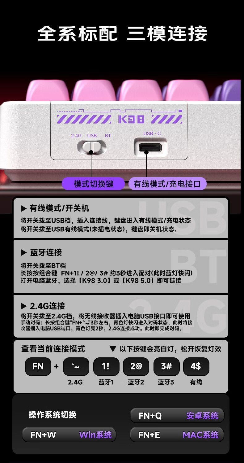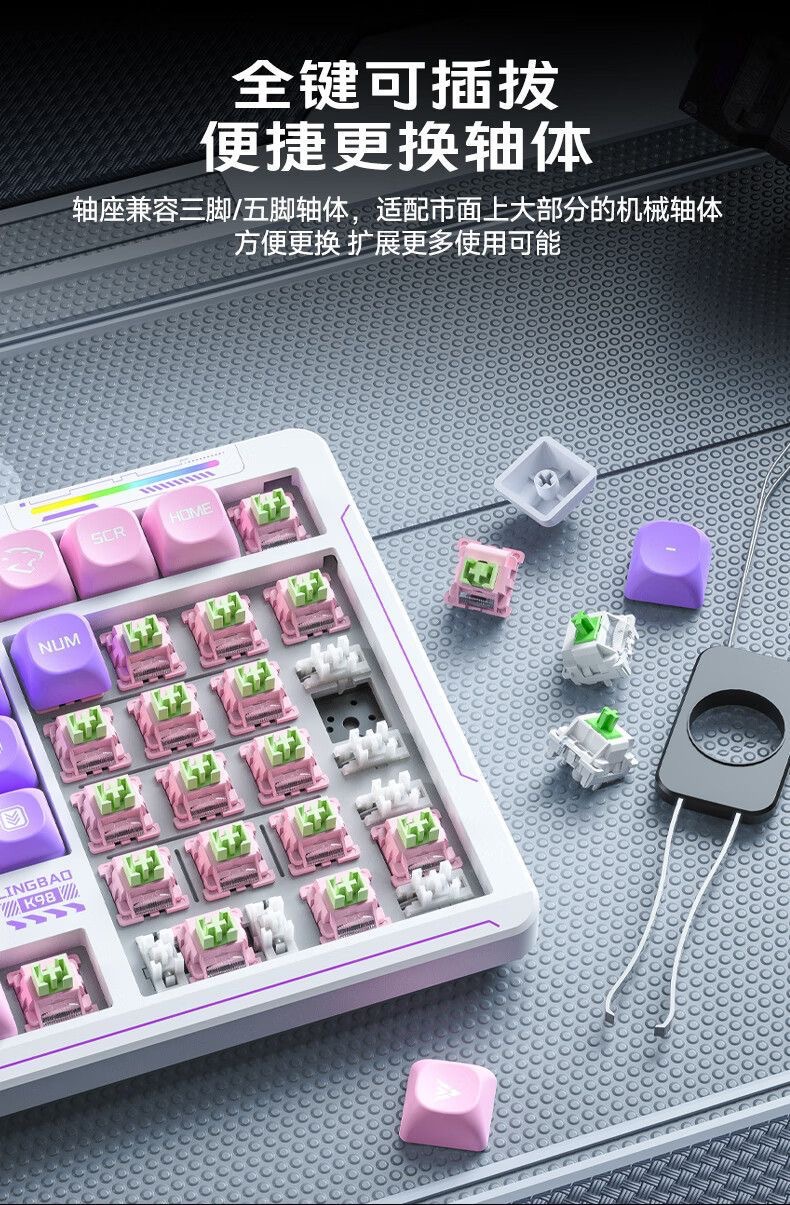 Lingbao K98 맞춤형 무선 3 모드 기계식 키보드 3 모드 풀 키 핫 스왑 가능 e-스포츠 게임용 키보드 101 키
