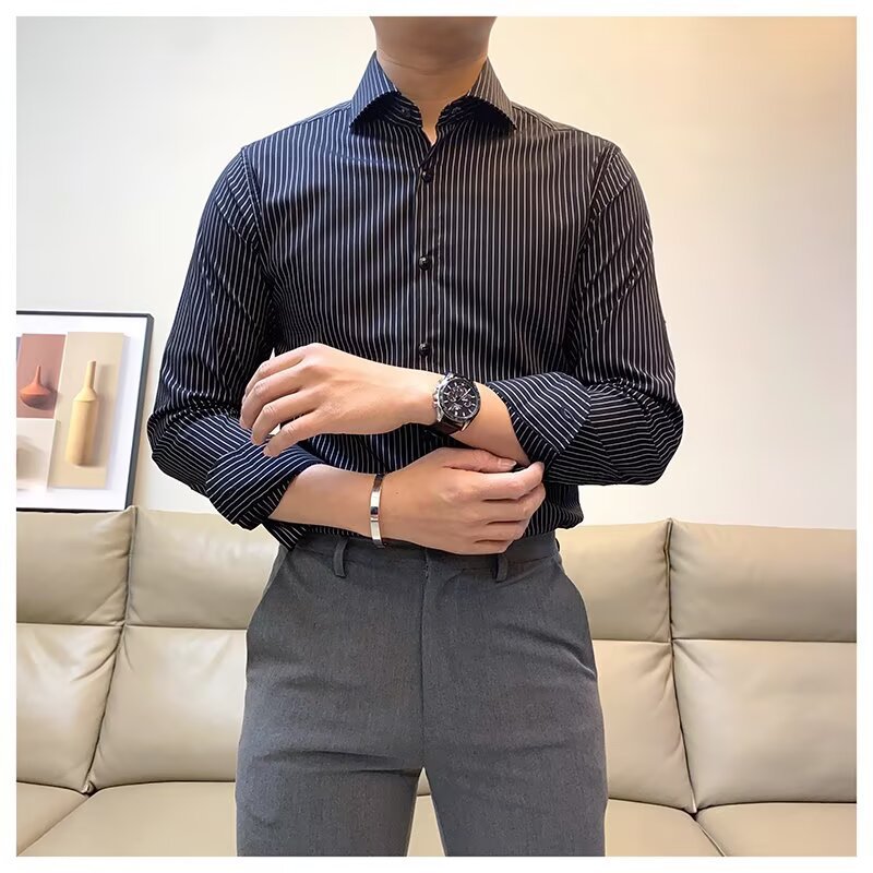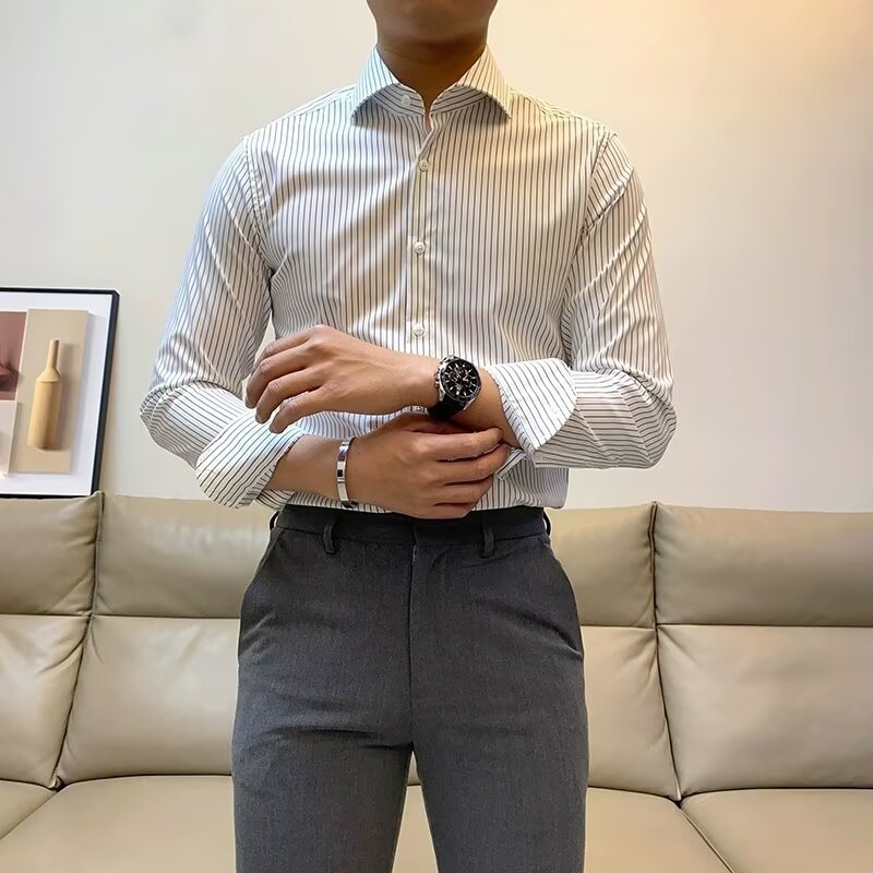 남성용 긴팔 셔츠 캐주얼 영국식 셔츠 캐주얼 슬림 핏 수직 줄무늬 격자 무늬 셔츠 남성용 국경 전자 상거래