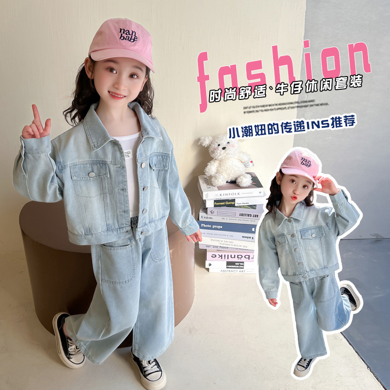 소녀의 봄과 가을 데님 세트 2025 새로운 세련된 유행 어린이 여성 아기의 봄 데님 코트 바지스토어 가기