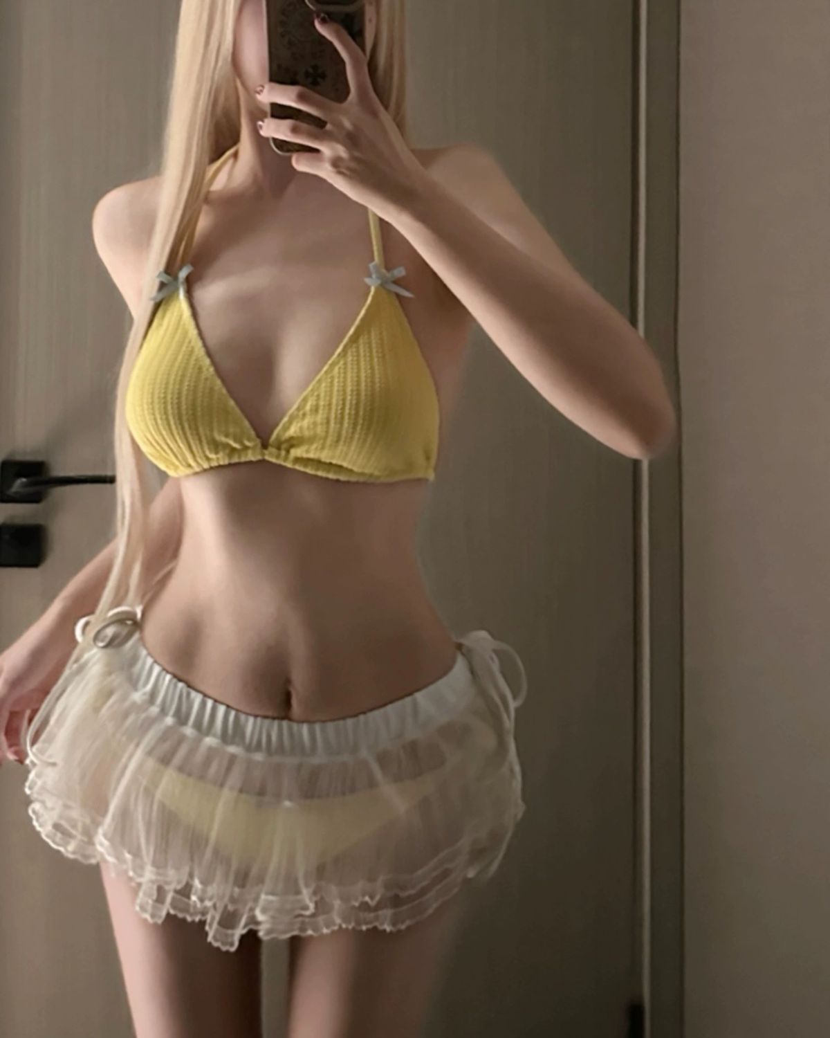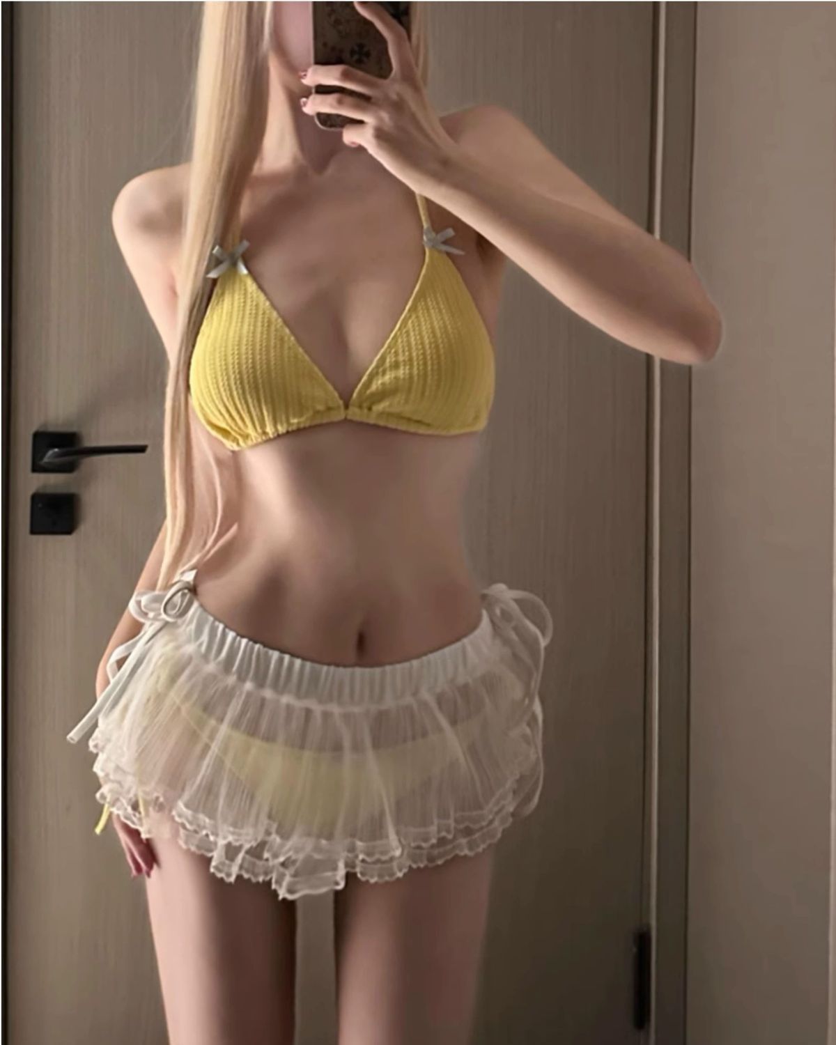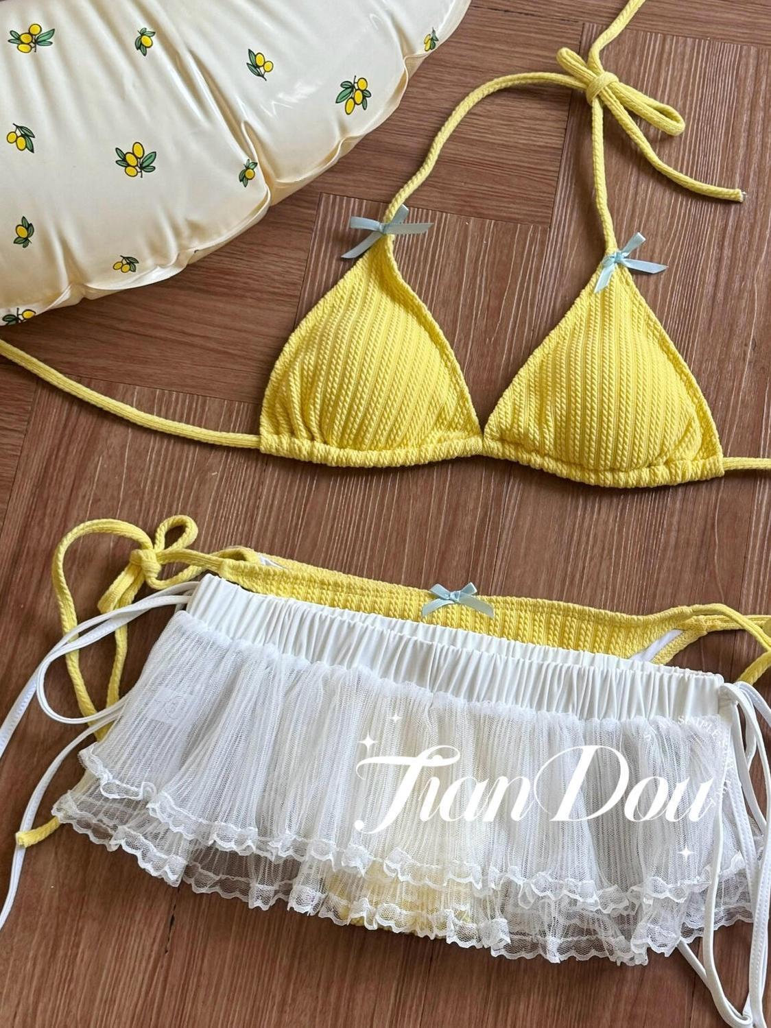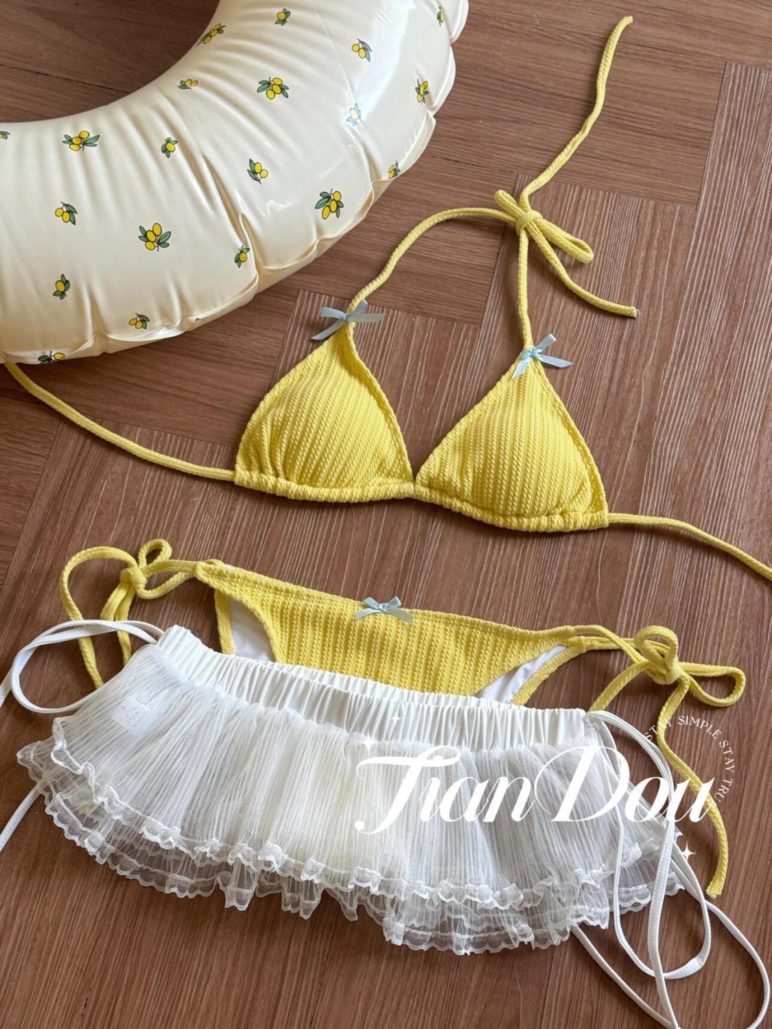 [작은 밀크 푸] 귀여운 노란색 주름진 소녀 순수한 섹시한 수영복 비키니 3 점 스플릿 온천