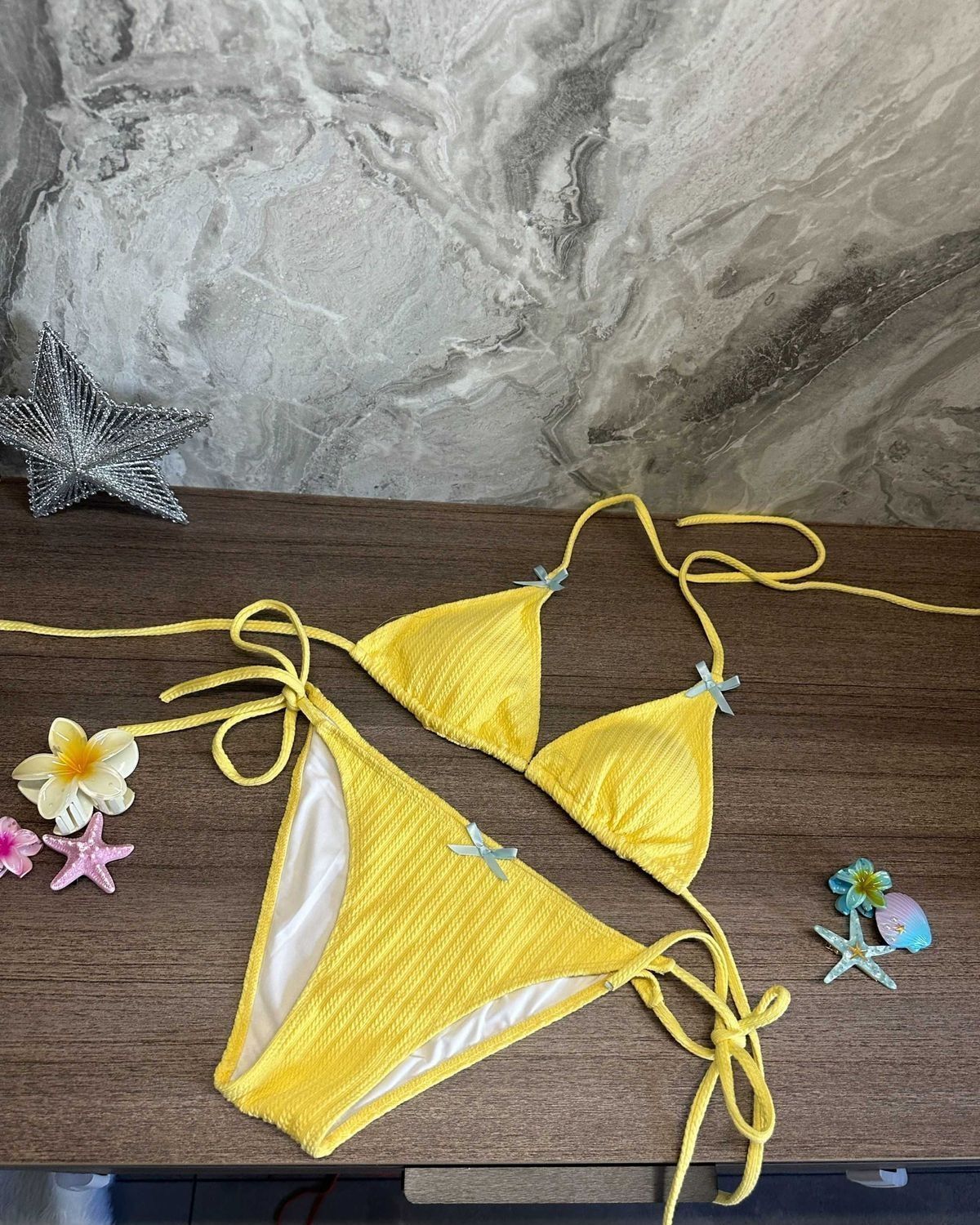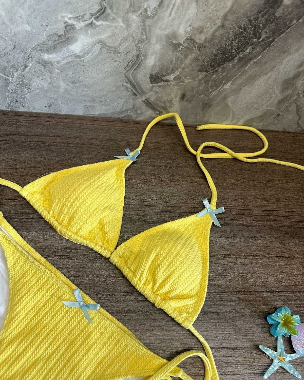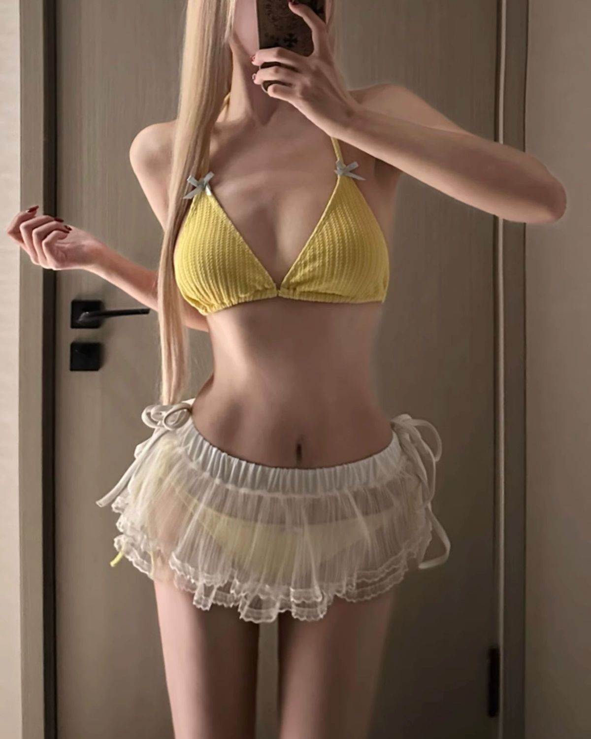 [작은 밀크 푸] 귀여운 노란색 주름진 소녀 순수한 섹시한 수영복 비키니 3 점 스플릿 온천