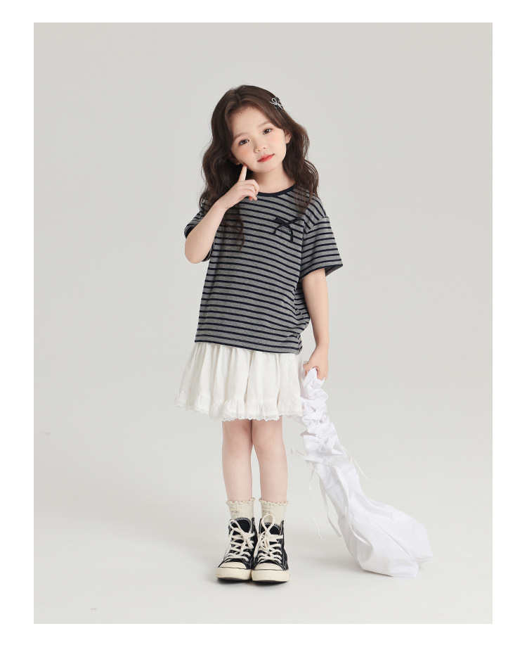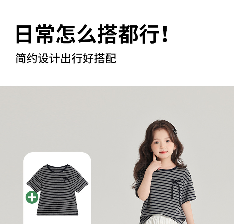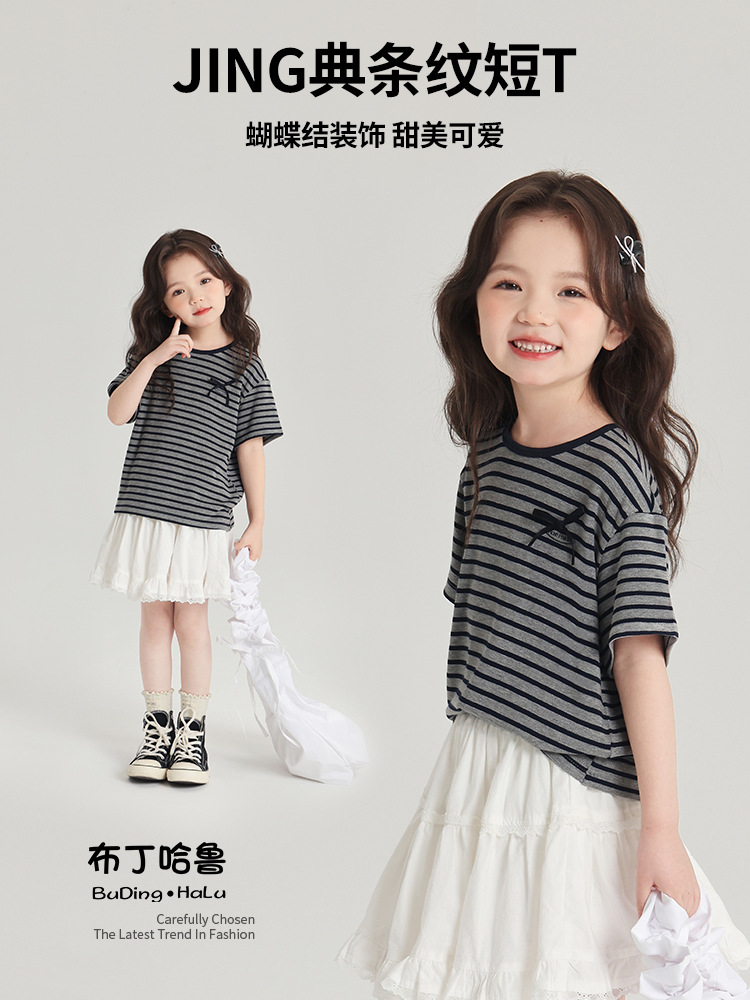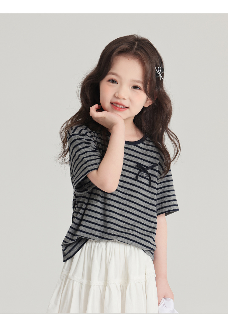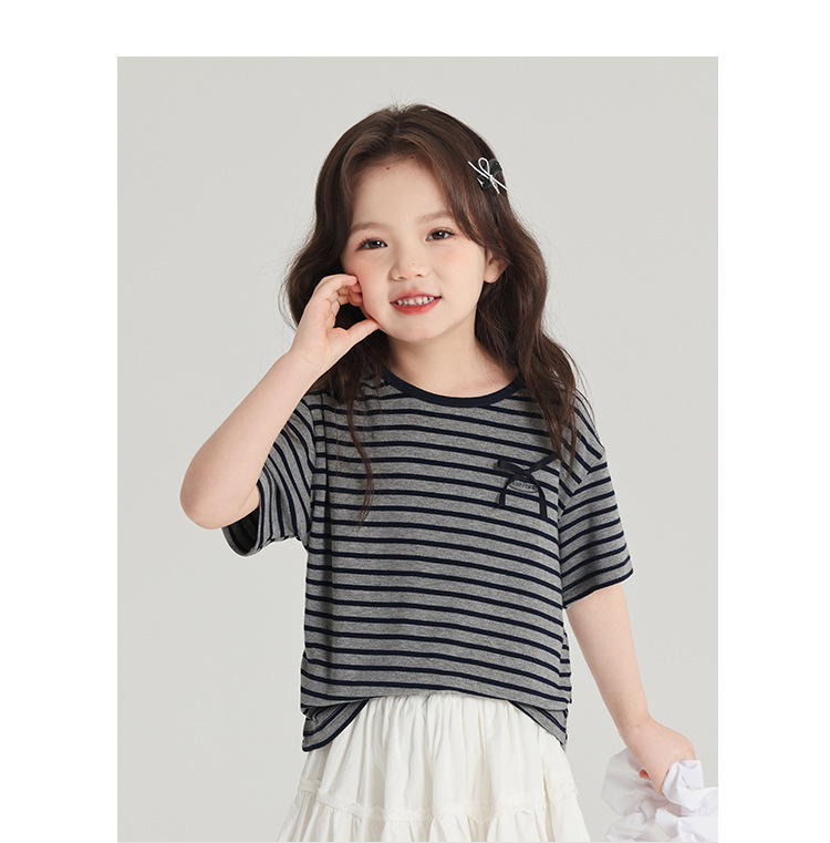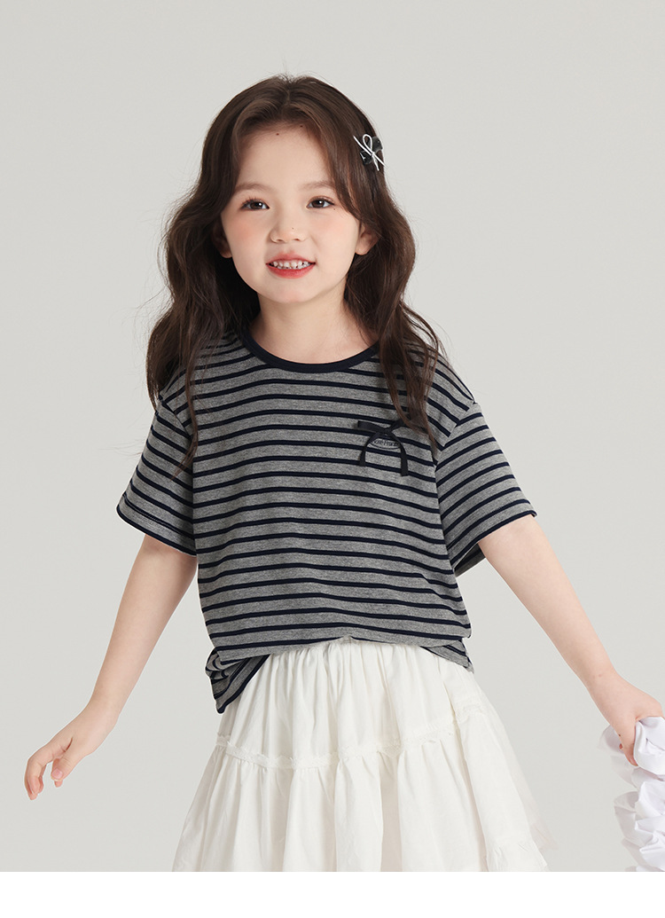 푸딩하루 아동복 티셔츠 2026 신상 여아 리본 스트라이프 반팔 티셔츠 귀엽고 다용도로 활용 가능한 라운드넥 반팔 상의