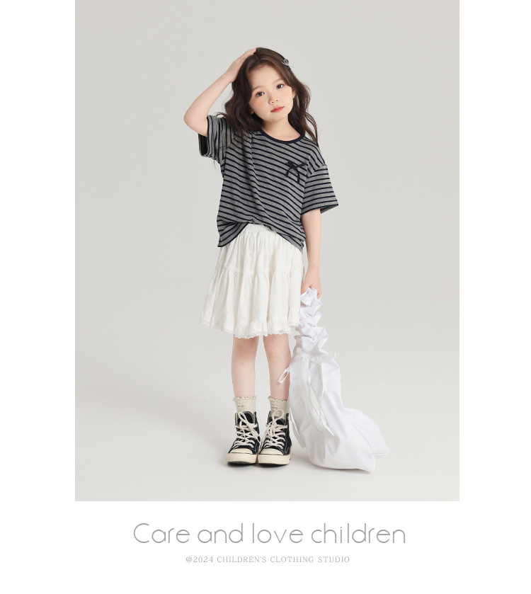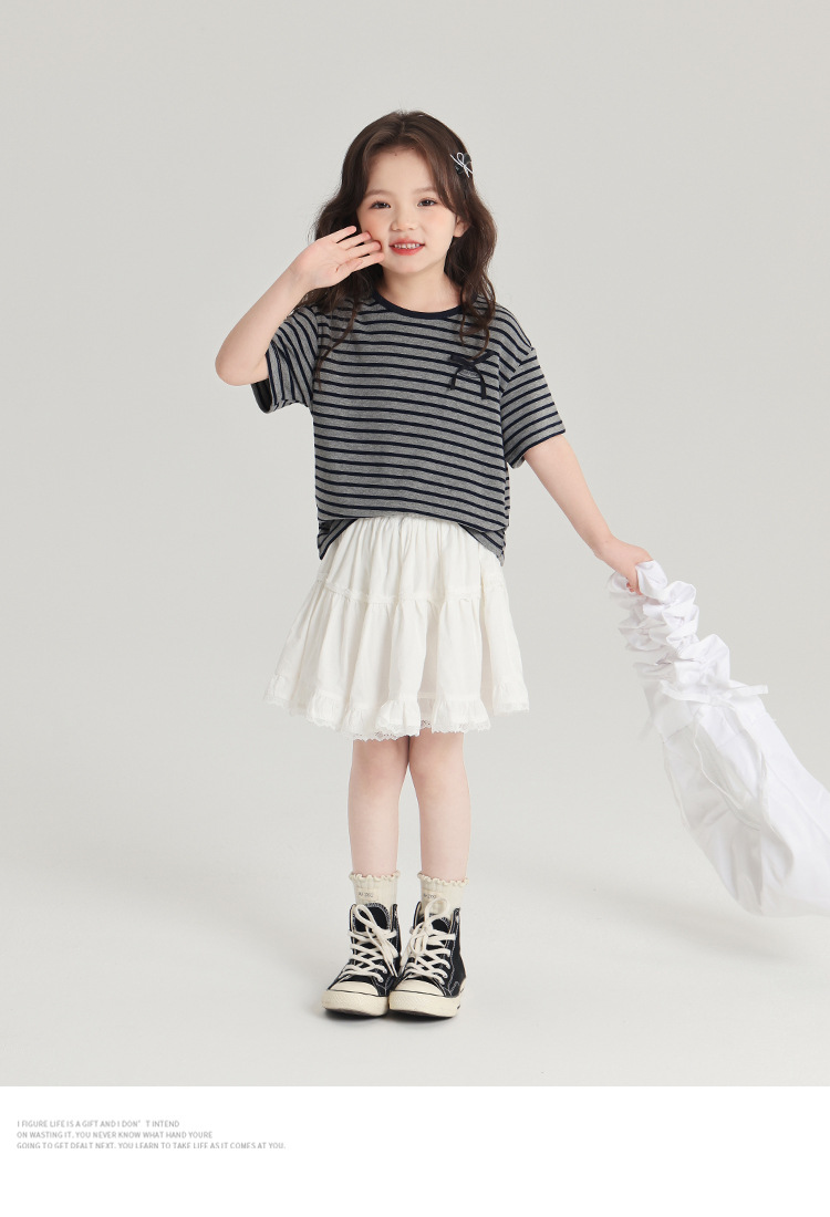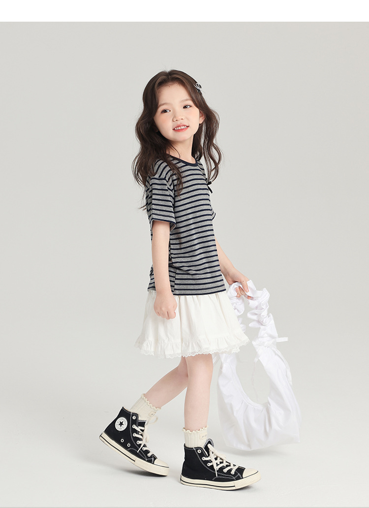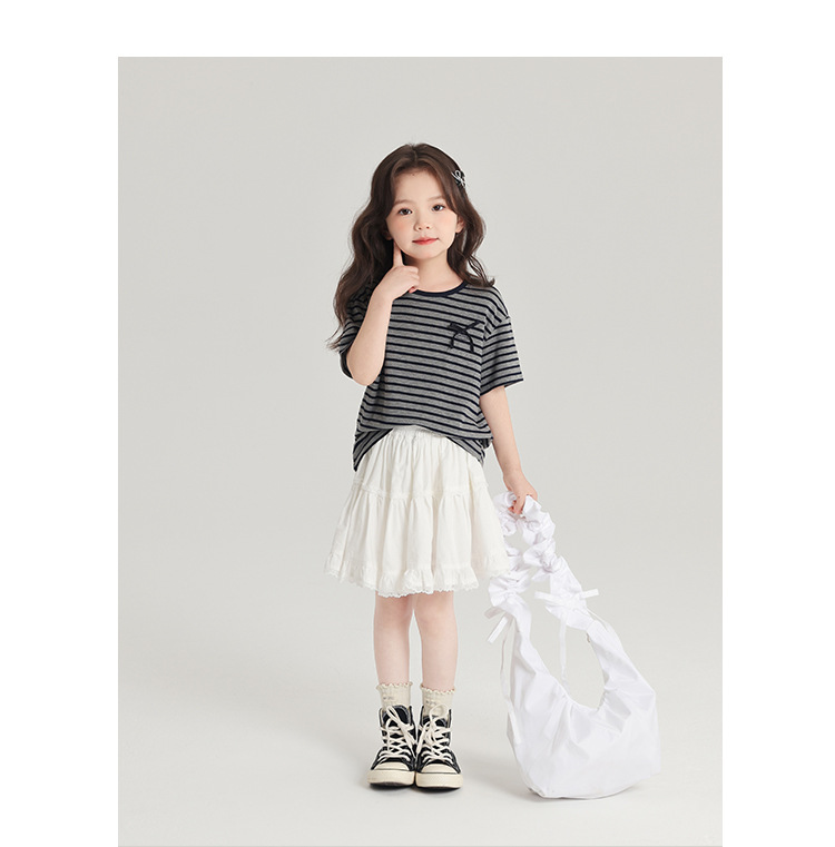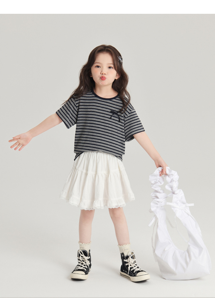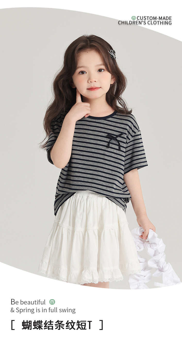 푸딩하루 아동복 티셔츠 2026 신상 여아 리본 스트라이프 반팔 티셔츠 귀엽고 다용도로 활용 가능한 라운드넥 반팔 상의