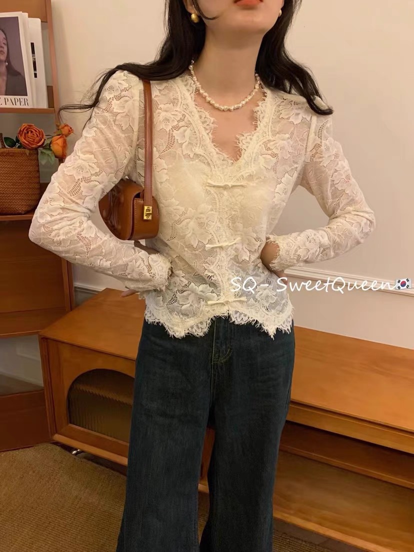 SQ 긴 소매 레이스베이스 셔츠 여성용 긴 소매 셔츠 디자인 센스 틈새 우아한 13 라인 여성의 2023 가을 탑