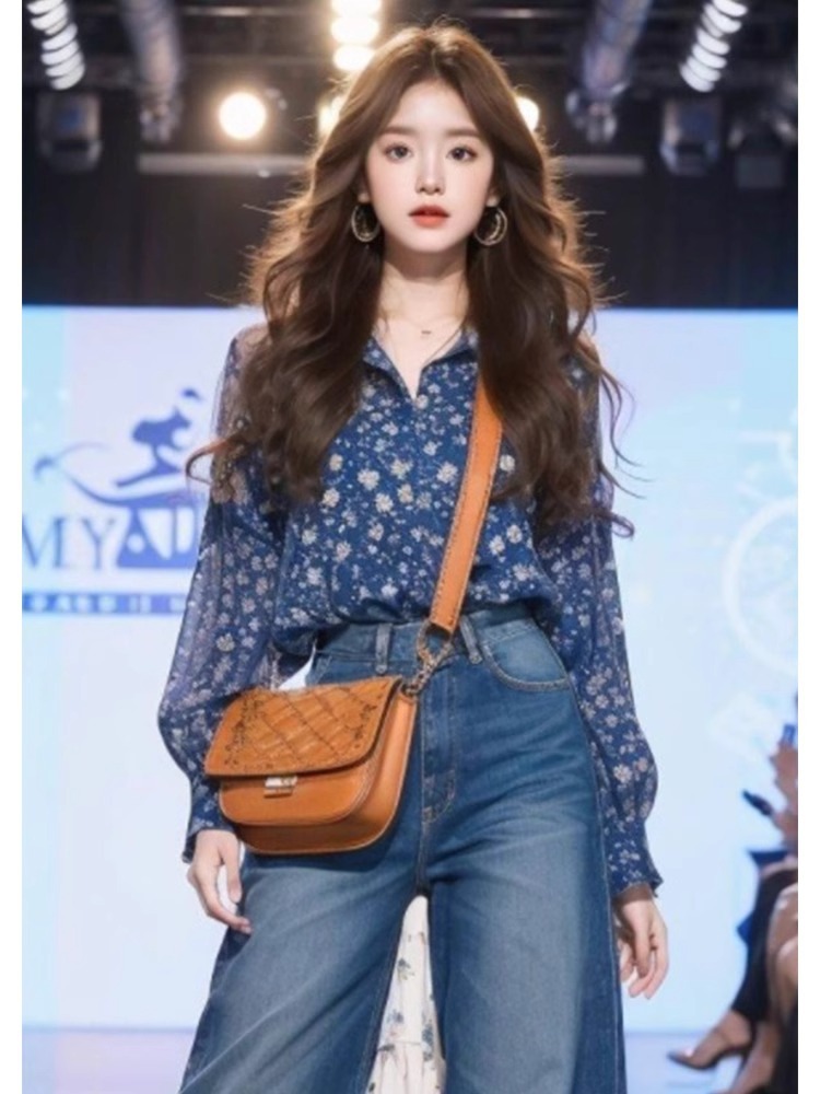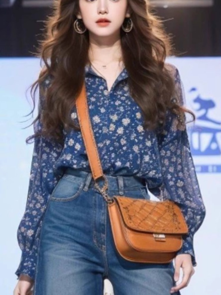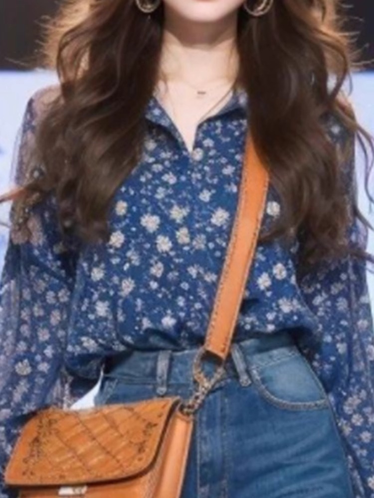 2025 한국 스타일 여름 착용 디자인 센스 슬림 탑 아름다운 우아한 파란색 인쇄 쉬폰 셔츠 새로운 여성스토어 가기