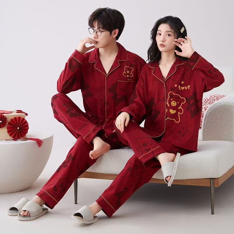 커플 잠옷 레드 코튼 2025 봄, 가을 긴팔 여성 봄, 가을 결혼식 남성의 결혼식 새해 홈웨어스토어 가기