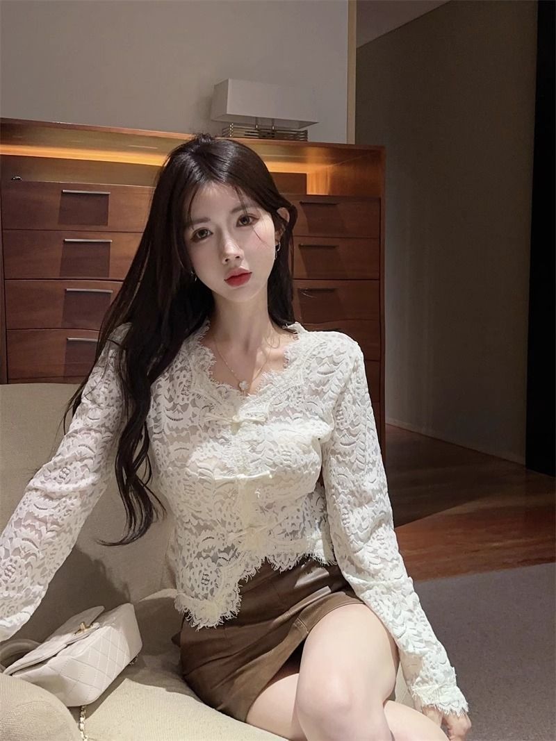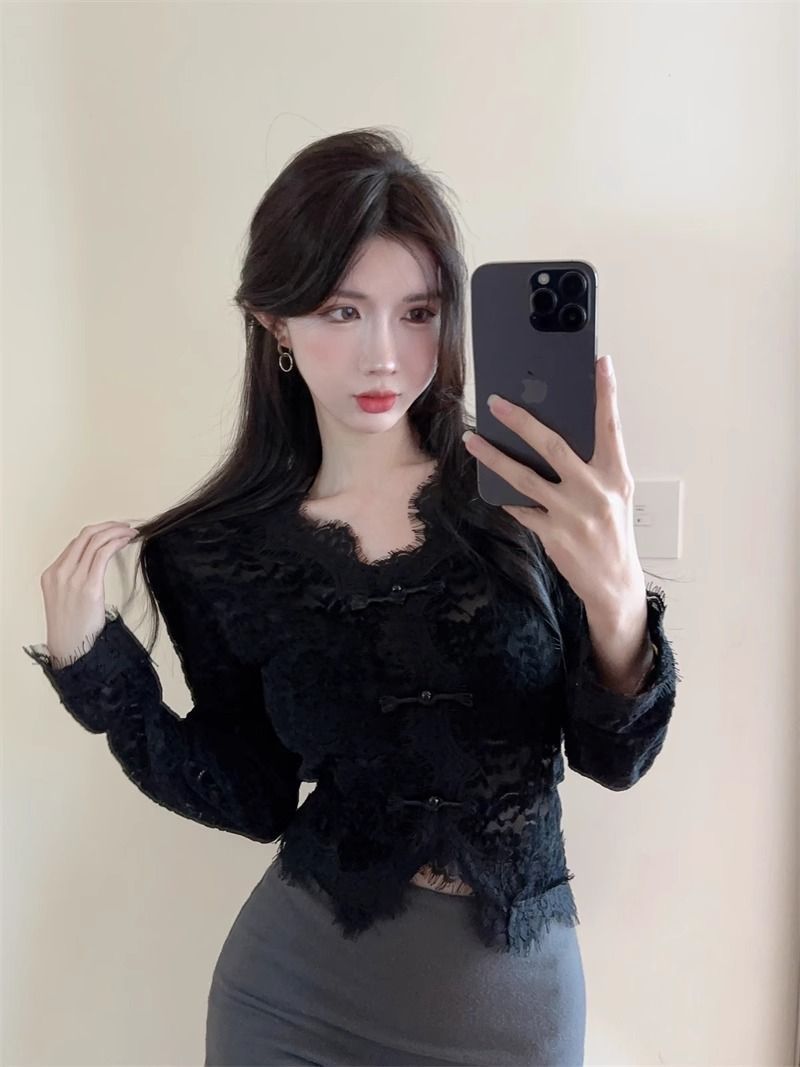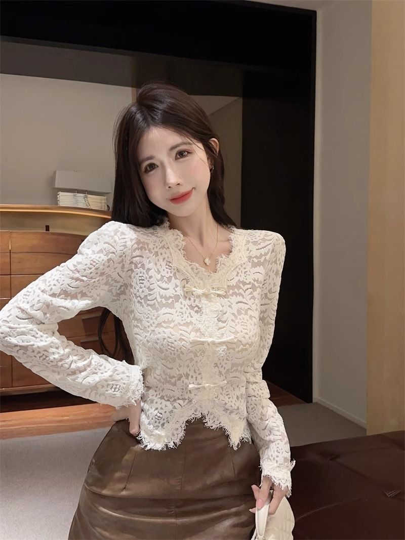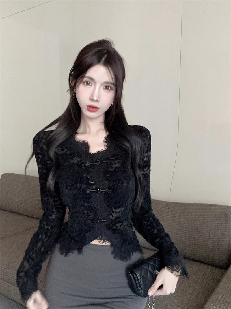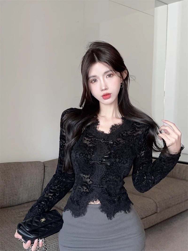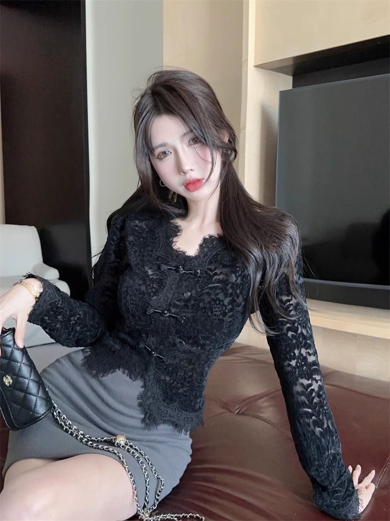새로운 중국 스타일 국가 스타일 버클 탑 여자 겨울 샌딩 패킹 레이스 베이스 셔츠 프랑스 코트 섹시한 셔츠