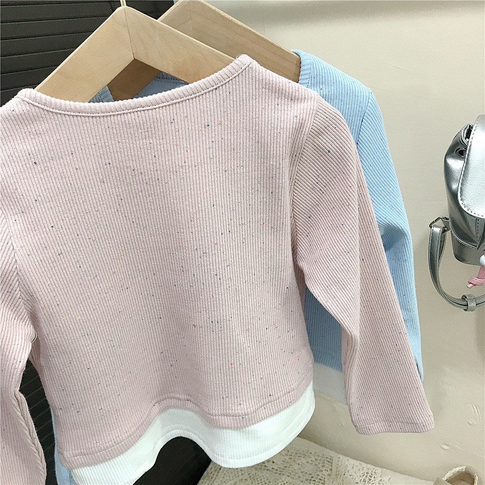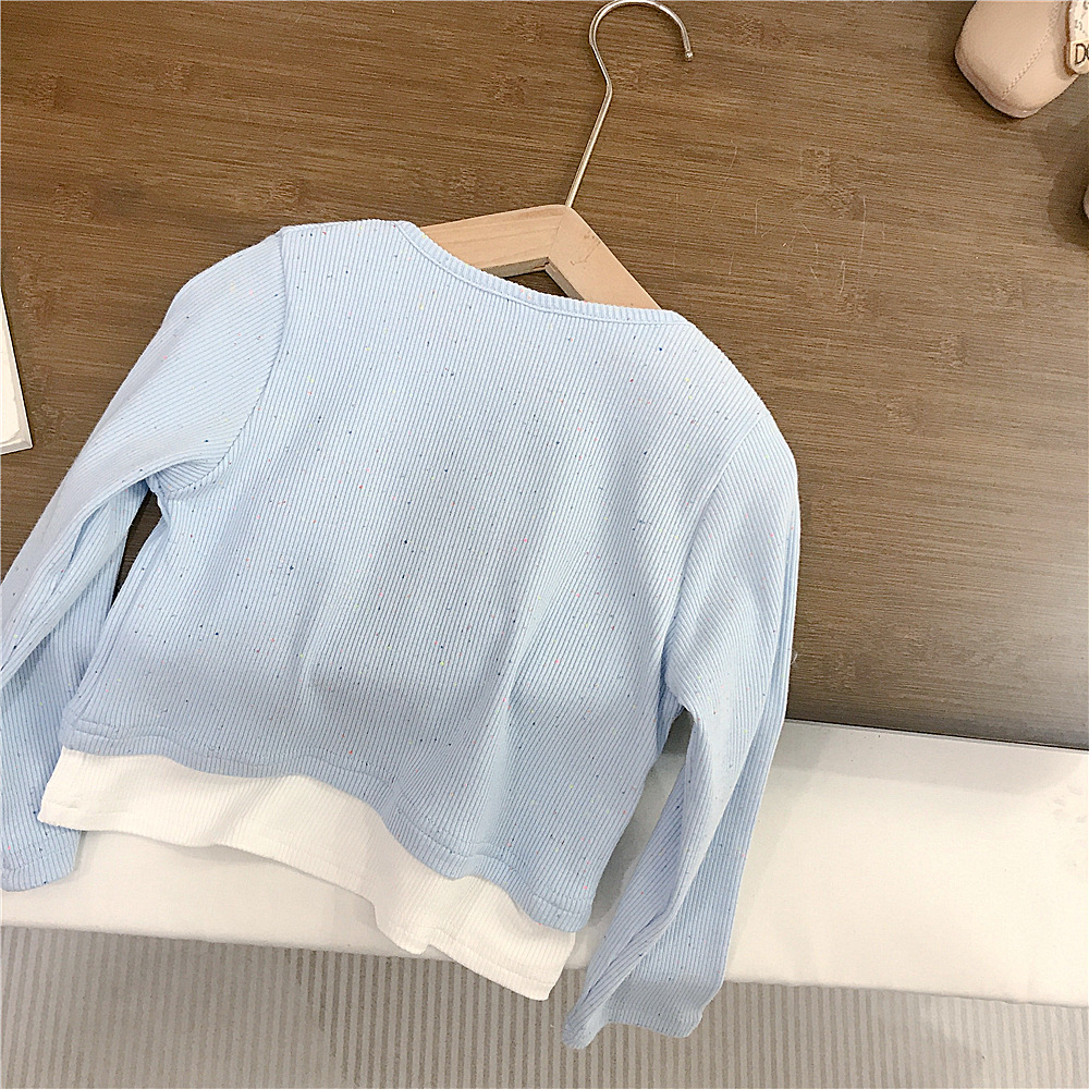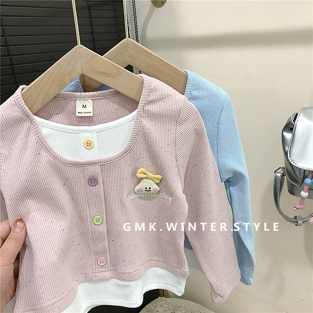 소녀 긴팔 티셔츠 2025 봄과 가을 새로운 어린이 가짜 투피스 기본 옷 아기의 슬림 핏 슬리밍 카디건 옷스토어 가기