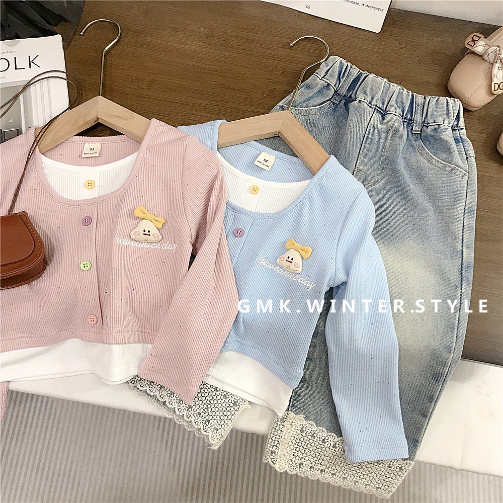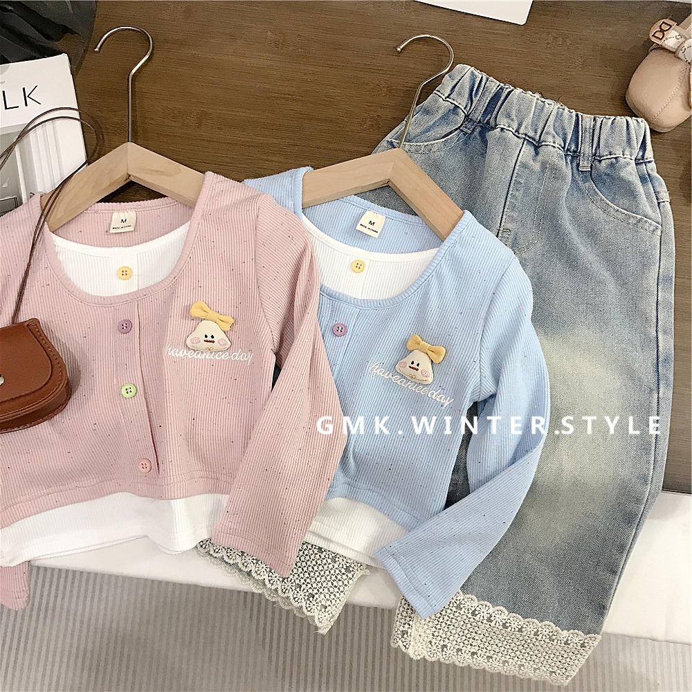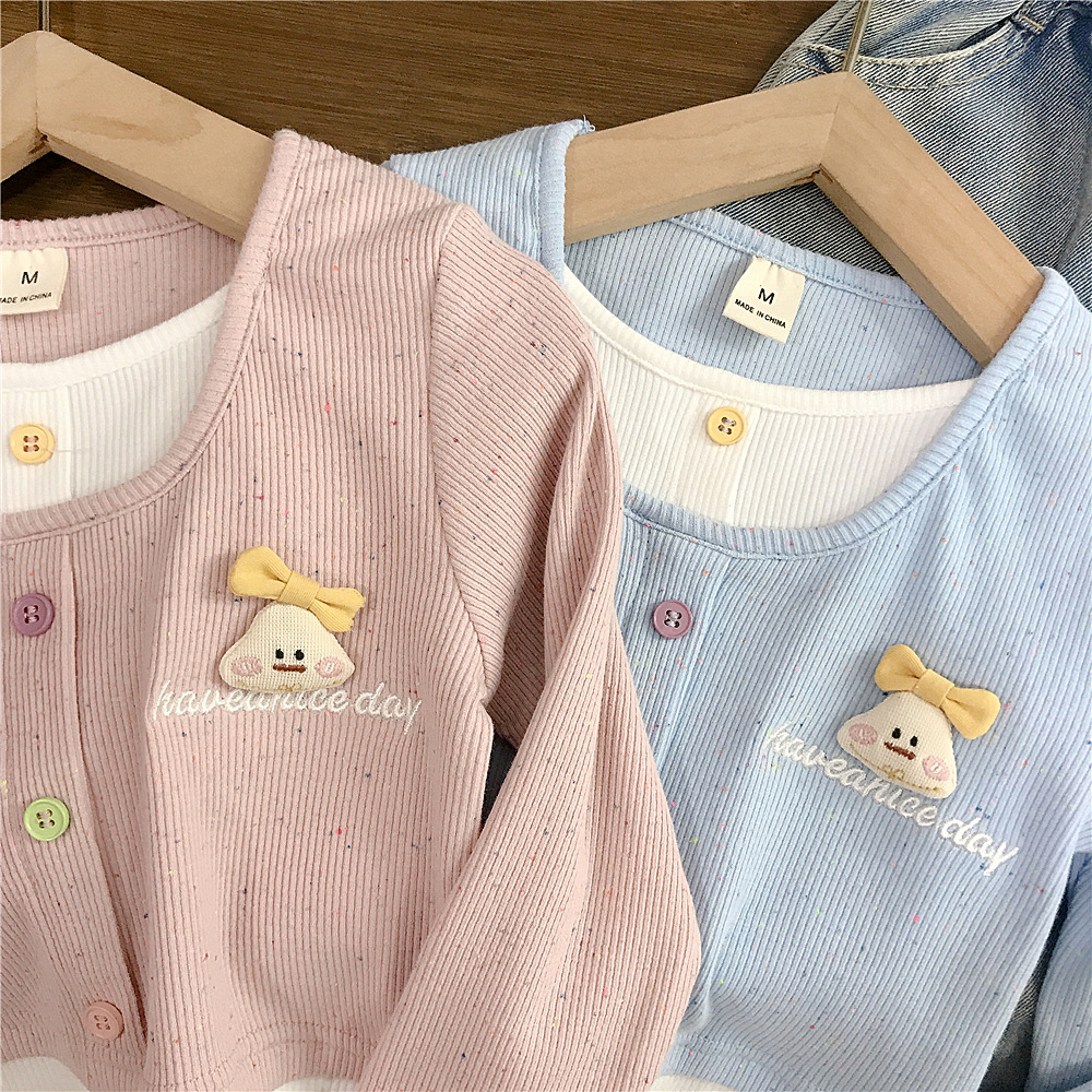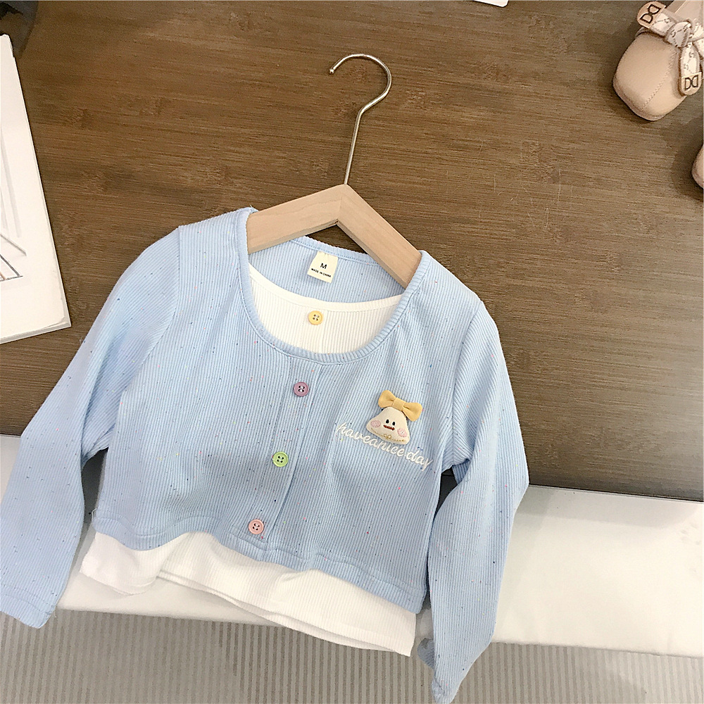 소녀 긴팔 티셔츠 2025 봄과 가을 새로운 어린이 가짜 투피스 기본 옷 아기의 슬림 핏 슬리밍 카디건 옷스토어 가기
