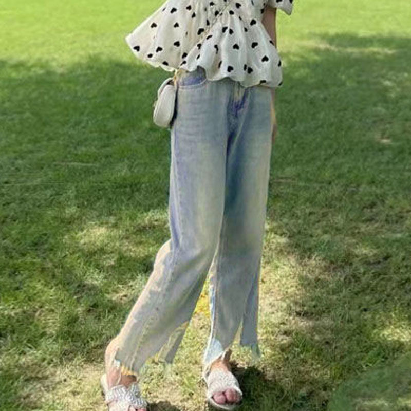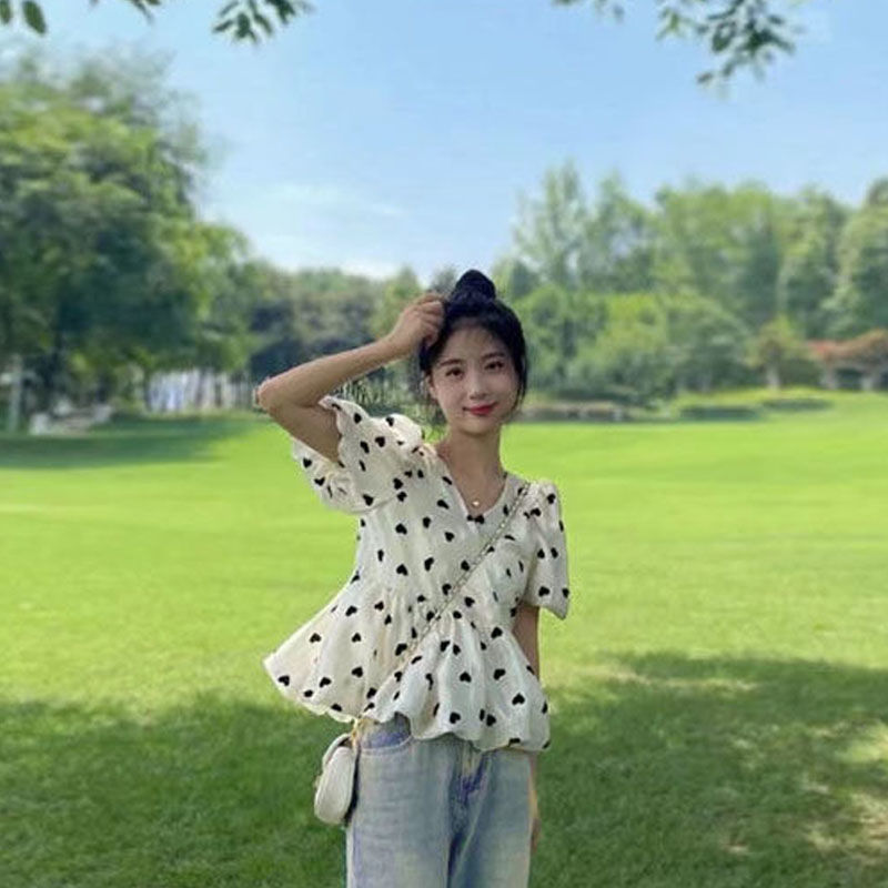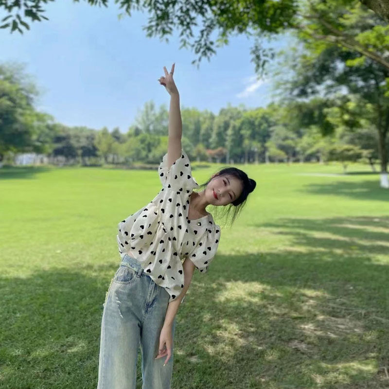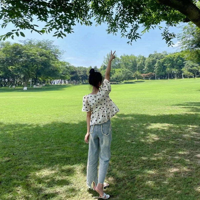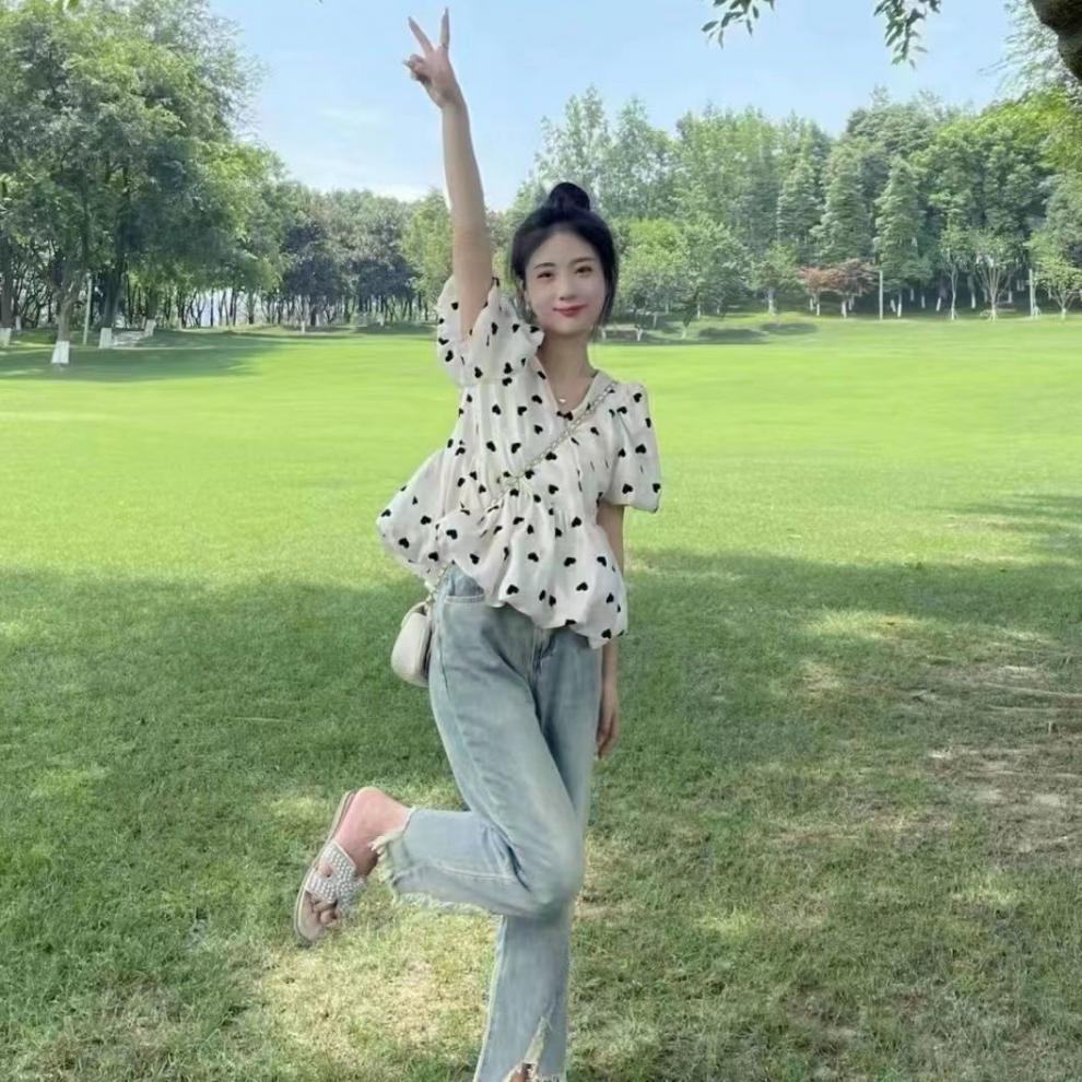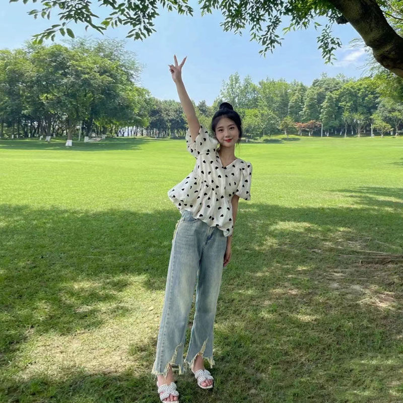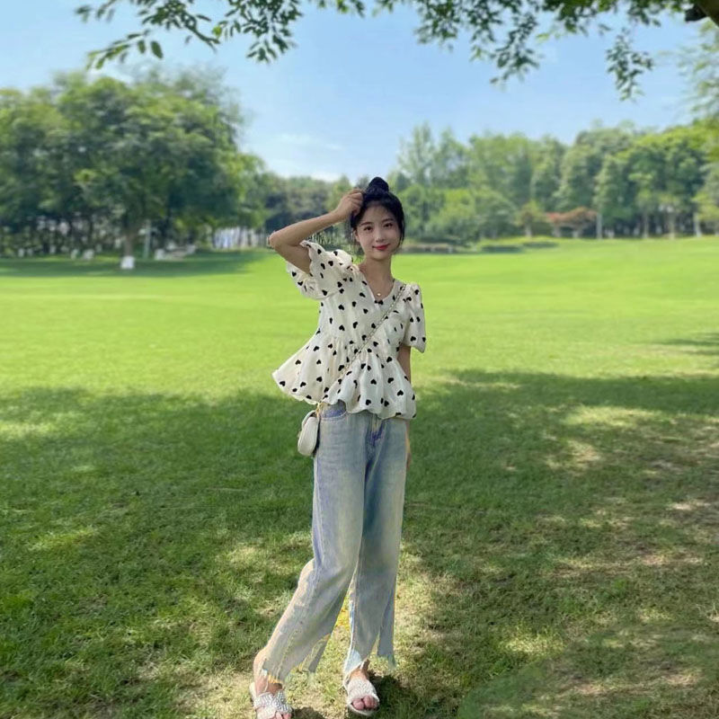 솔트 스타일은 2025 년 여름 새로운 버블 슬리브 쉬폰 셔츠 세트 버 청바지 느슨한 슬림스토어 가기