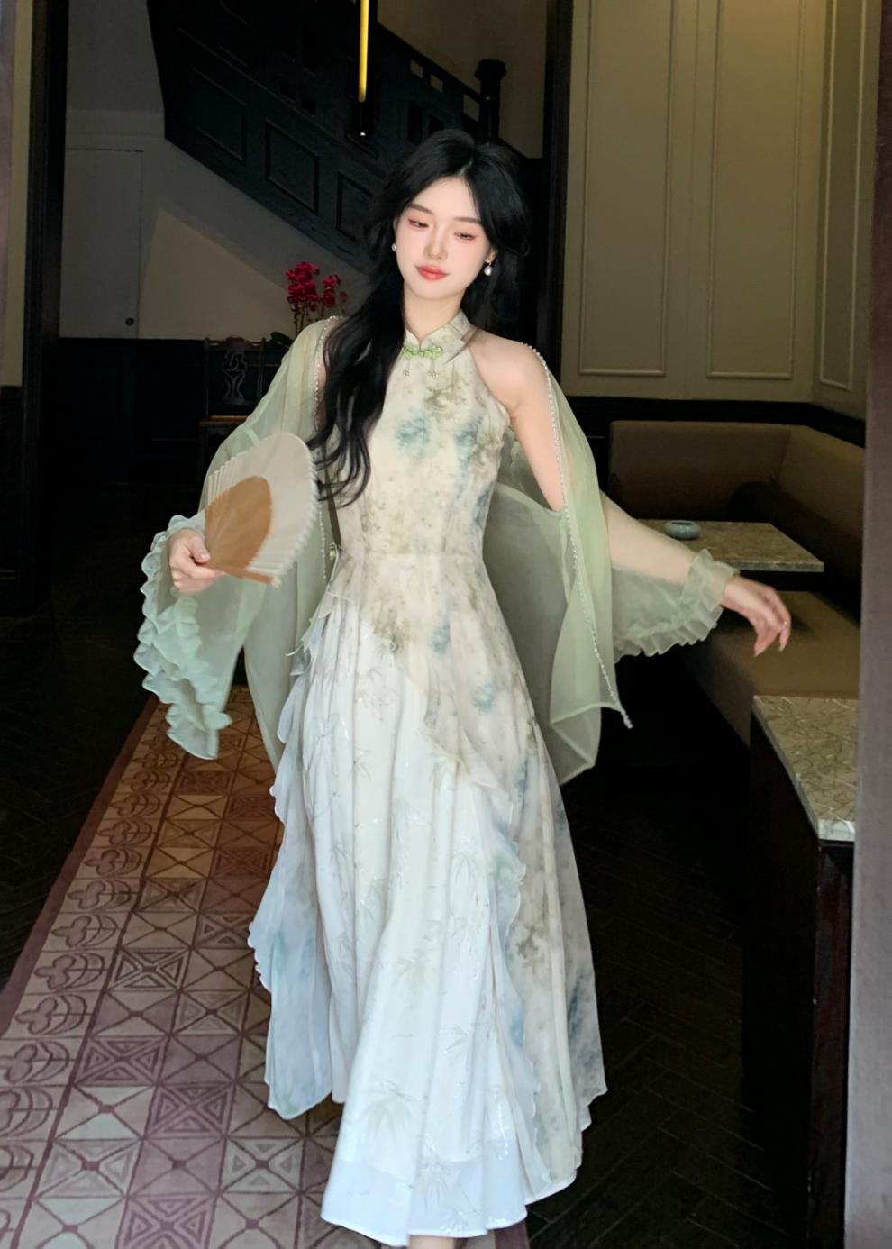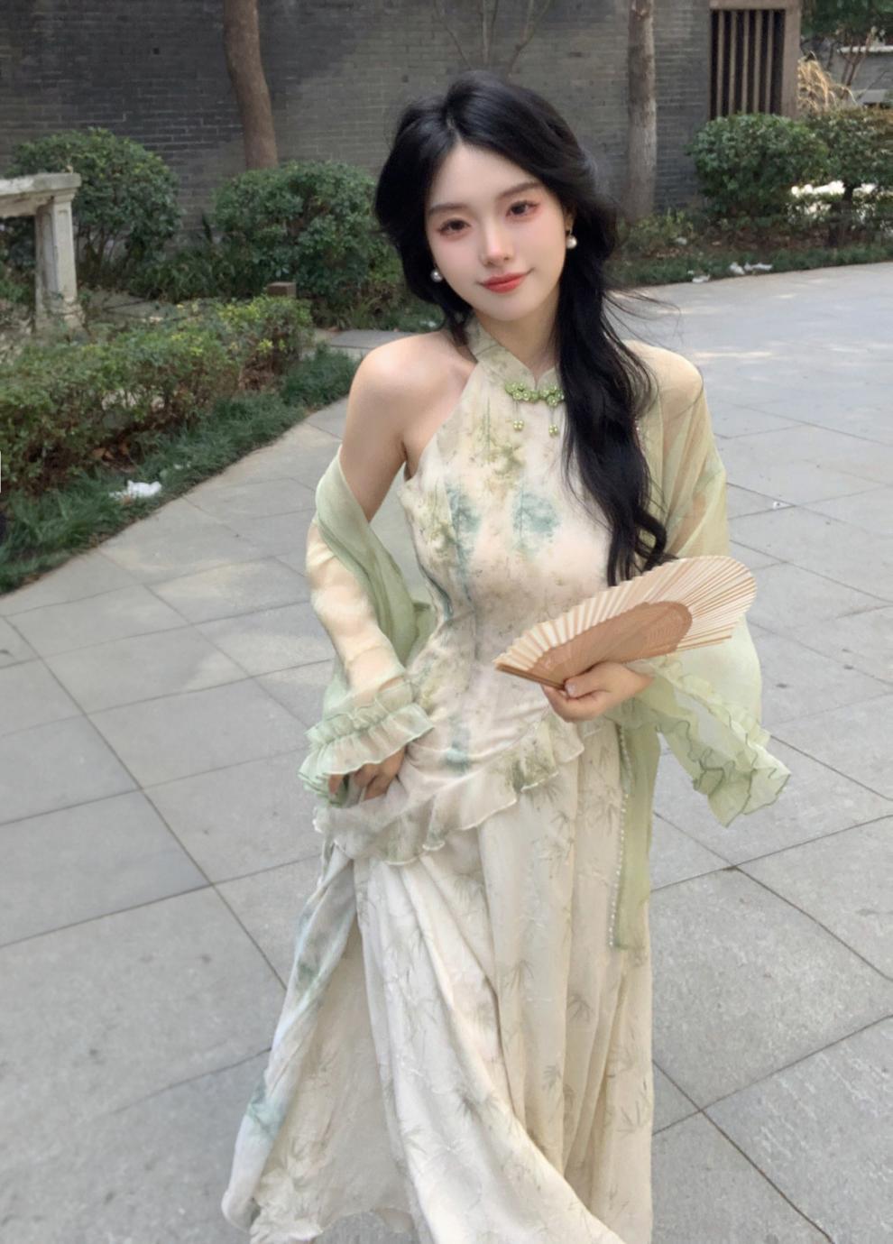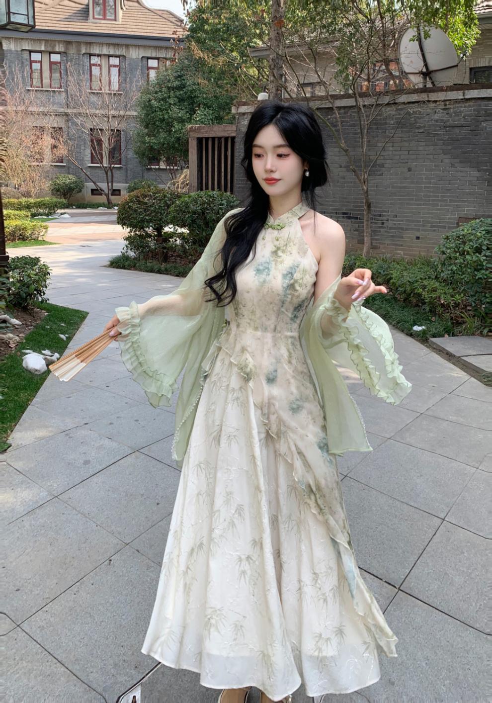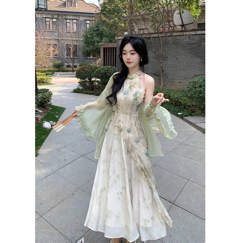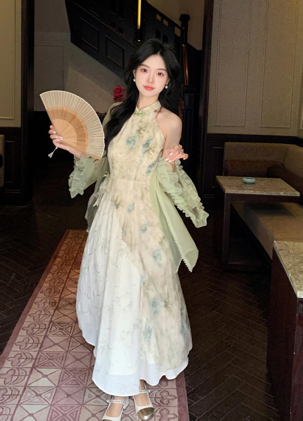 [칭칭 지진] 신선한 카디건 인쇄 스티칭 불규칙한 모리 교수형 목 원피스 고기 패션 세트스토어 가기