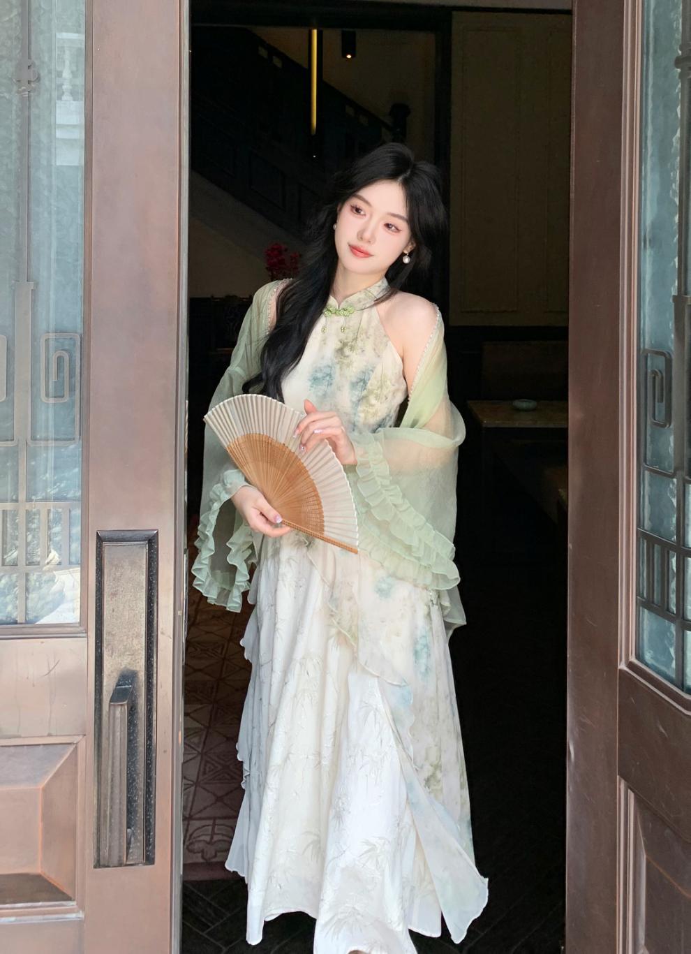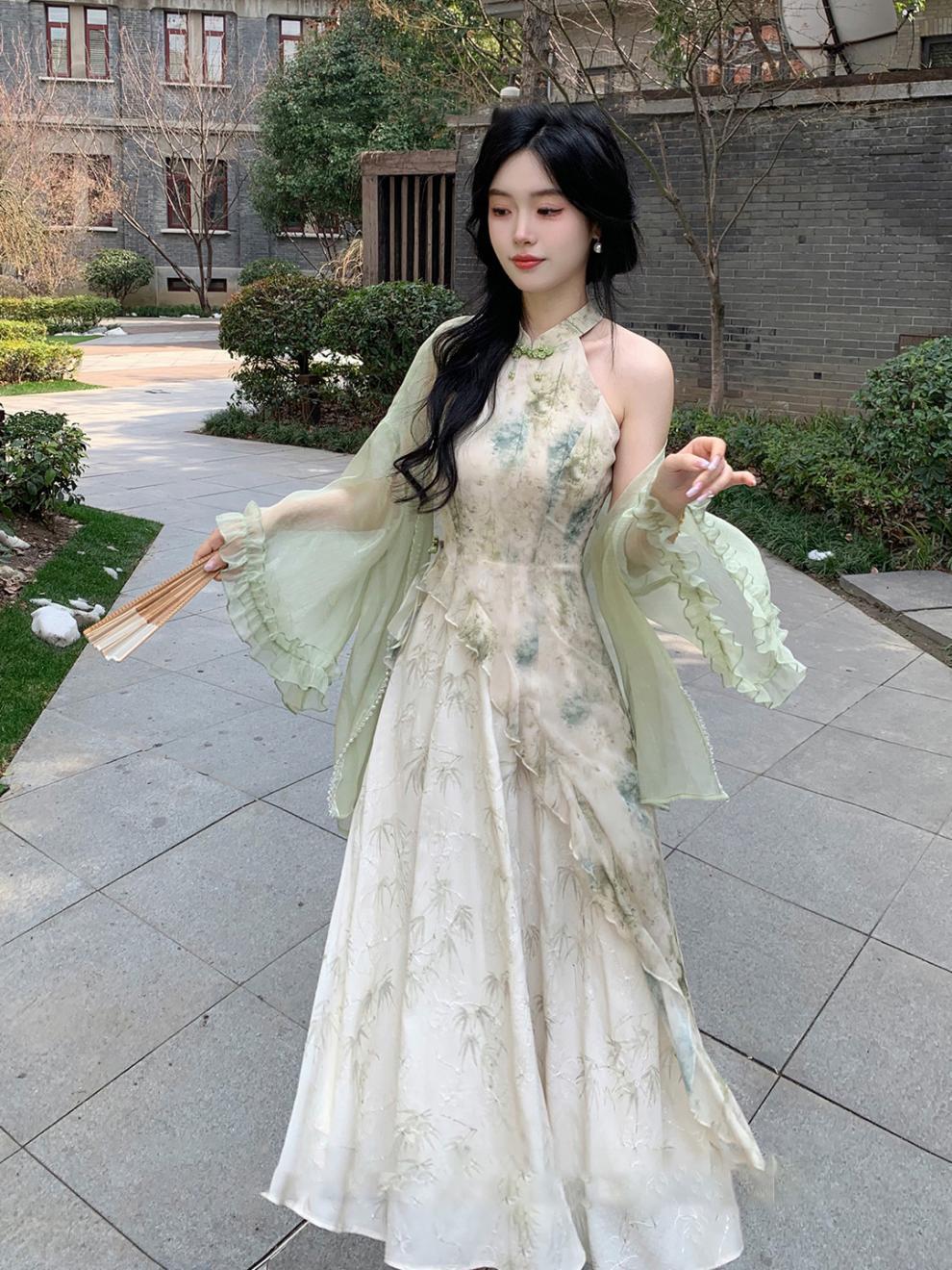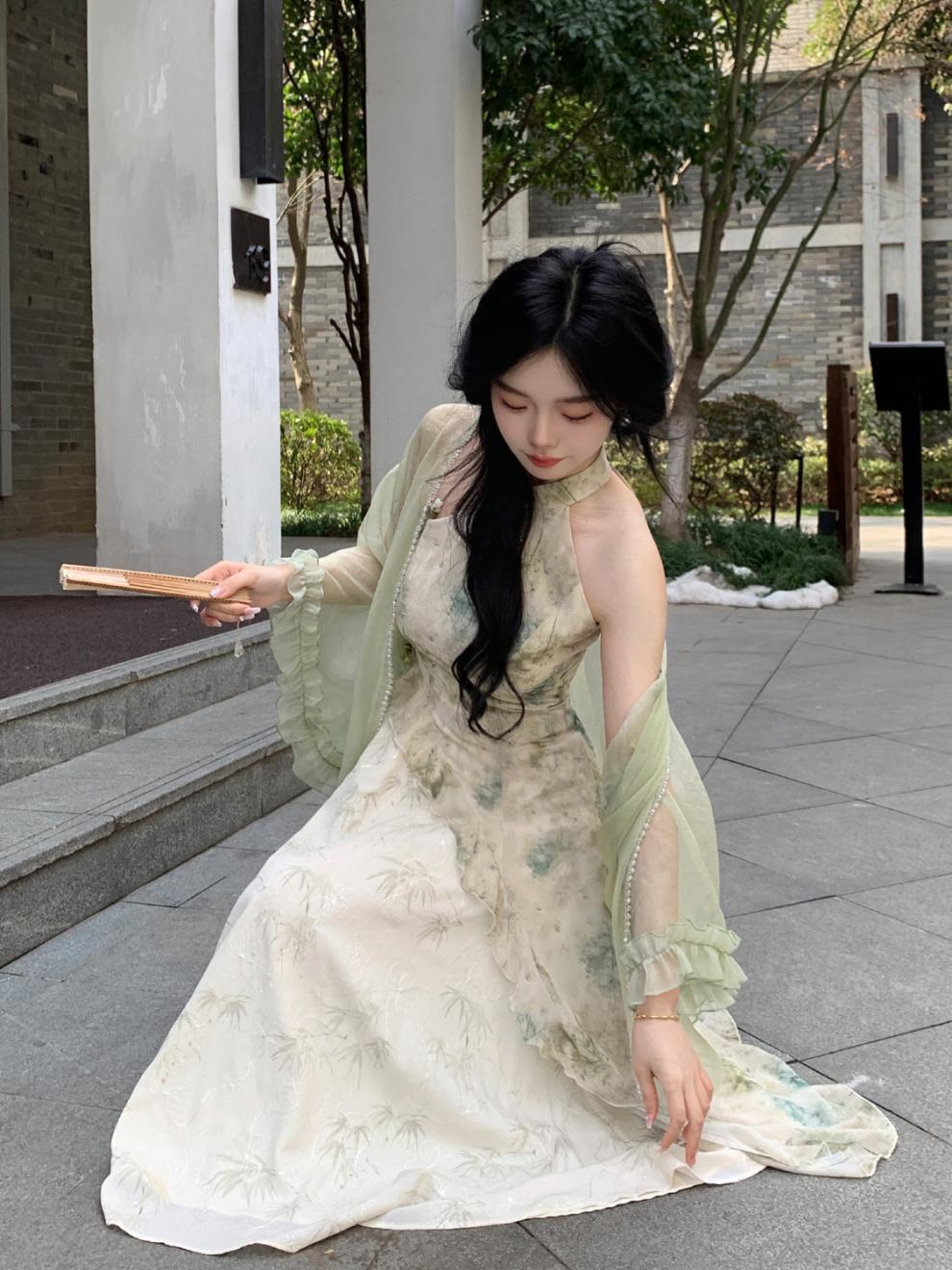 [칭칭 지진] 신선한 카디건 인쇄 스티칭 불규칙한 모리 교수형 목 원피스 고기 패션 세트