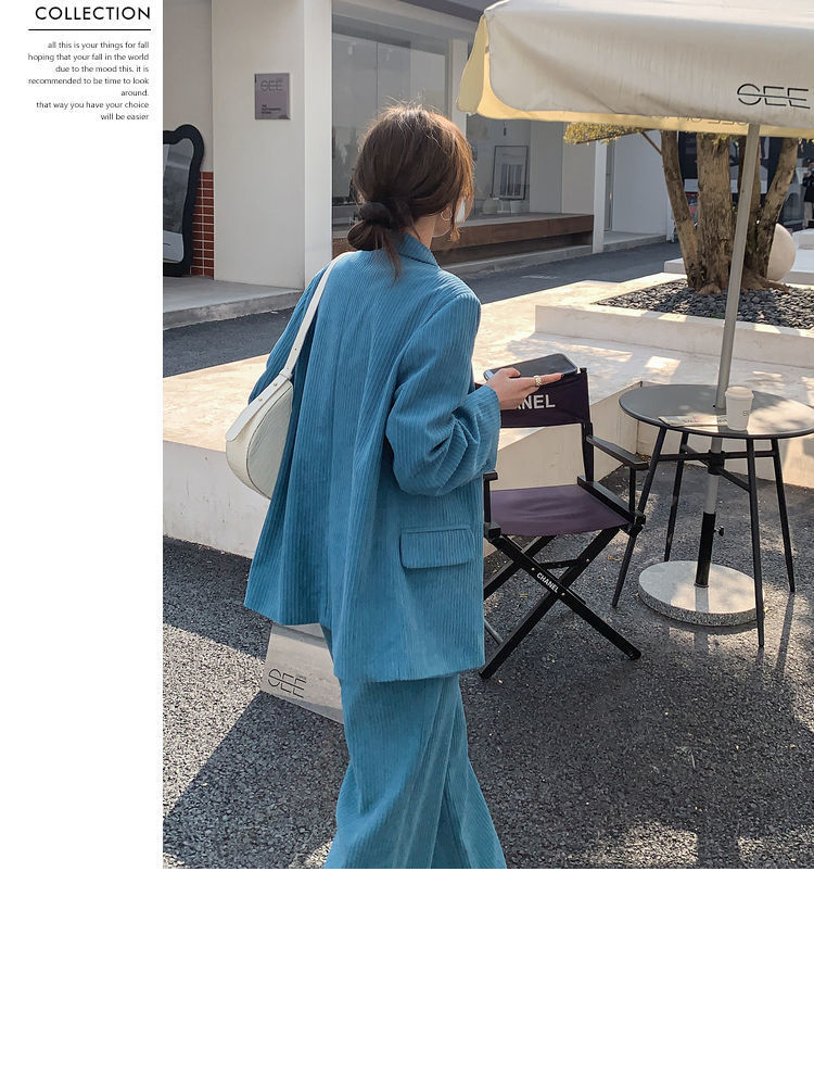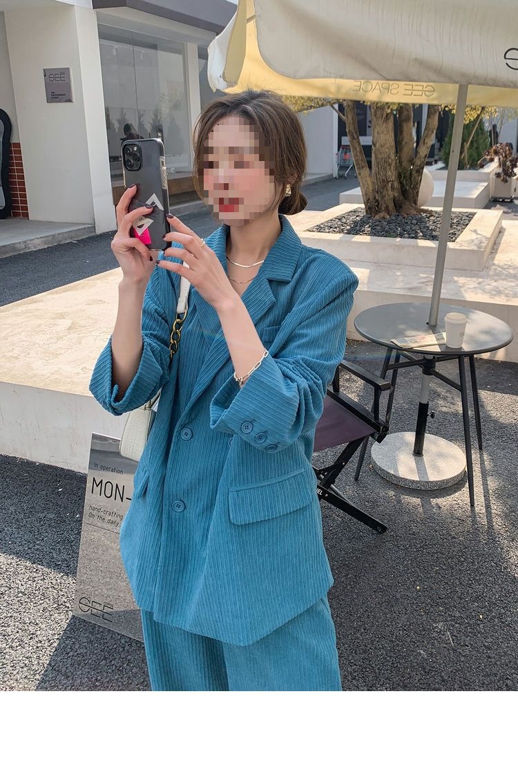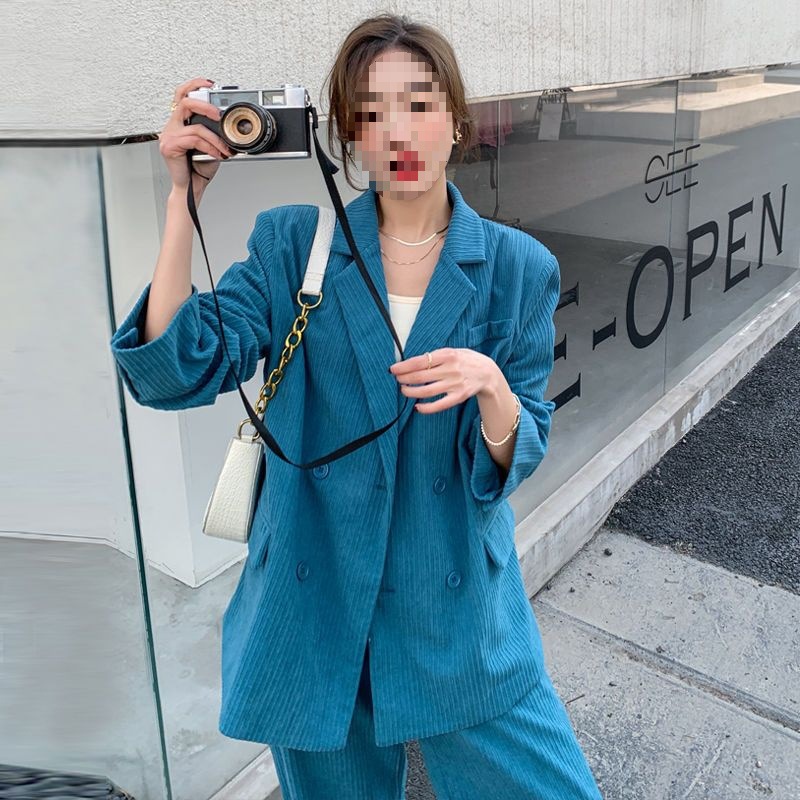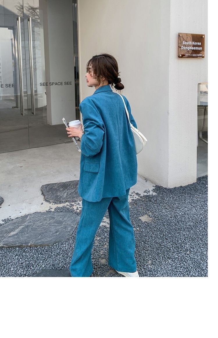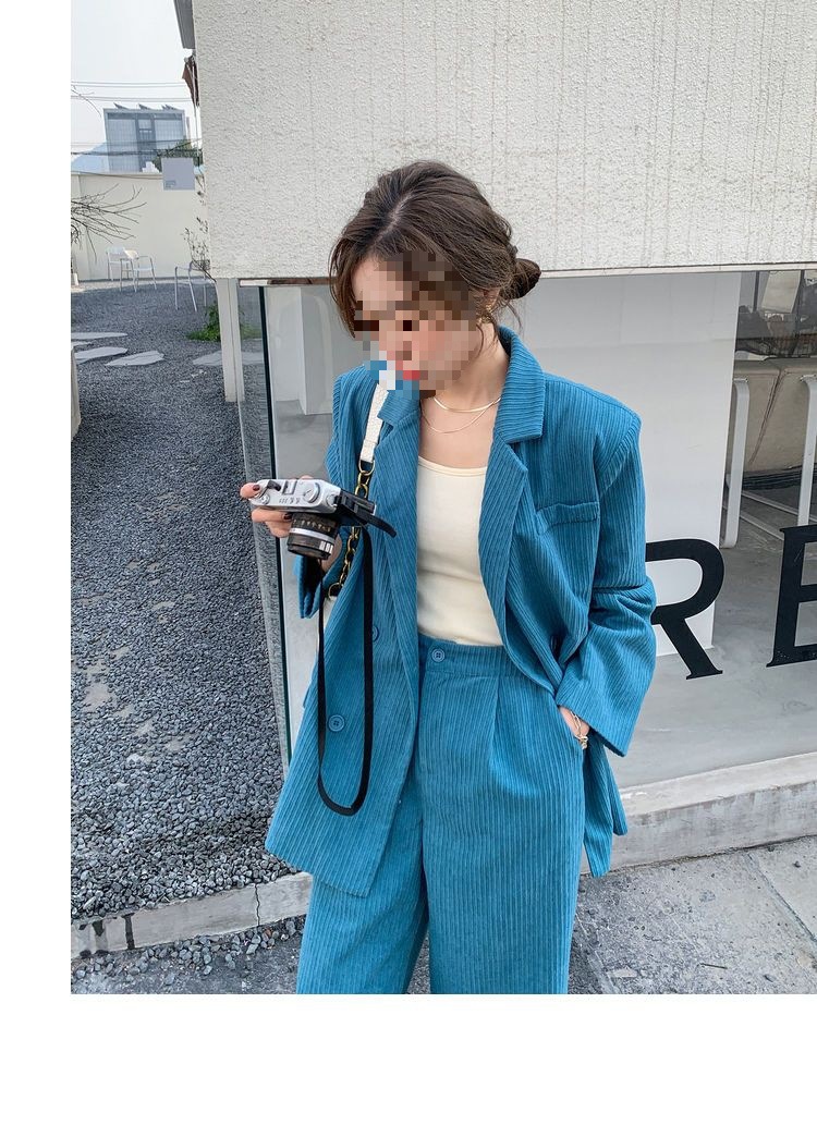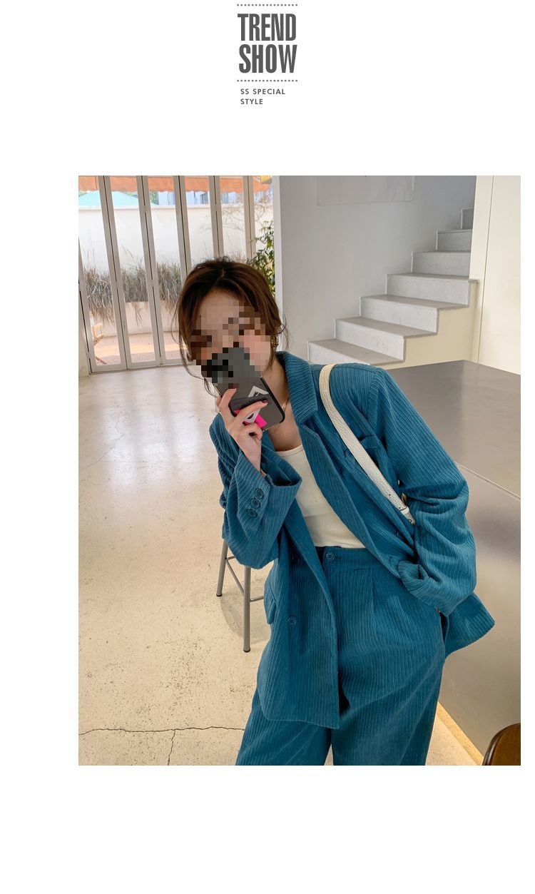 블루 코듀로이 세트 세트 여성 한국식 느슨한 가을 새로운 캐주얼 폭발성 세트 투피스 유행 세트