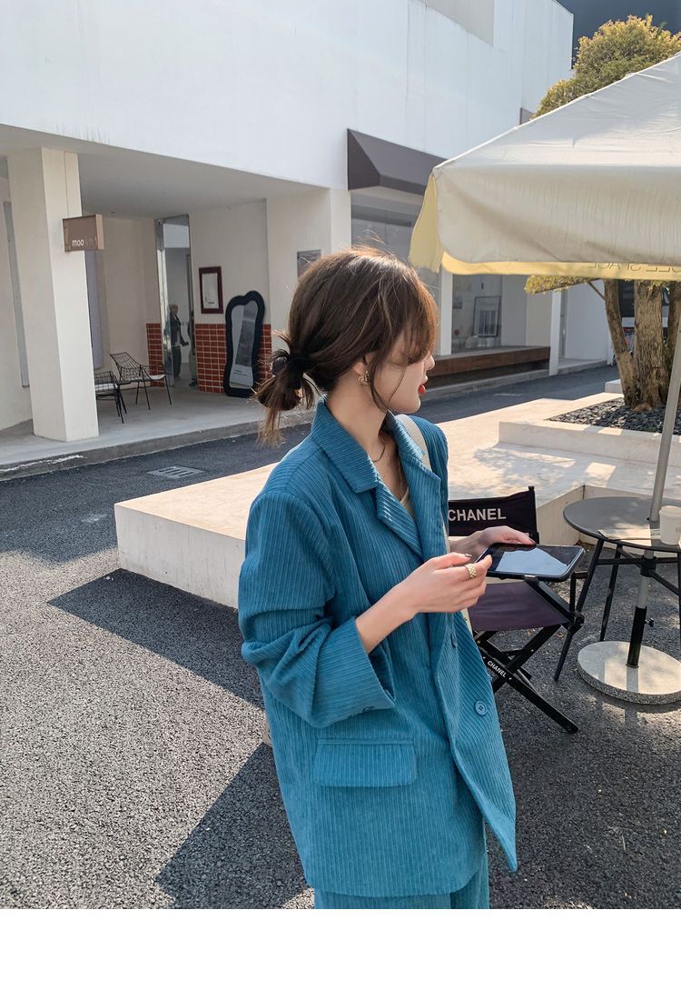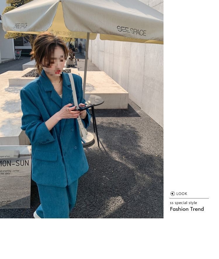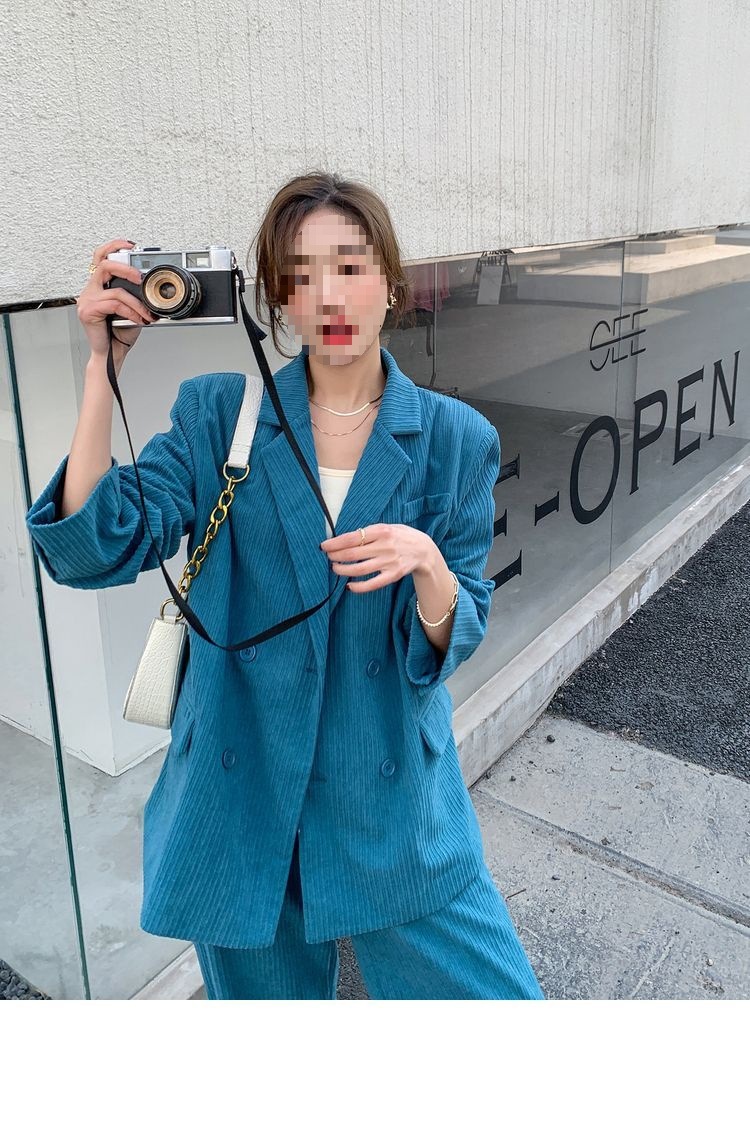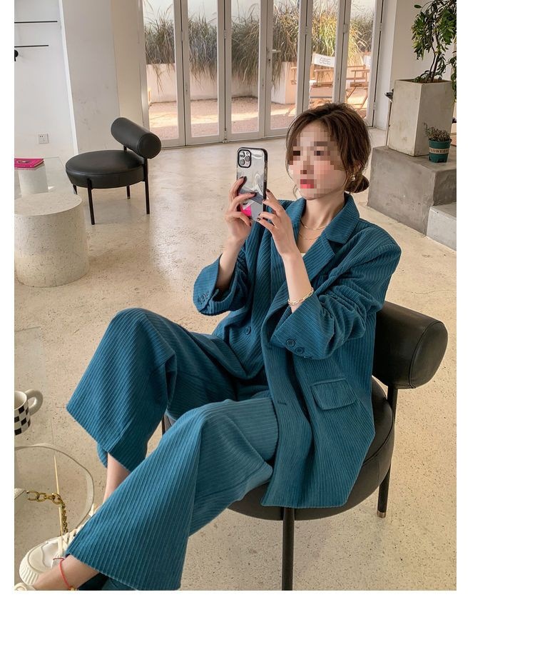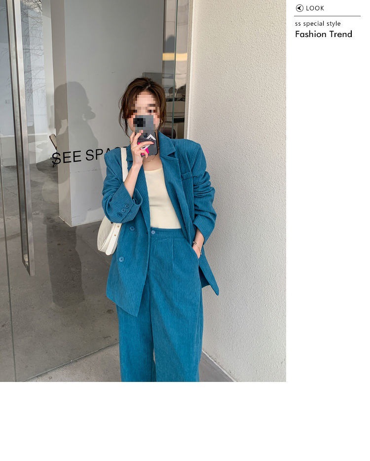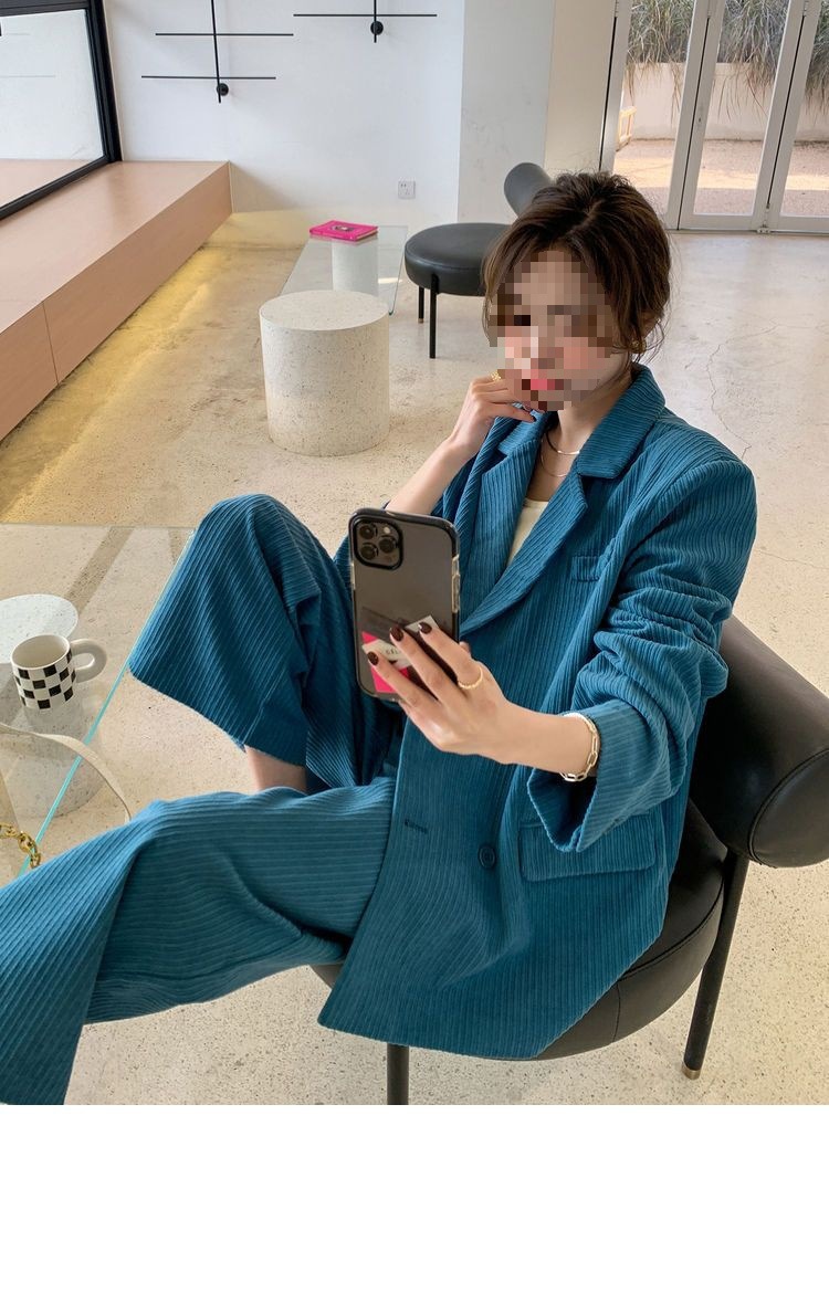 블루 코듀로이 세트 세트 여성 한국식 느슨한 가을 새로운 캐주얼 폭발성 세트 투피스 유행 세트