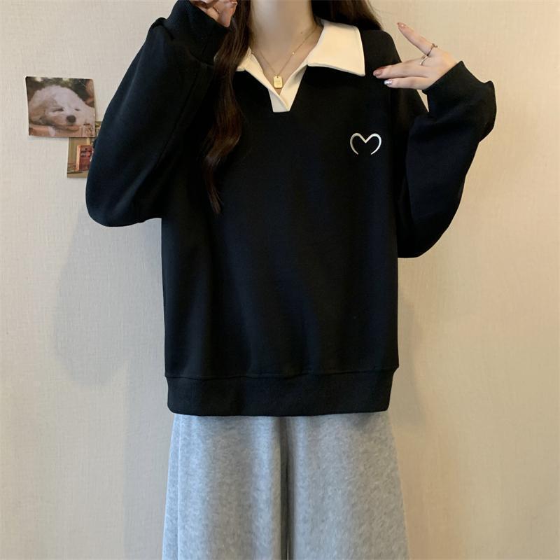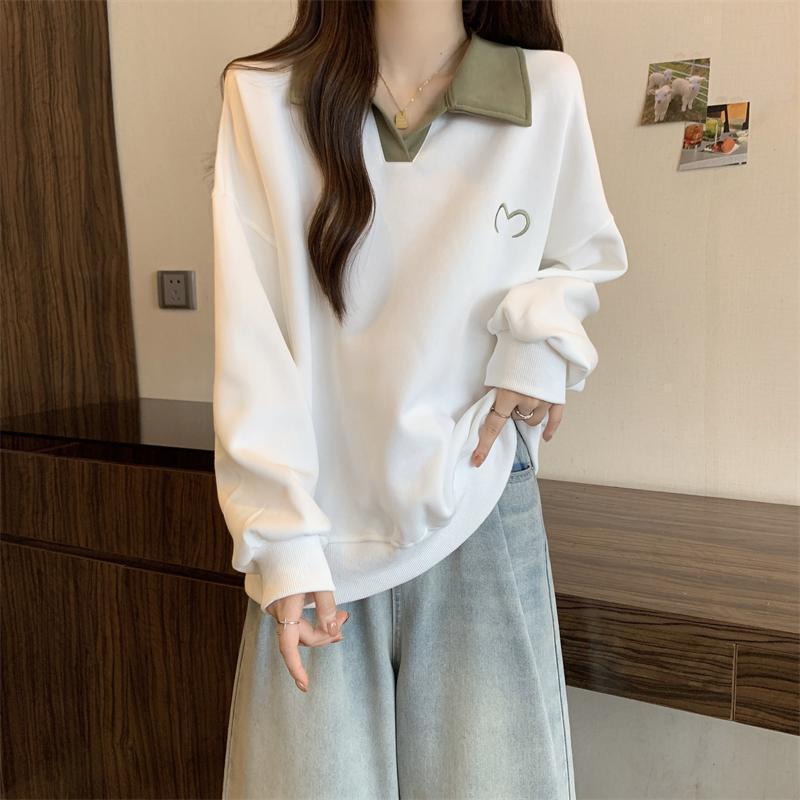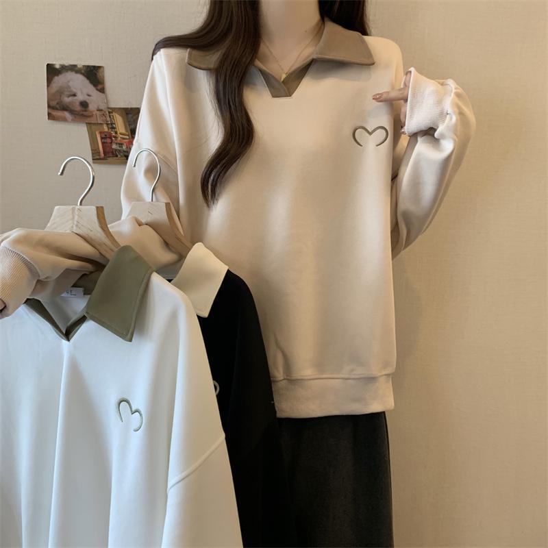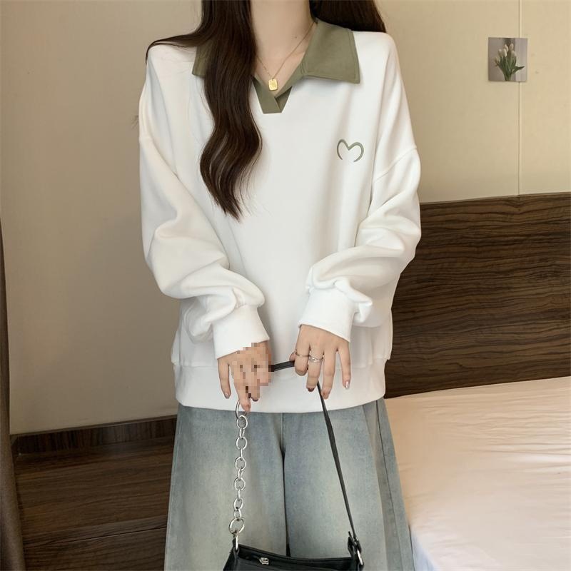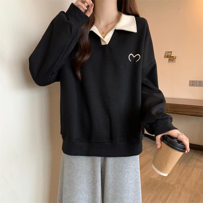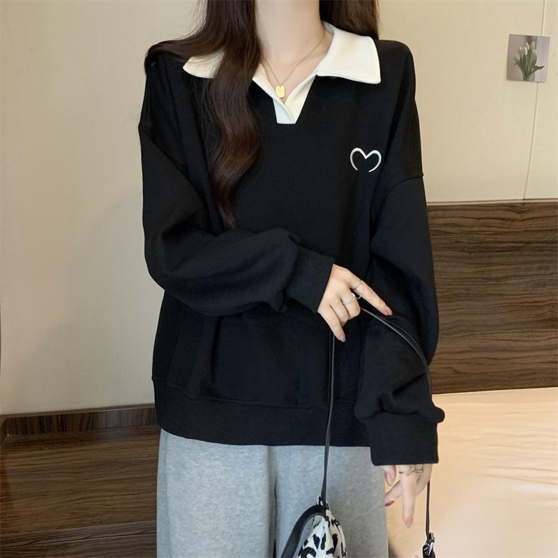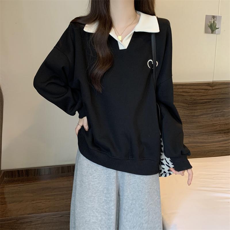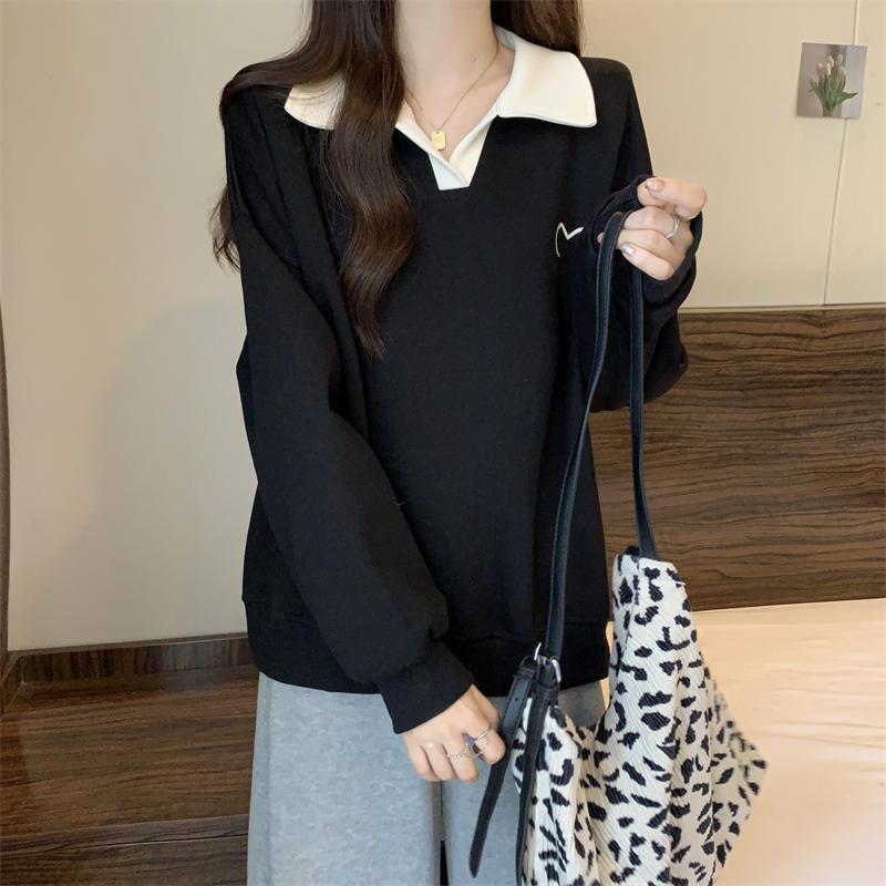 플러스 사이즈 여성 대비 폴로 칼라 스웨트 셔츠 여성의 가을 통통녀 슬리밍 느슨한 디자인 게으른 스타일 코트 탑스토어 가기