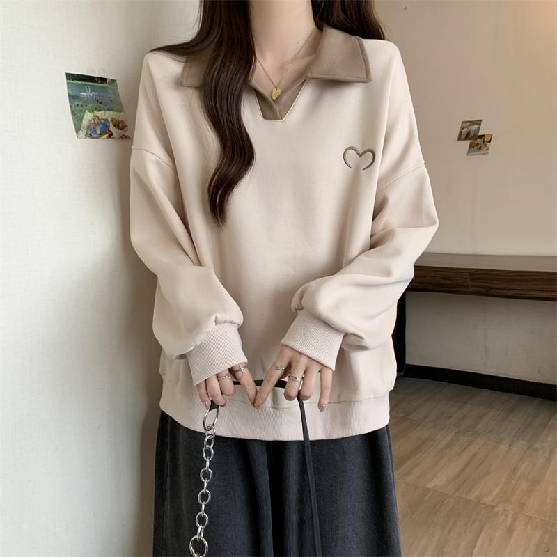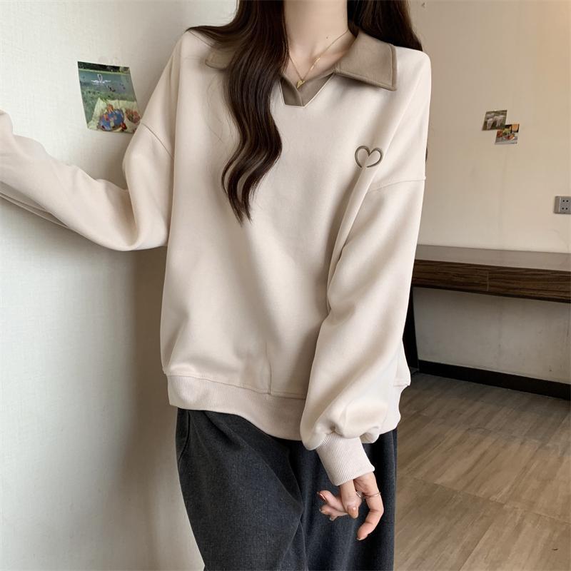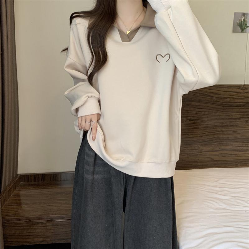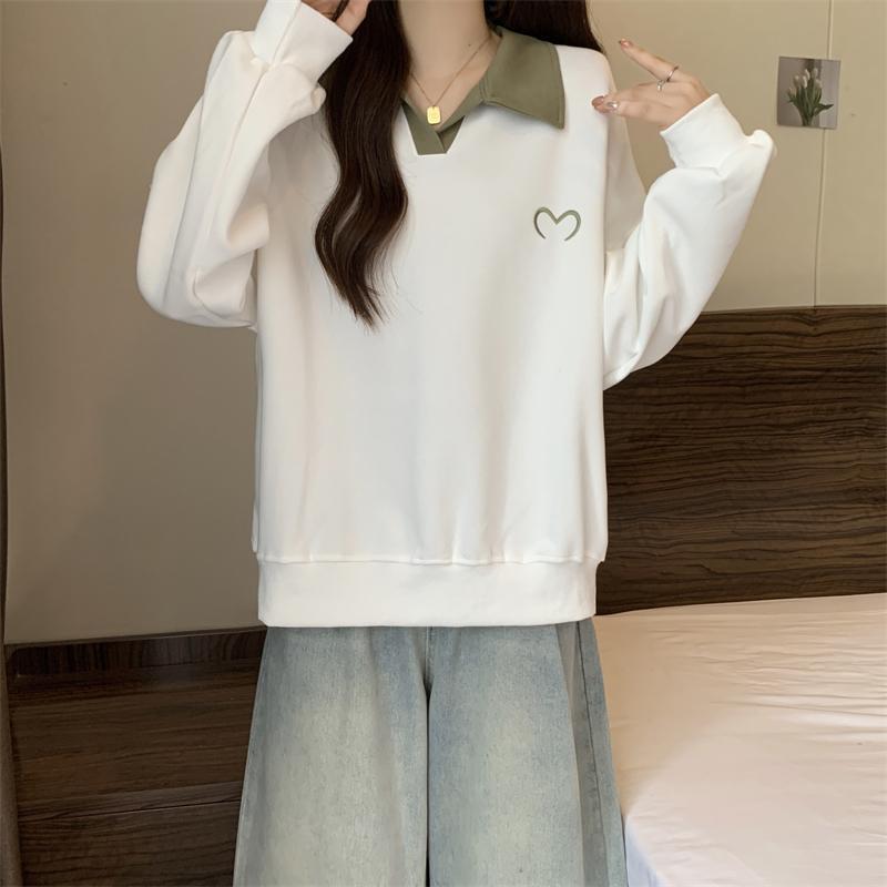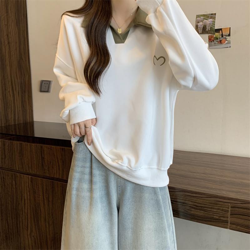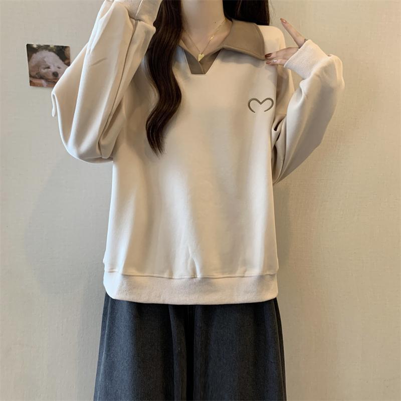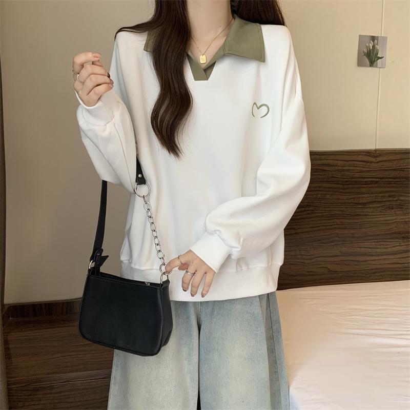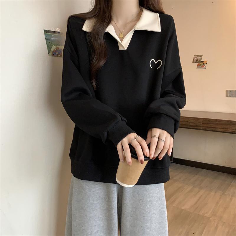 플러스 사이즈 여성 대비 폴로 칼라 스웨트 셔츠 여성의 가을 통통녀 슬리밍 느슨한 디자인 게으른 스타일 코트 탑스토어 가기