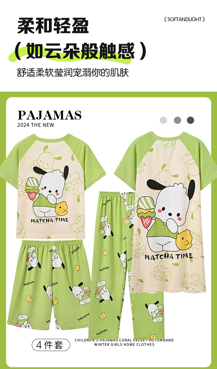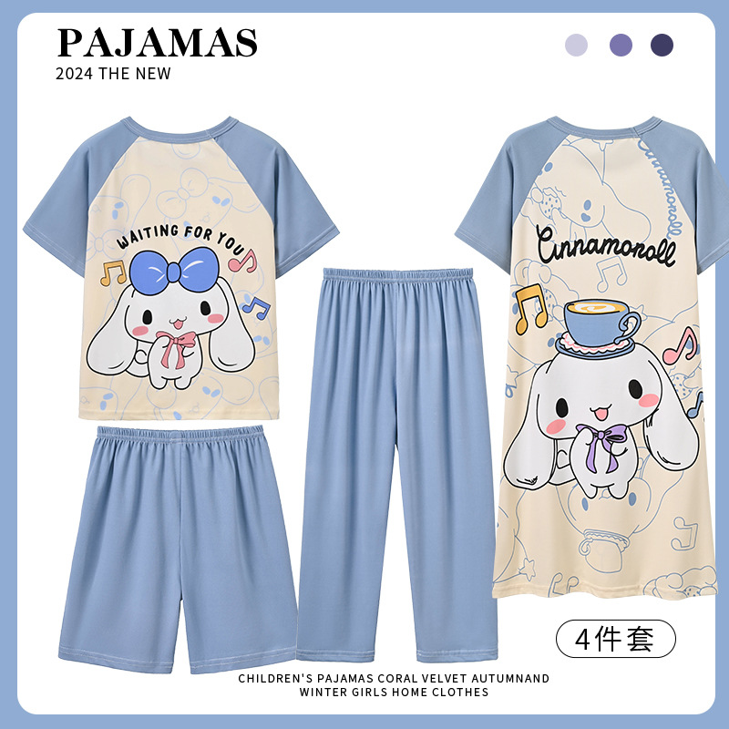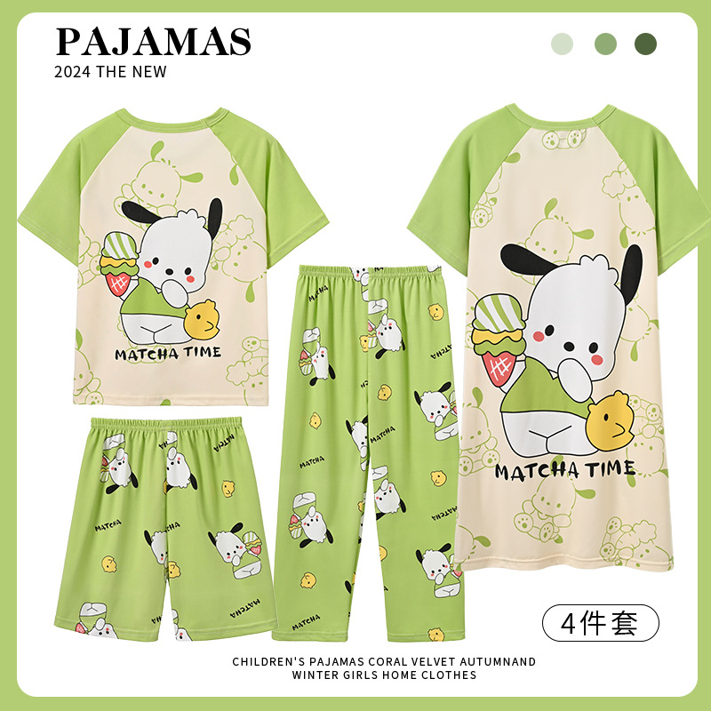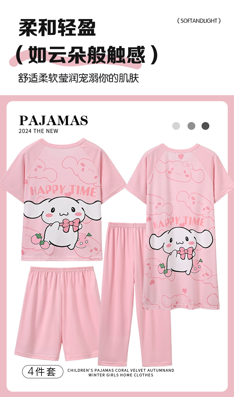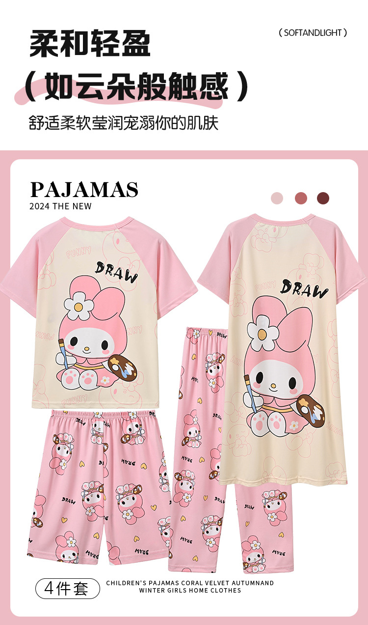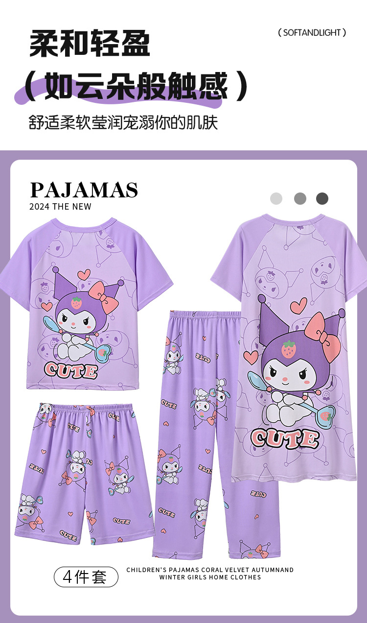 4 조각 소녀 잠옷 2025 만화 새 도착 쿨로 미 여름 얇은 반팔 세트 중대형 어린이 가정 옷