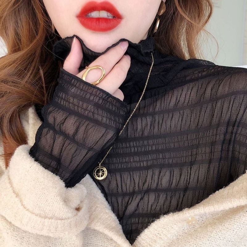 레이스베이스 셔츠 여성용 긴 소매 새로운 내부 높은 목 우아한 슬림 룩 쉬폰 셔츠 메쉬 최고 유행 작은 셔츠