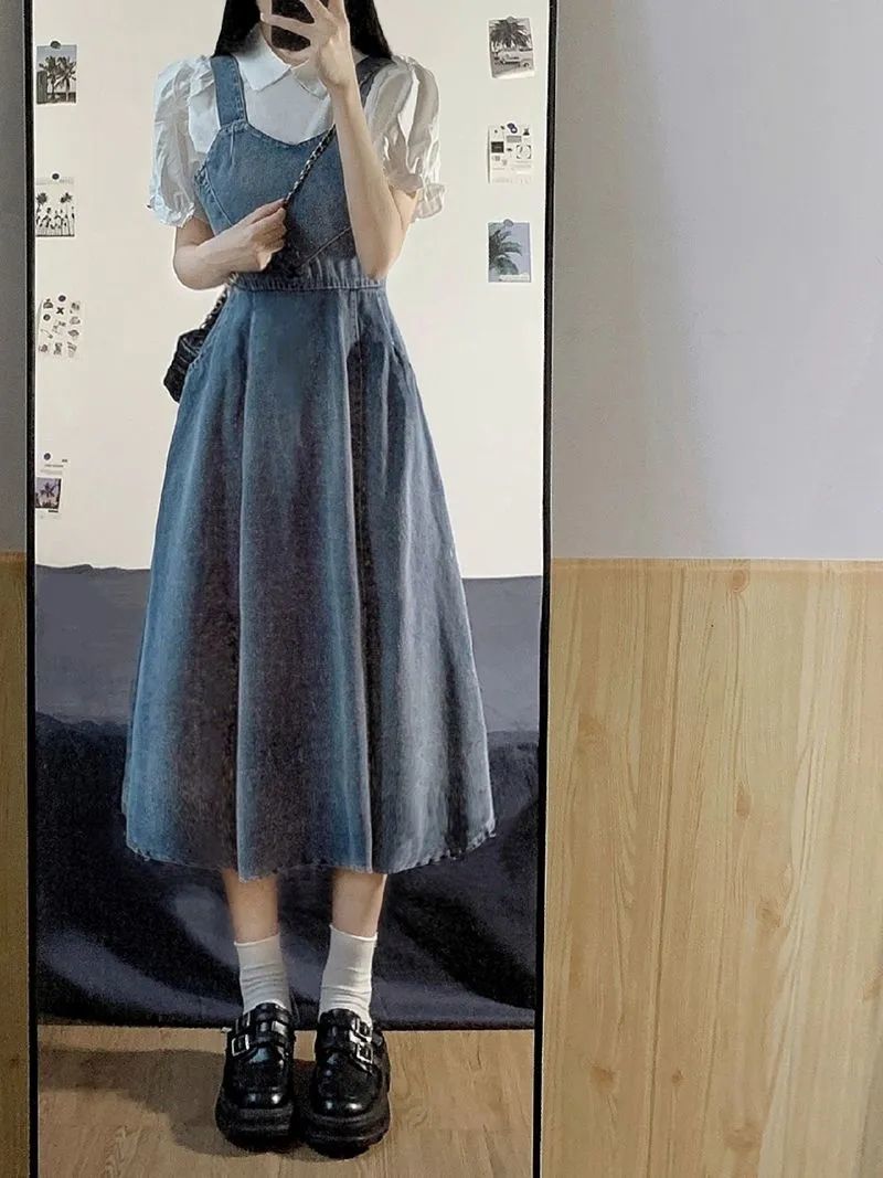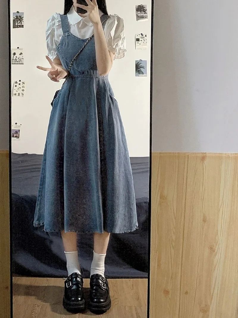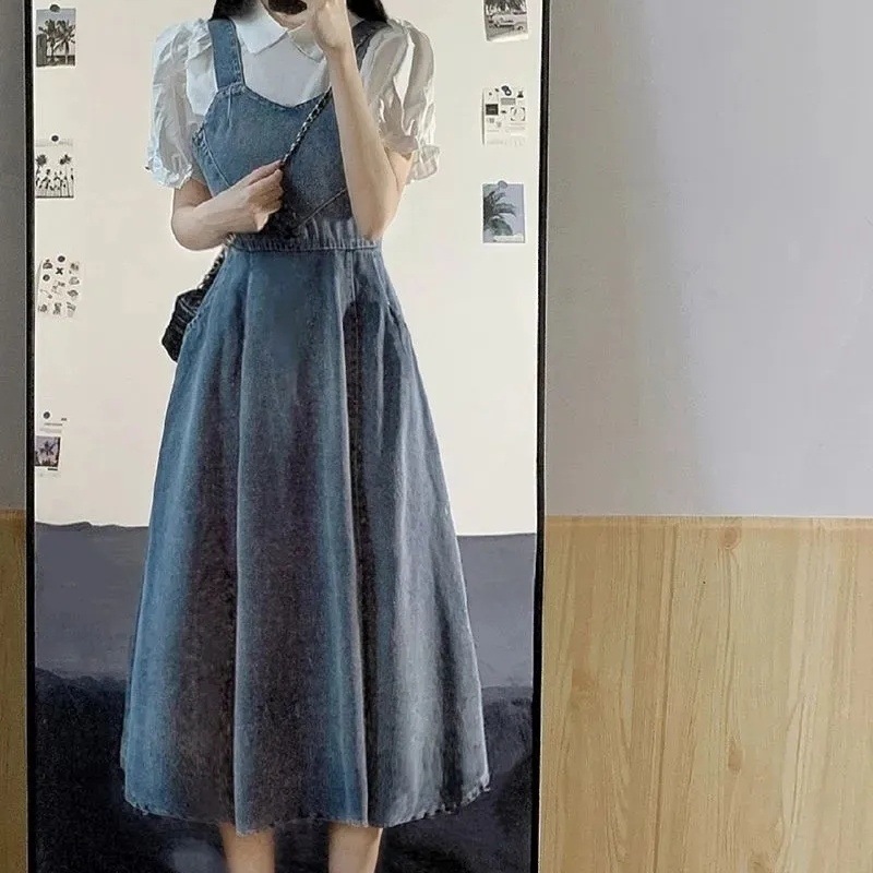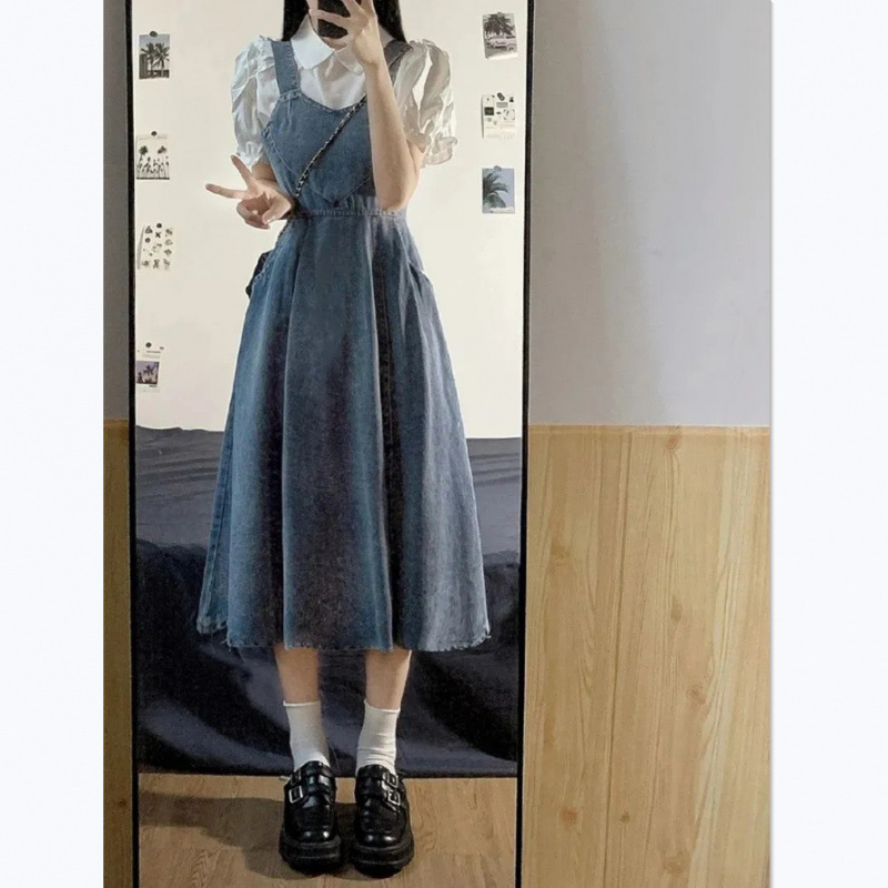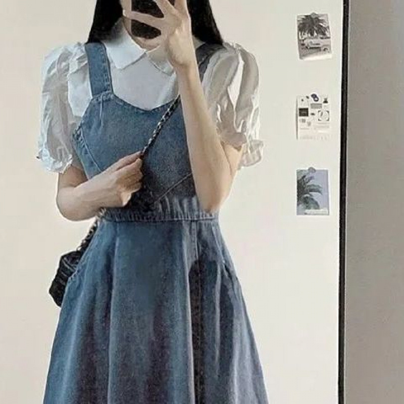 [8716 명 칭찬] 프랑스 틈새 버블 슬리브 하이 엔드 셔츠 향수 데님 스트랩 스커트 순수한 욕망스토어 가기