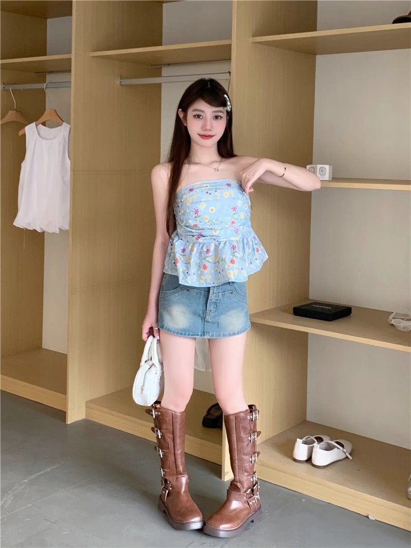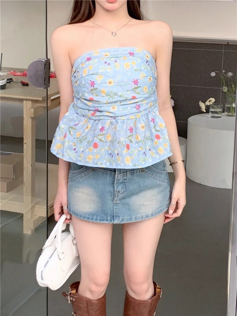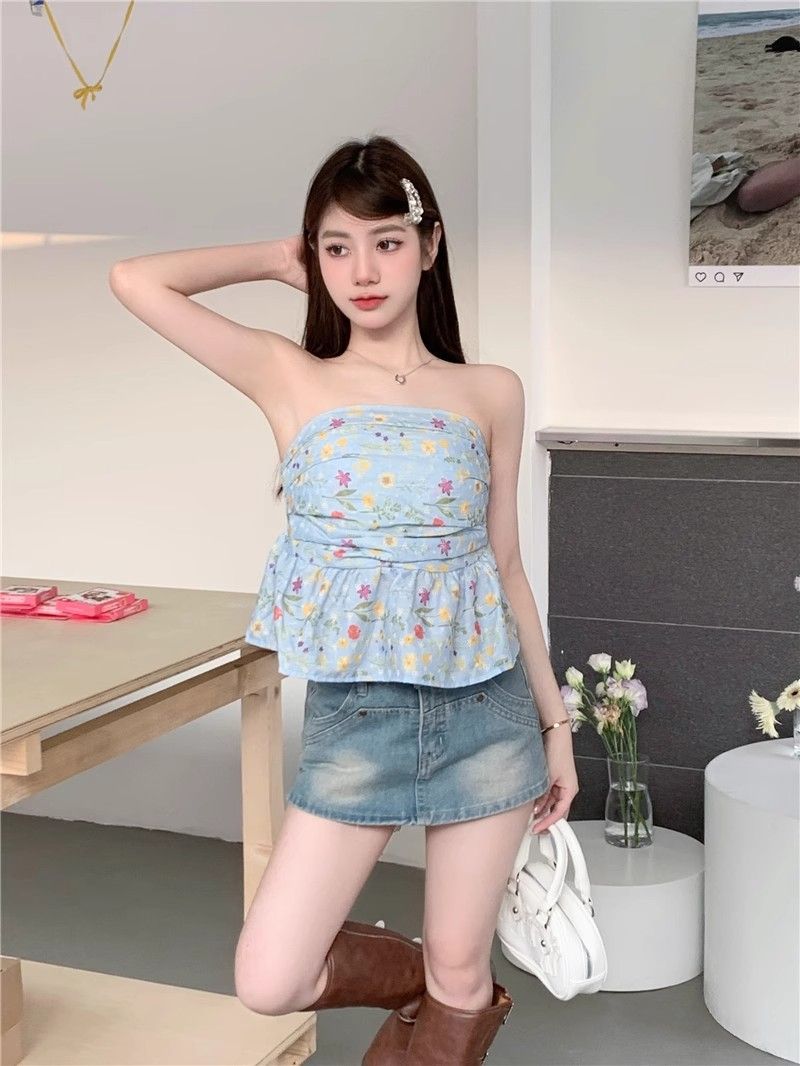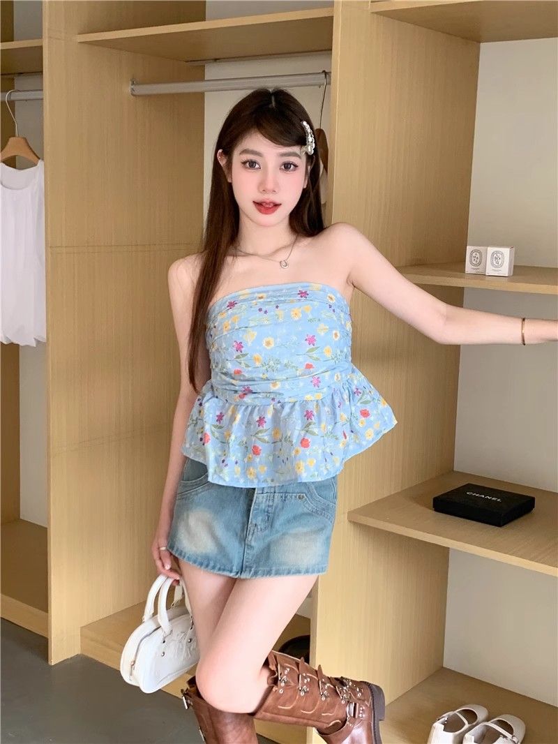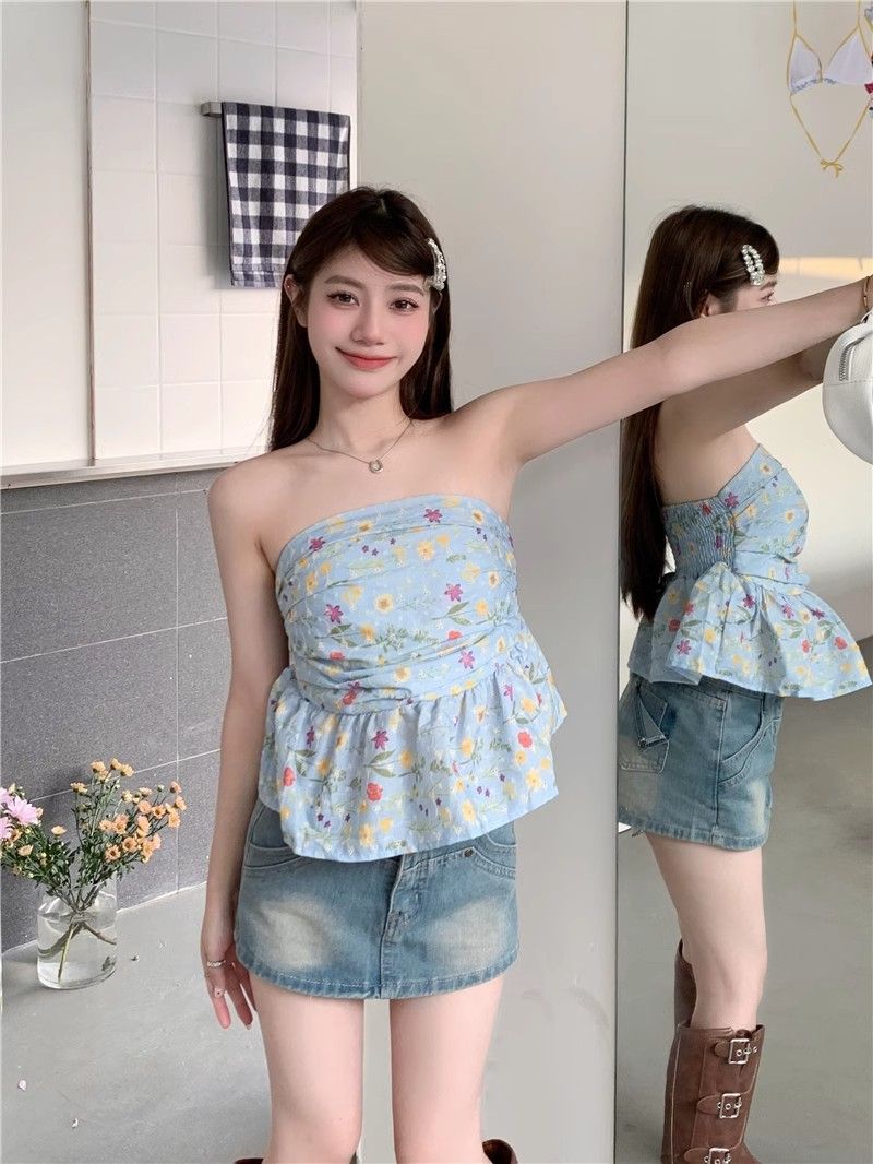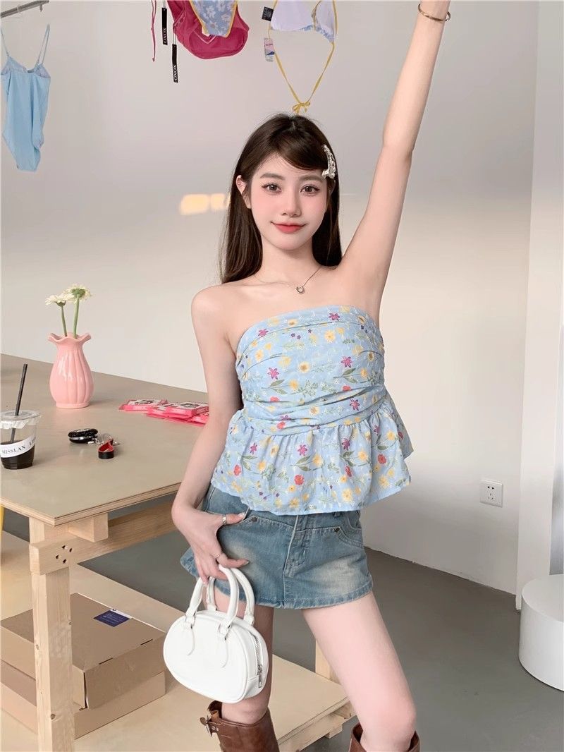 블루 플로럴 스트랩리스 조끼 여성 프랑스 스타일 뜨거운 소녀의 내부 착용 짧은 디자인 탑스토어 가기