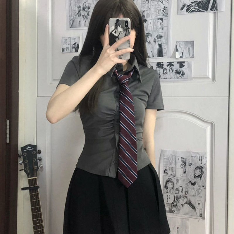 • 그레이 반소매 + 버건디 스트라이프 타이