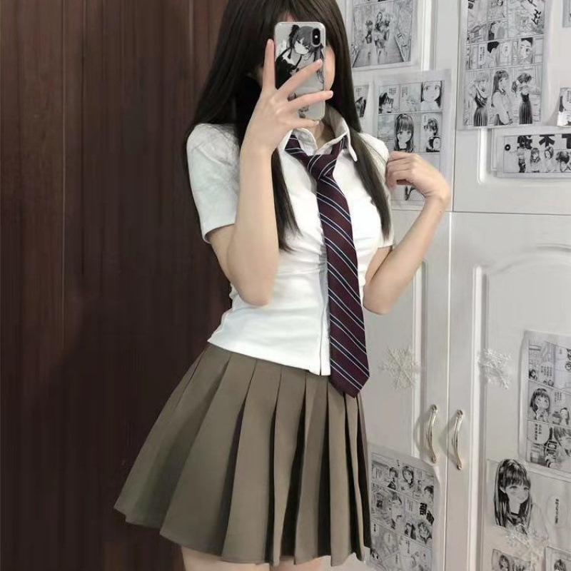 • 흰색 반팔 + 버건디 스트라이프 넥타이