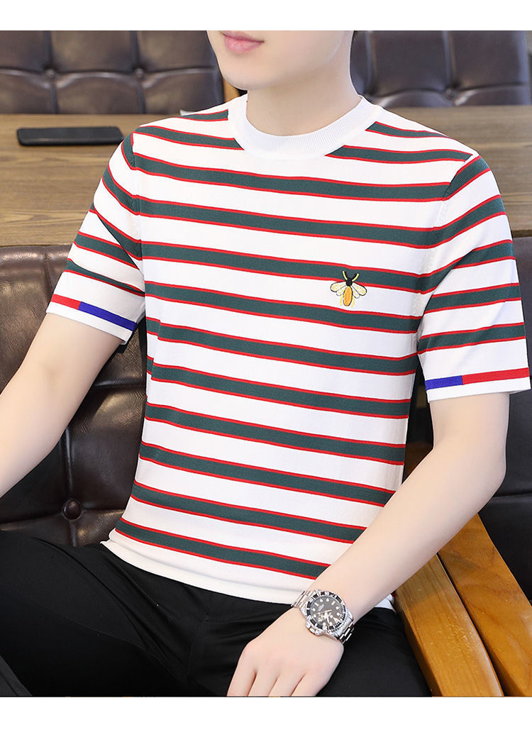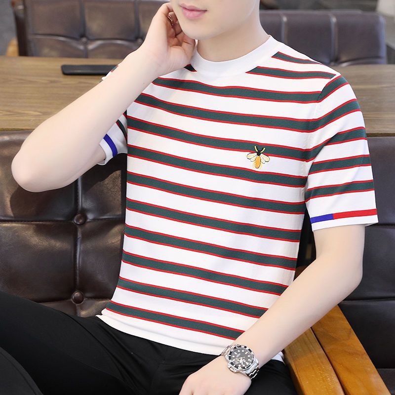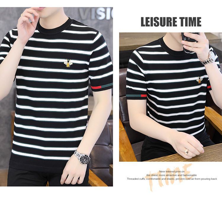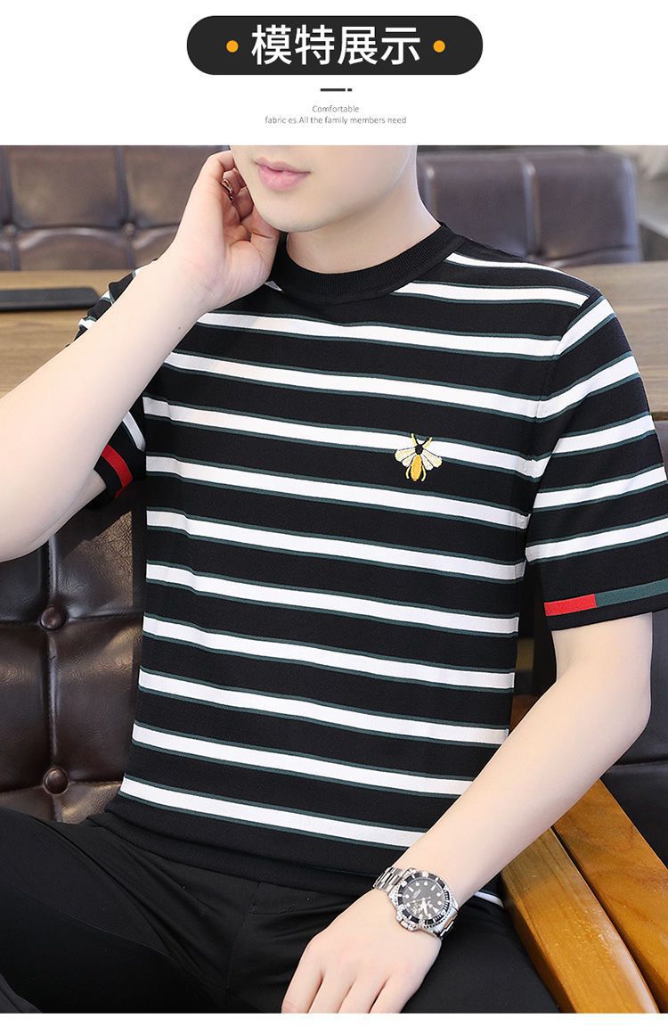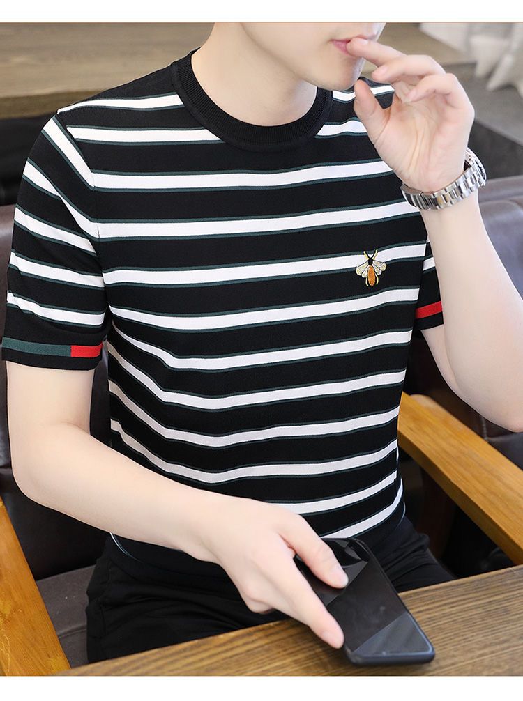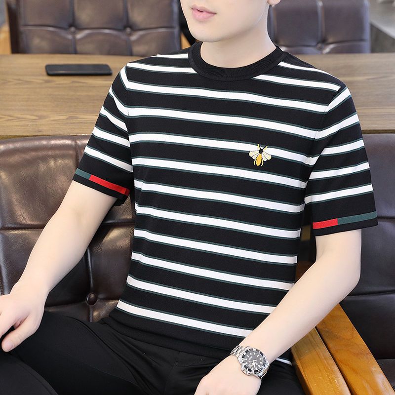 2025 새로운 스타일 스트라이프 아이스 실크 반팔 티셔츠 남자 여름 얇은 슬림 핏 라운드 넥 남자 꿀벌 하이 엔드 반소매 티셔츠