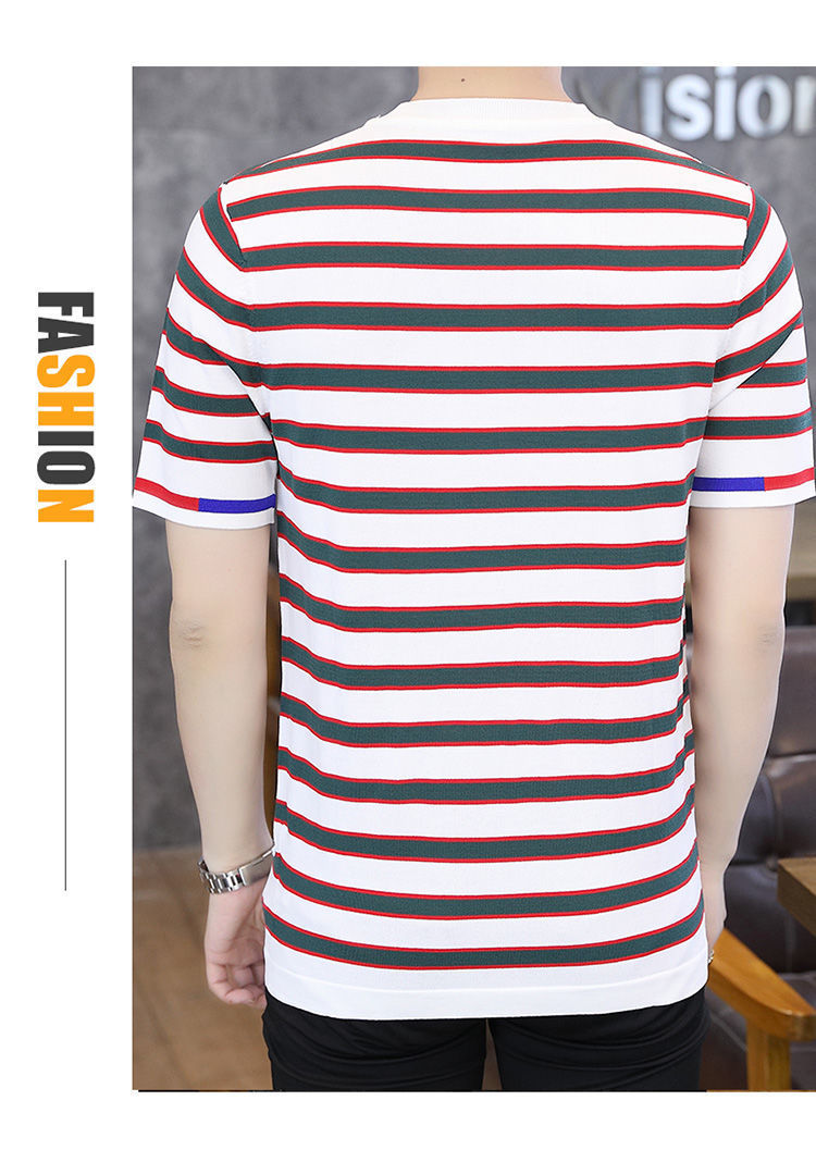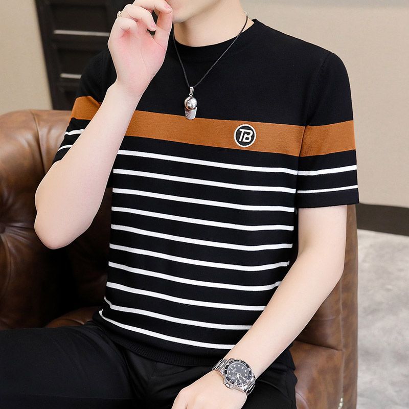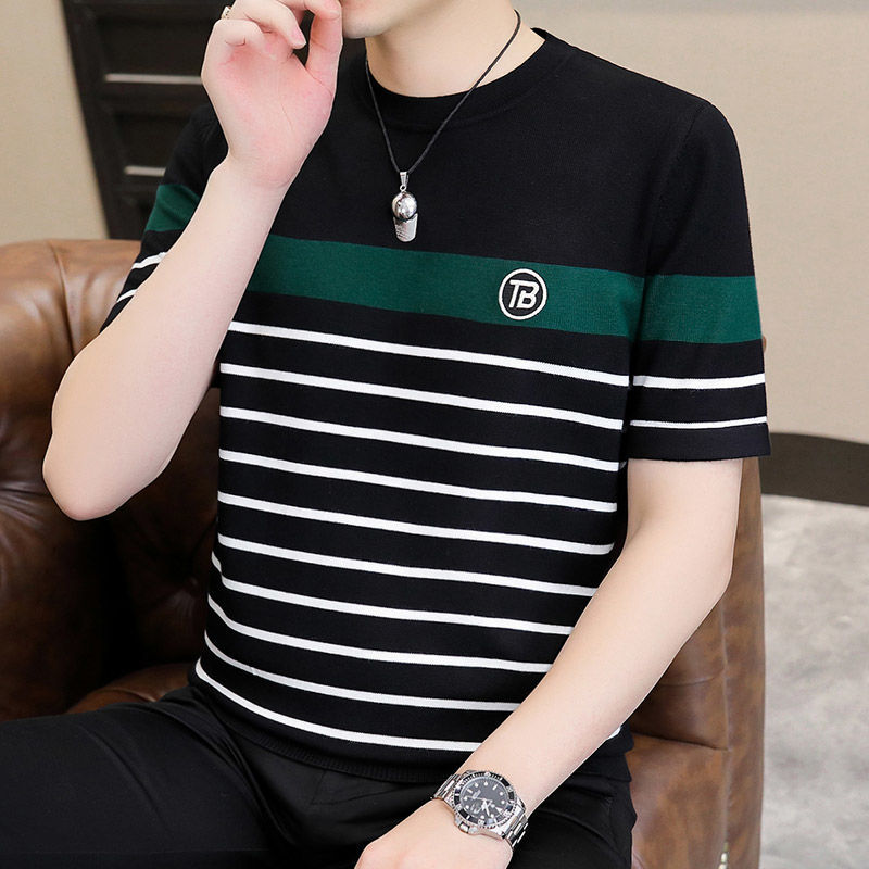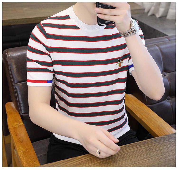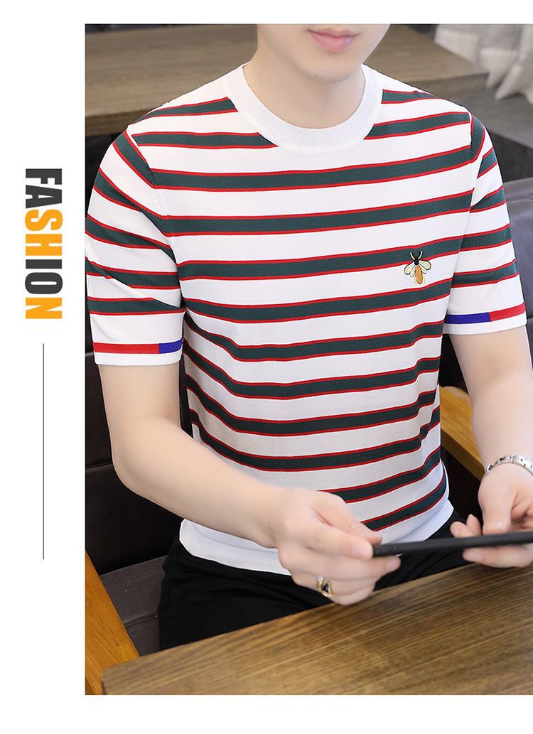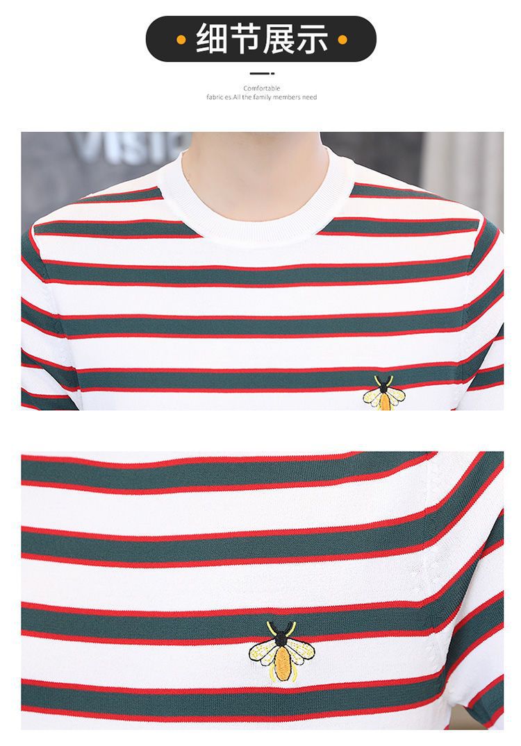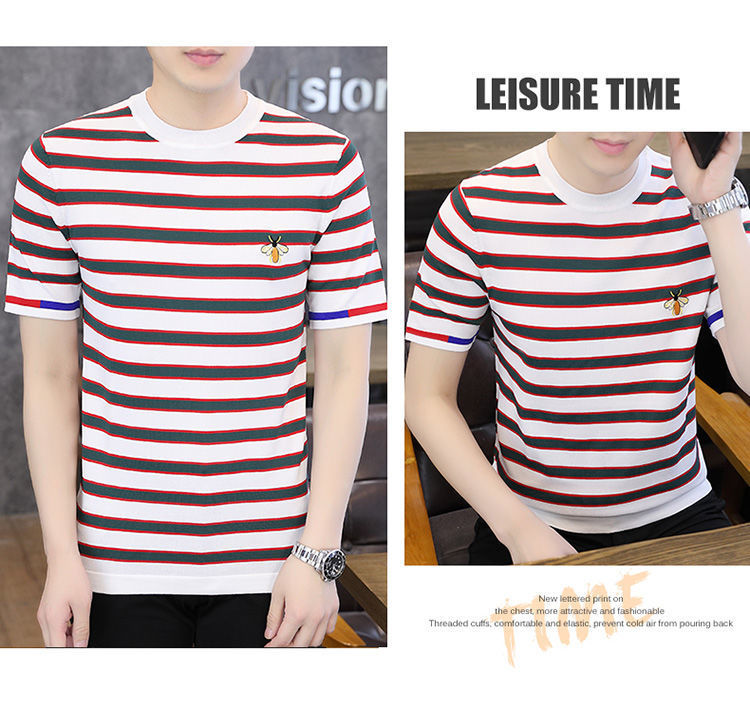 2025 새로운 스타일 스트라이프 아이스 실크 반팔 티셔츠 남자 여름 얇은 슬림 핏 라운드 넥 남자 꿀벌 하이 엔드 반소매 티셔츠
