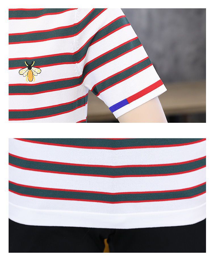 2025 새로운 스타일 스트라이프 아이스 실크 반팔 티셔츠 남자 여름 얇은 슬림 핏 라운드 넥 남자 꿀벌 하이 엔드 반소매 티셔츠스토어 가기