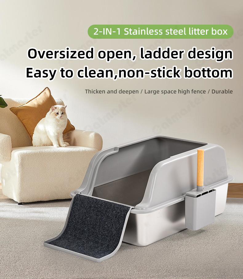 국경 스테인레스 스틸 고양이 스크래치 패드 고양이 쓰레기 상자 안티 스플래쉬 큰 공간을 열고 닫은 이중 목적 고양이 쓰레기 상자를 쉽게 청소할 수 있습니다.
