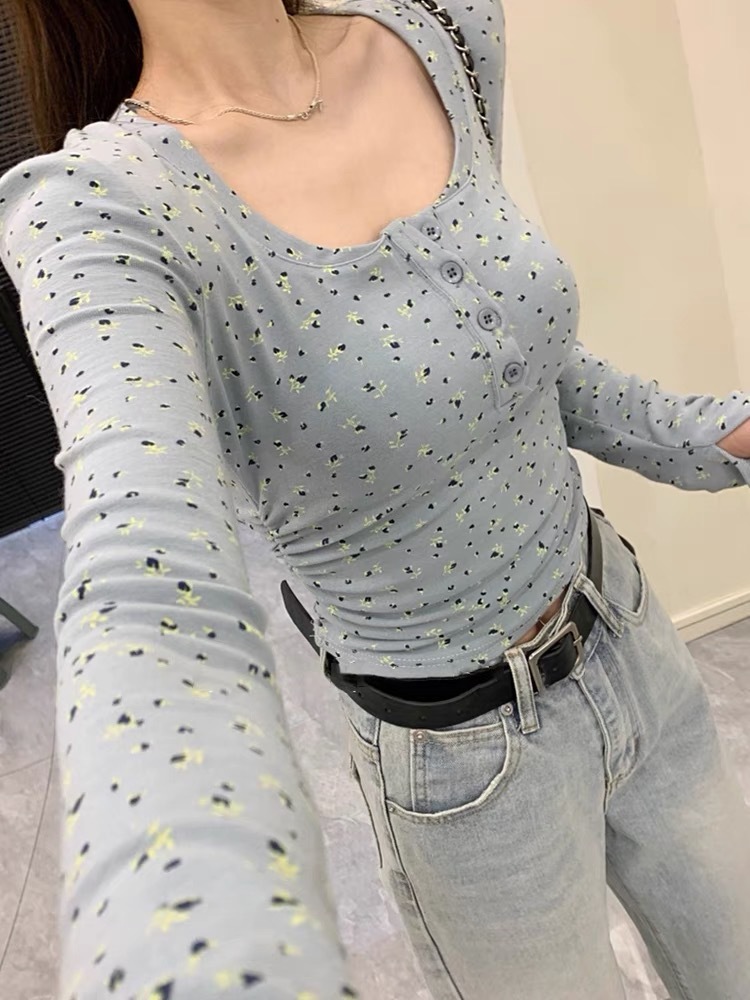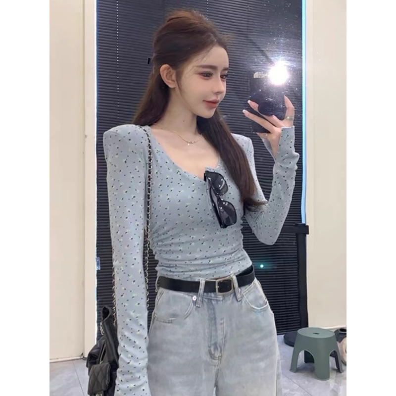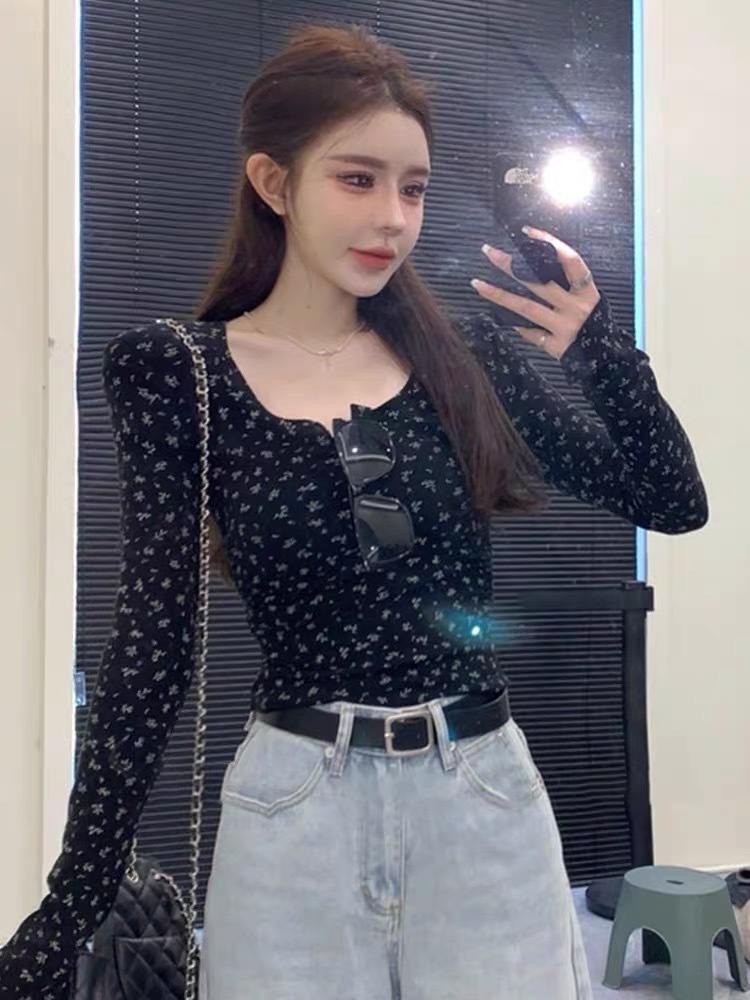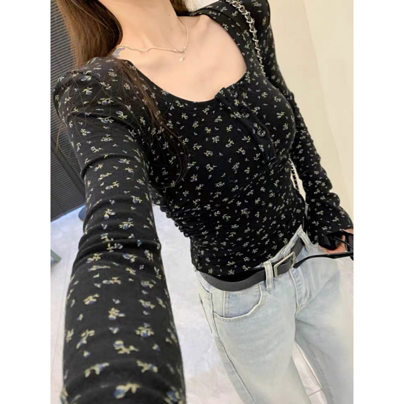 이른 봄베이스 셔츠 스퀘어 칼라 긴팔 티셔츠 여성 봄과 가을 2024 새로운 핫 걸 슬림 핏 쇼트 탑스토어 가기