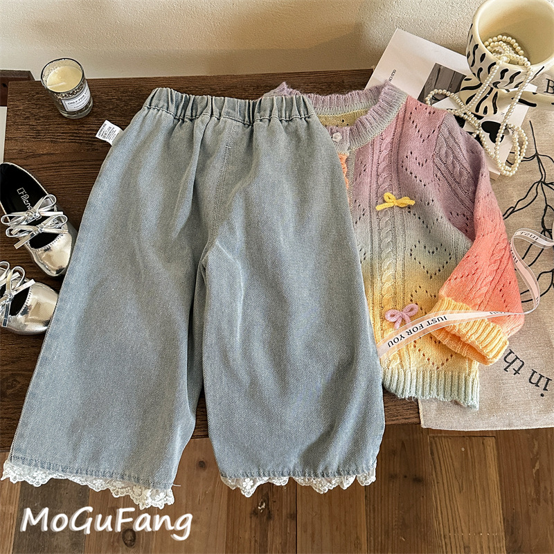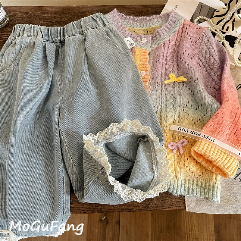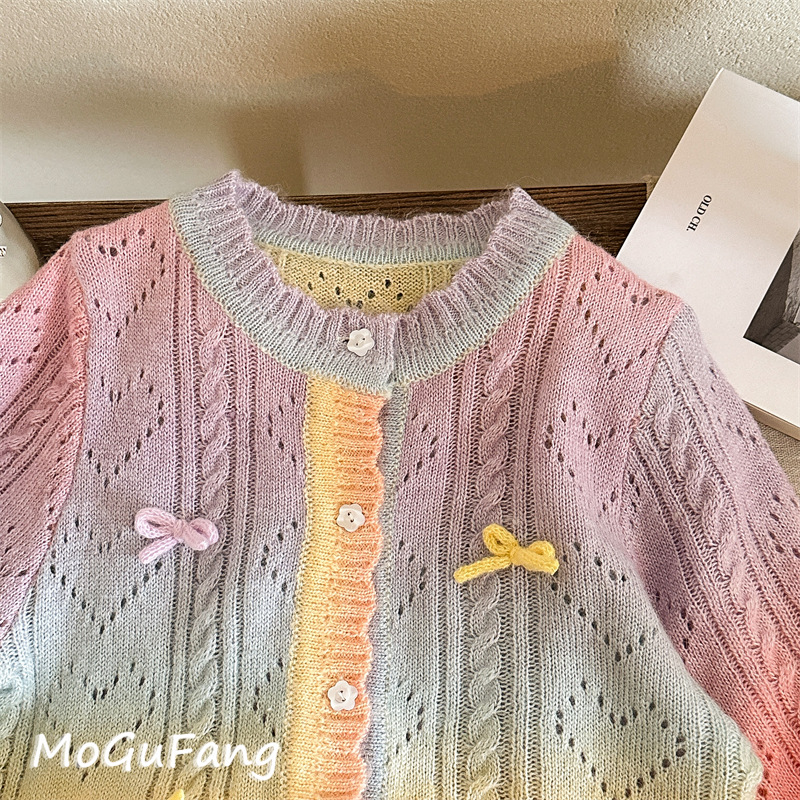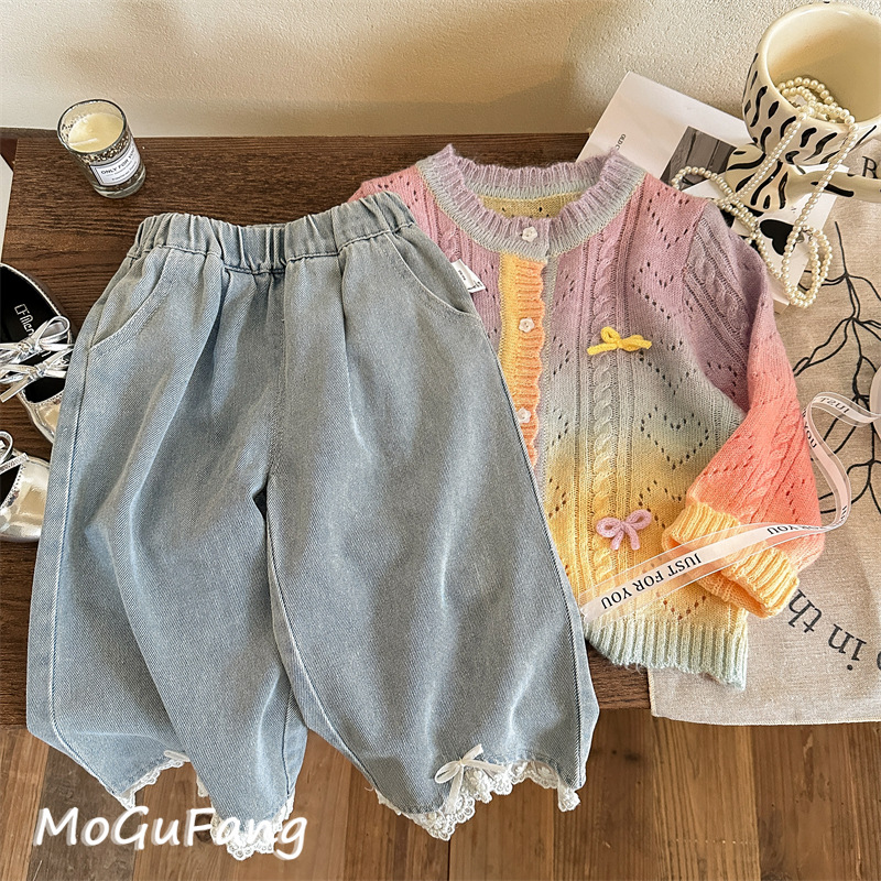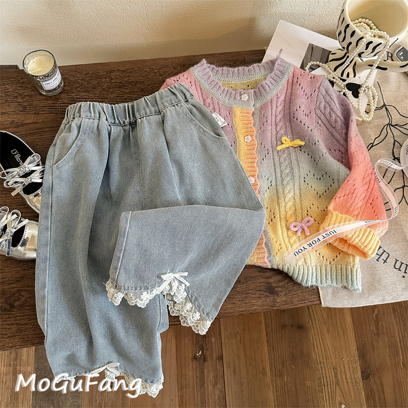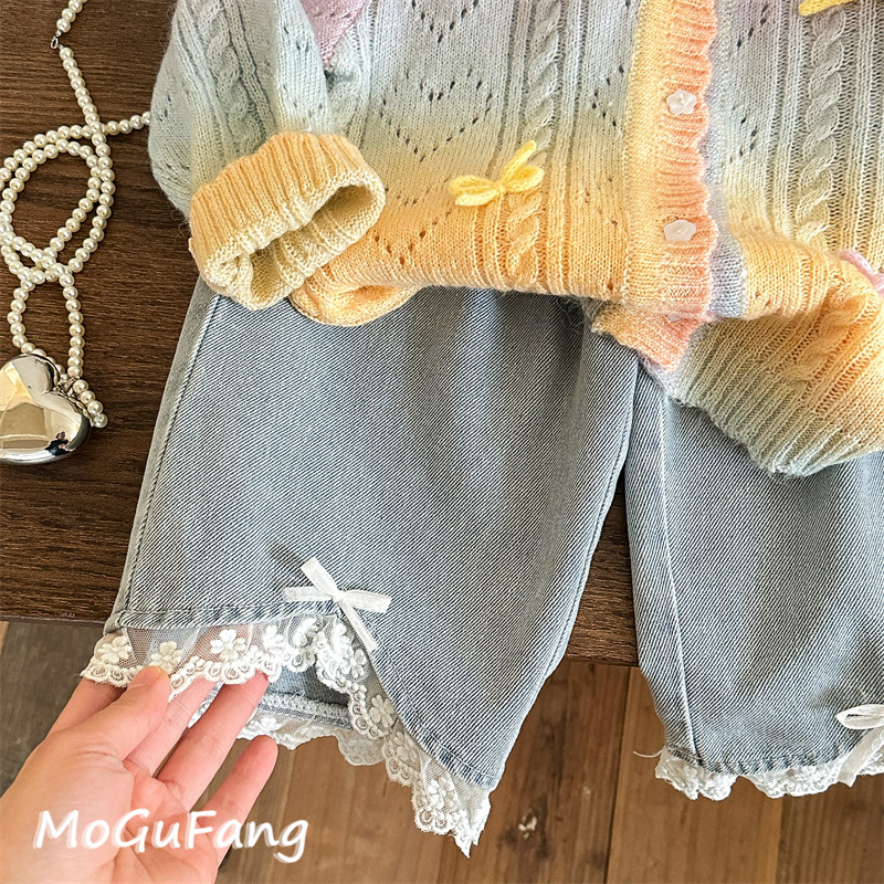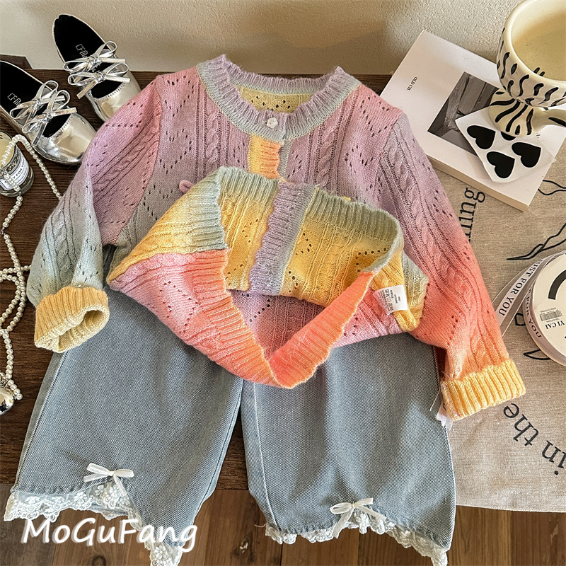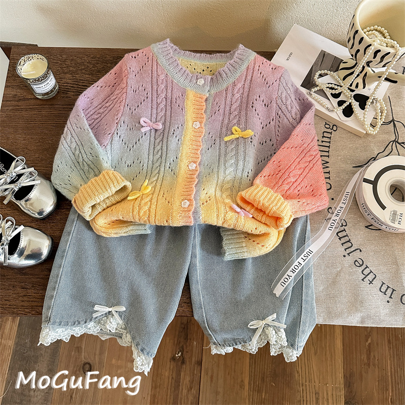 여자 스웨터 봄 2025 새로운 베이비 카디건 코트 스웨터 그라디언트 스웨터 청바지 세트 트렌디