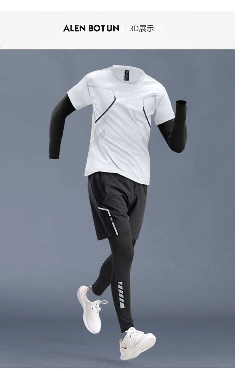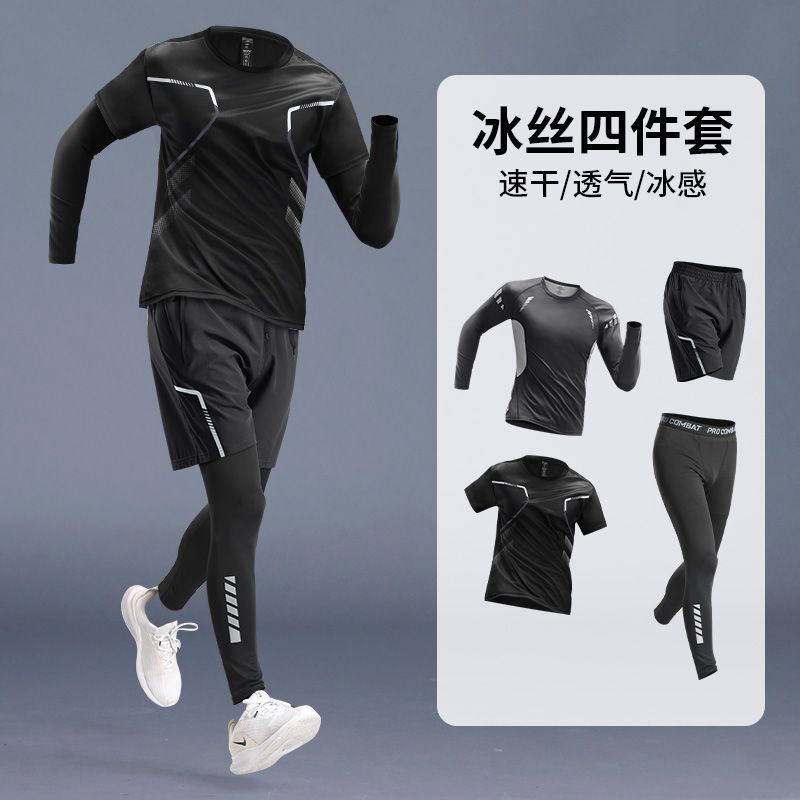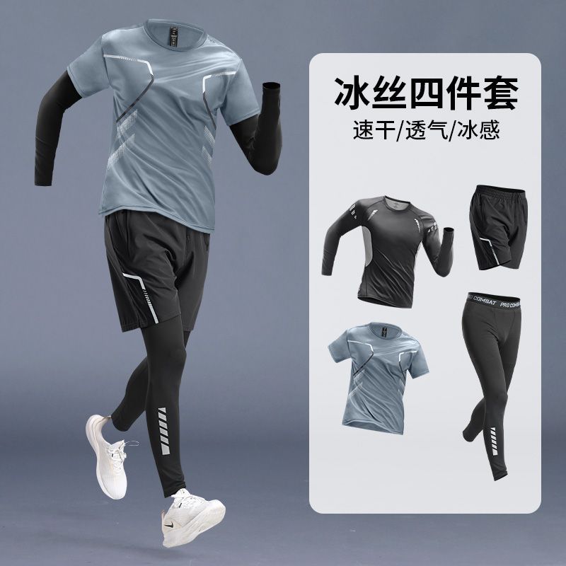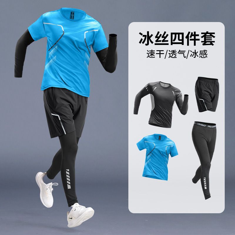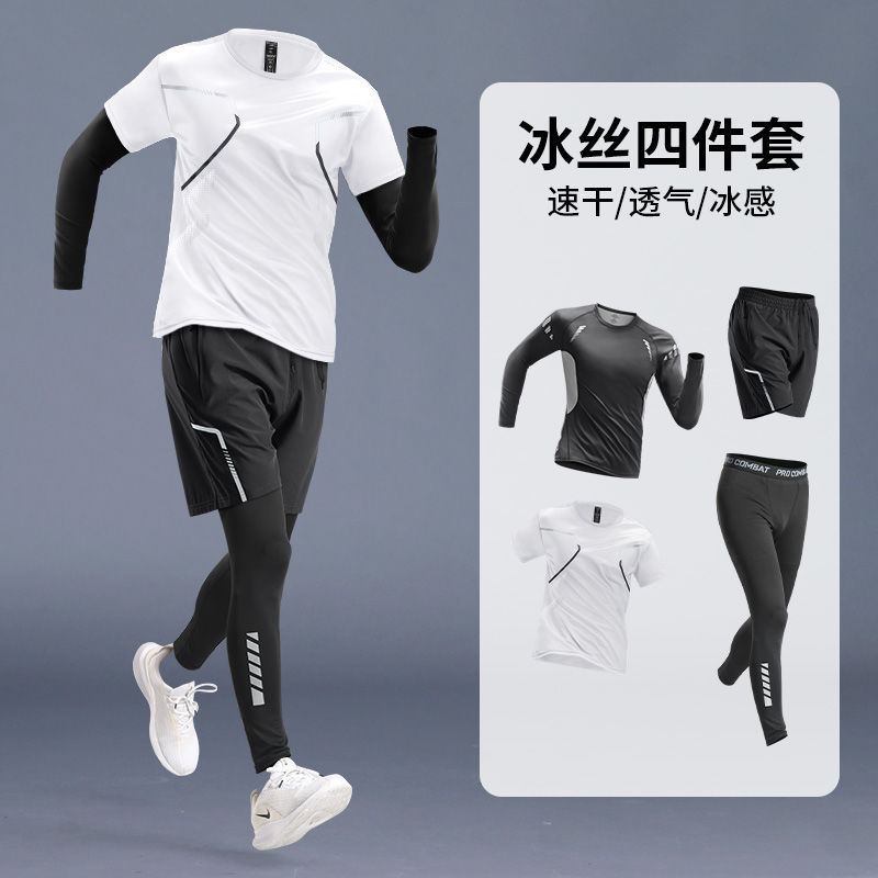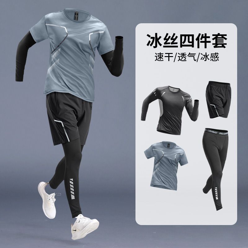 달리기 세트 남자 여름 빠른 건조 운동복 얇은 아이스 실크 훈련 꽉 피트니스 옷 아침 달리기 사이클링 4 종 세트스토어 가기