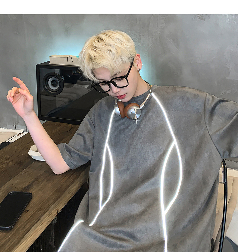 스웨이드 반팔 티셔츠 남자 2025 새로운 디자인 센스 틈새 반사 스트립 헤비 느슨한 커플 반소매 티셔츠스토어 가기