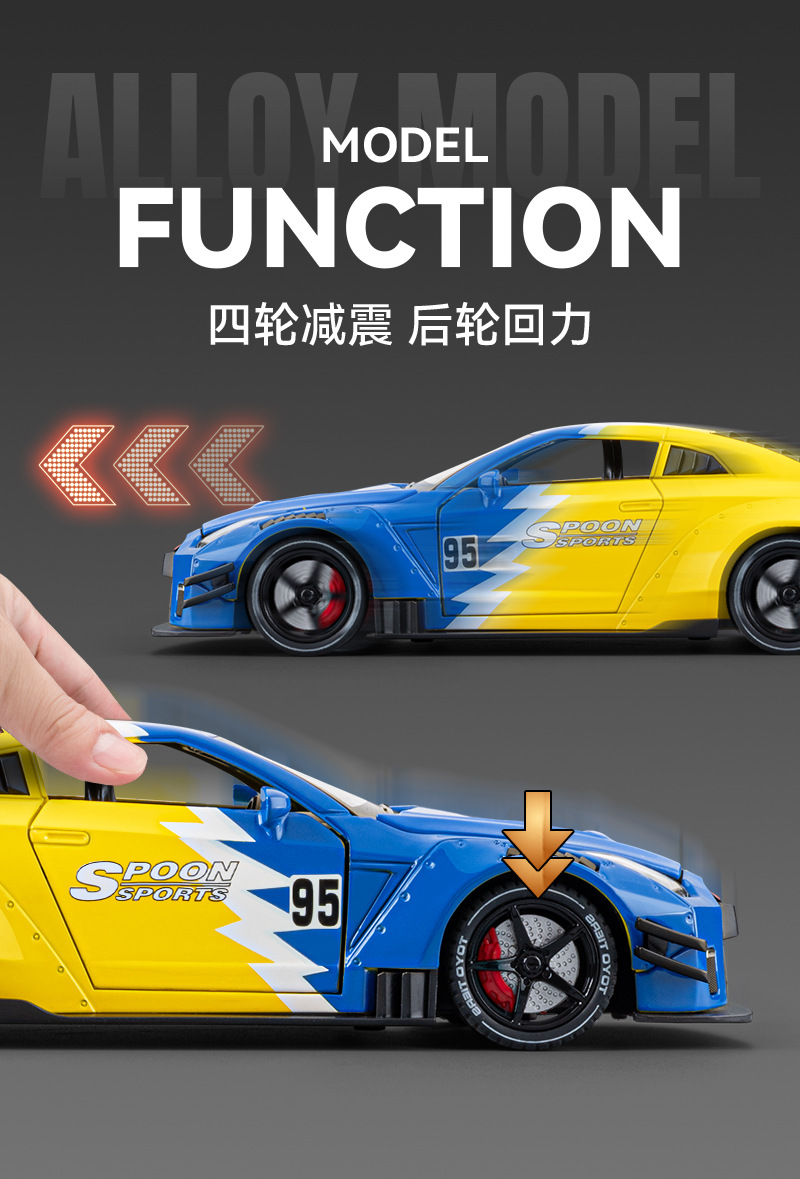 시뮬레이션 1:24 닛산 GTR 레이스 에디션 합금 자동차 모델 장식 선물 Acousto-optic Huili 소년 장난감 머리