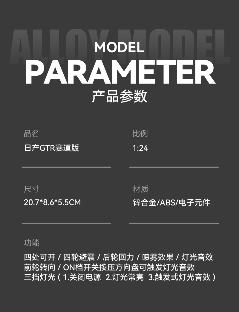 시뮬레이션 1:24 닛산 GTR 레이스 에디션 합금 자동차 모델 장식 선물 Acousto-optic Huili 소년 장난감 머리스토어 가기