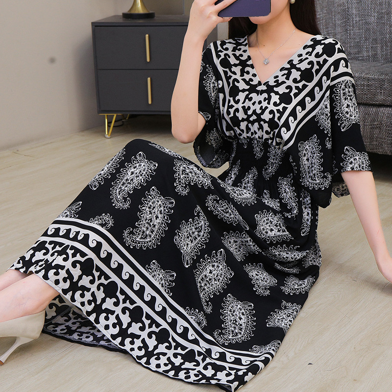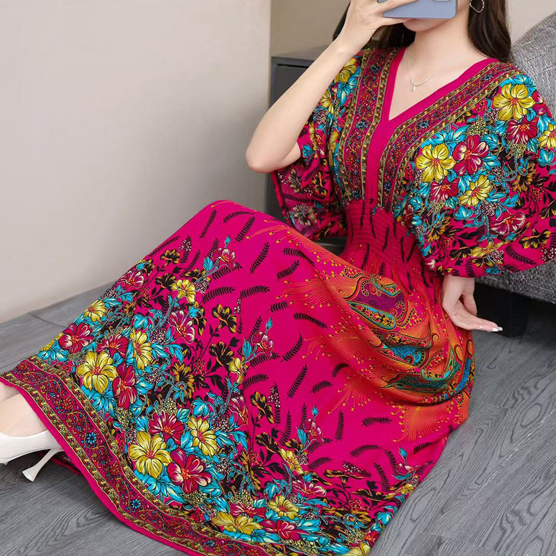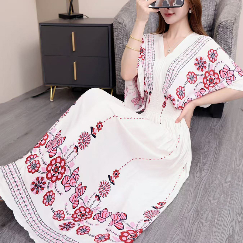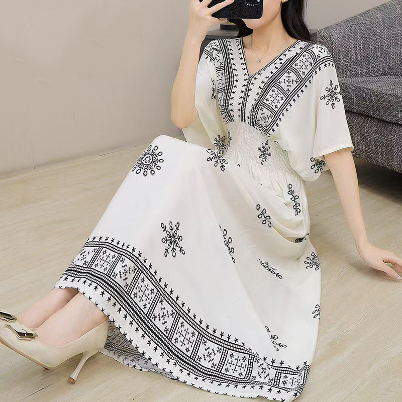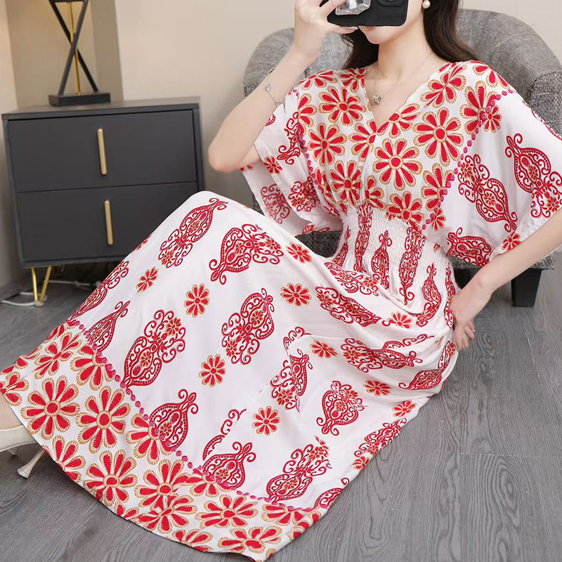 25 년 새로운 꽃 # 민족 스타일 V-Neck 면 실크 짧은 소매 프랑스 스타일 태국 스타일 원피스 여성의 인쇄 된 휴일 스타일 치마스토어 가기