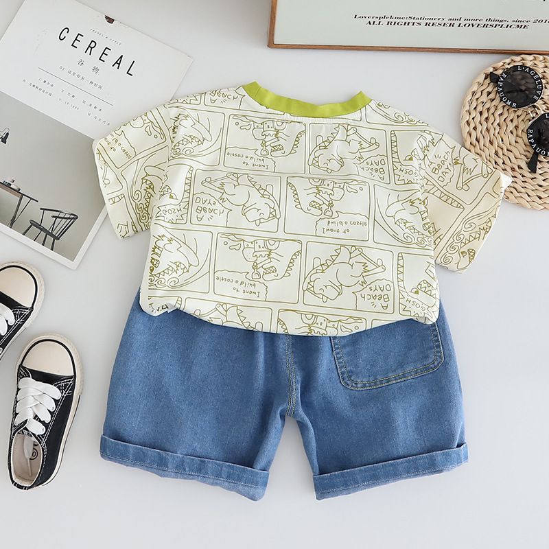 아기의 만화 전체 인쇄 공룡 크루 넥 티셔츠 2025 여름 새로운 작은 소년의 서양 스타일 여름 짧은 소매 세트스토어 가기