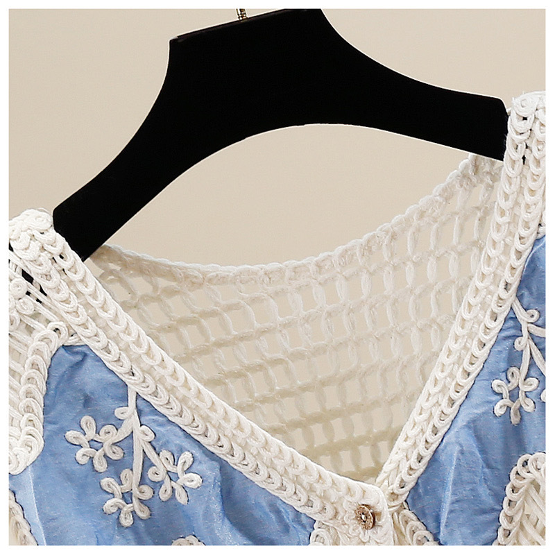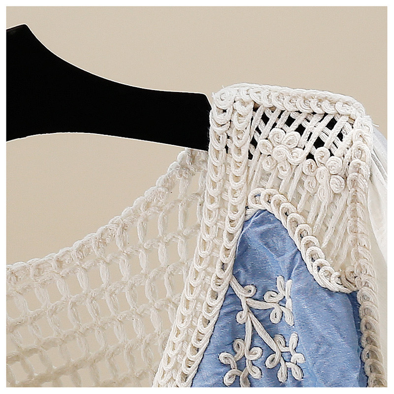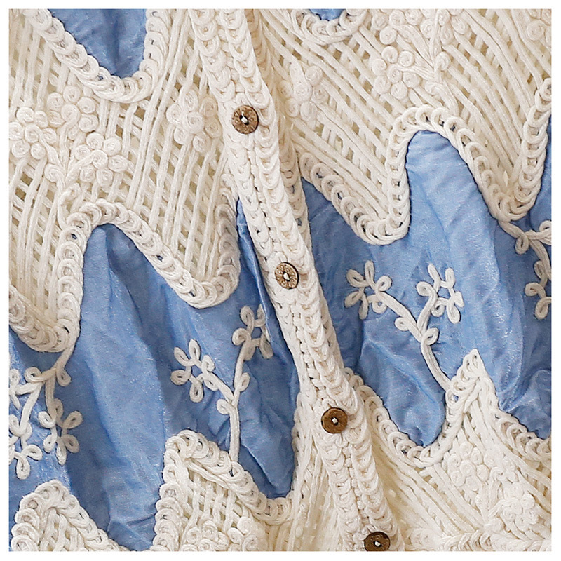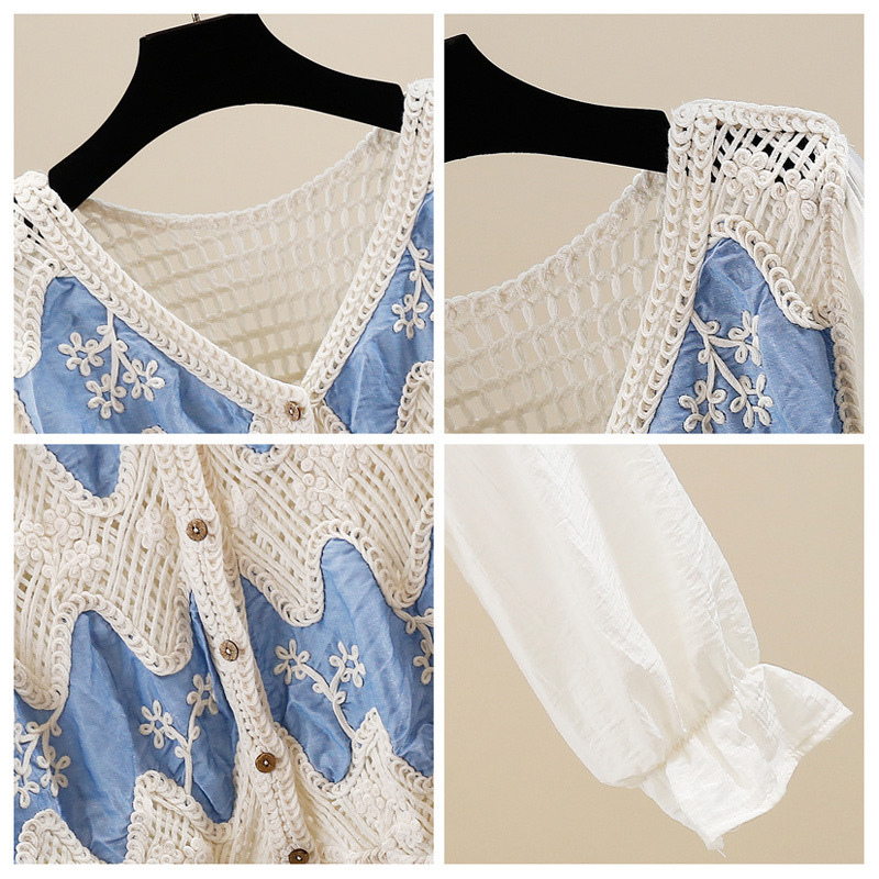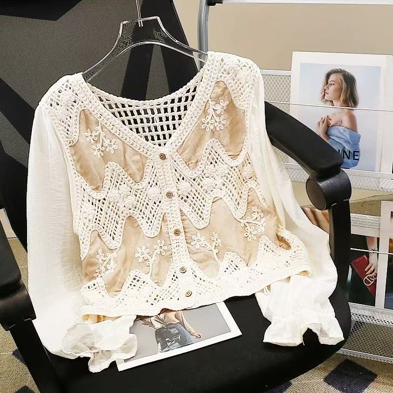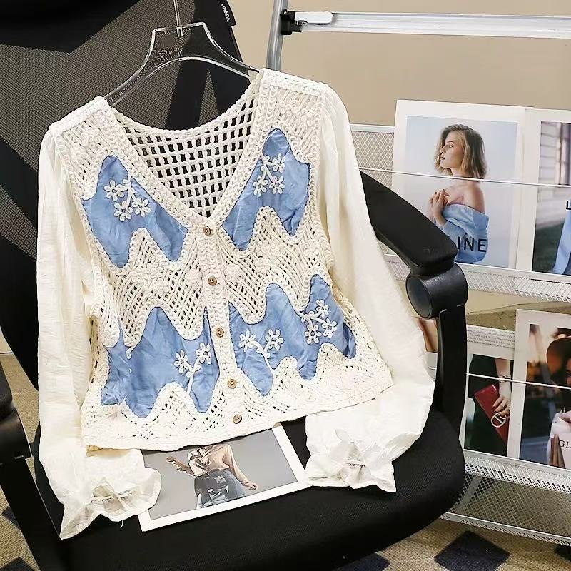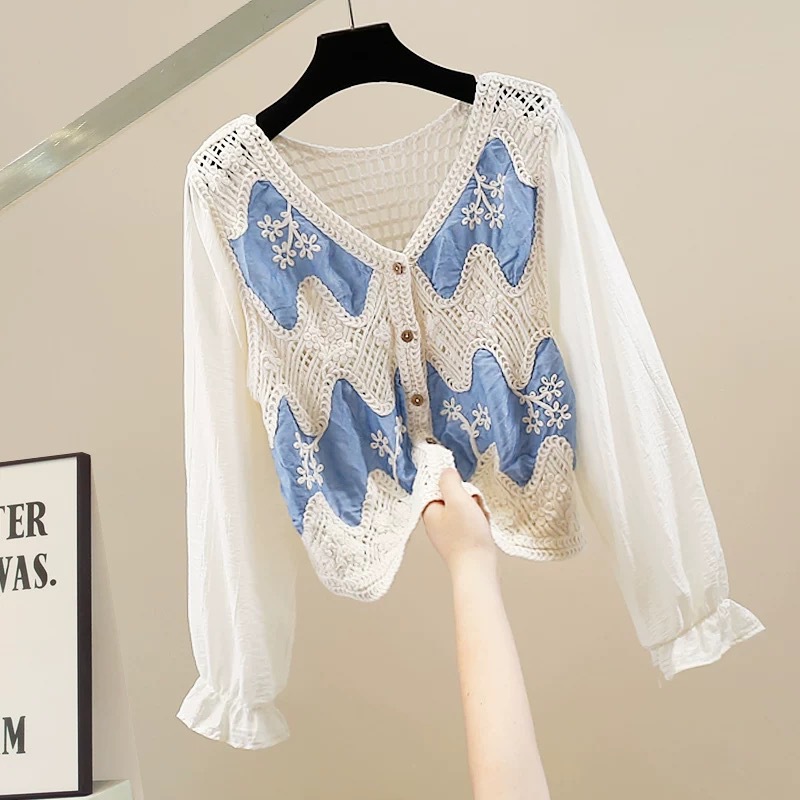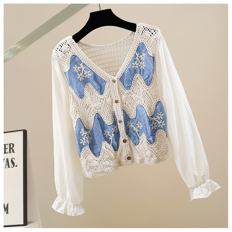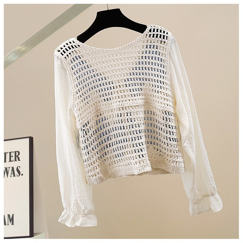 프랑스의 새로운 패션 중공업 중공 크로 셰 뜨개질 색상 일치하는 섹시한 긴 소매 셔츠 디자인 감각 느슨한 올매치 최고 트렌디