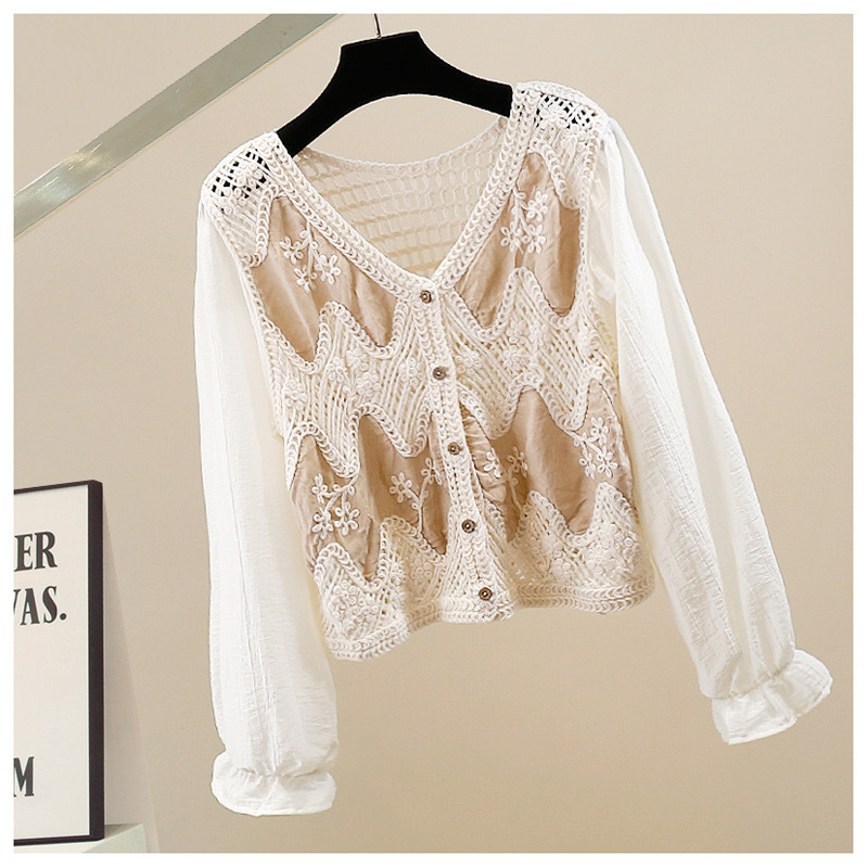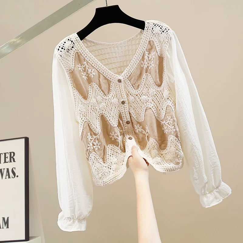 프랑스의 새로운 패션 중공업 중공 크로 셰 뜨개질 색상 일치하는 섹시한 긴 소매 셔츠 디자인 감각 느슨한 올매치 최고 트렌디스토어 가기