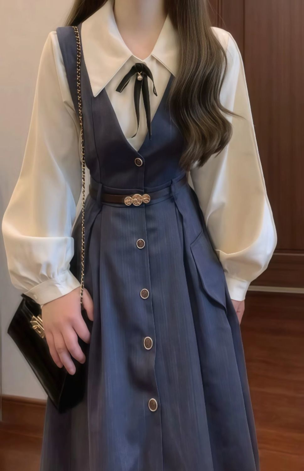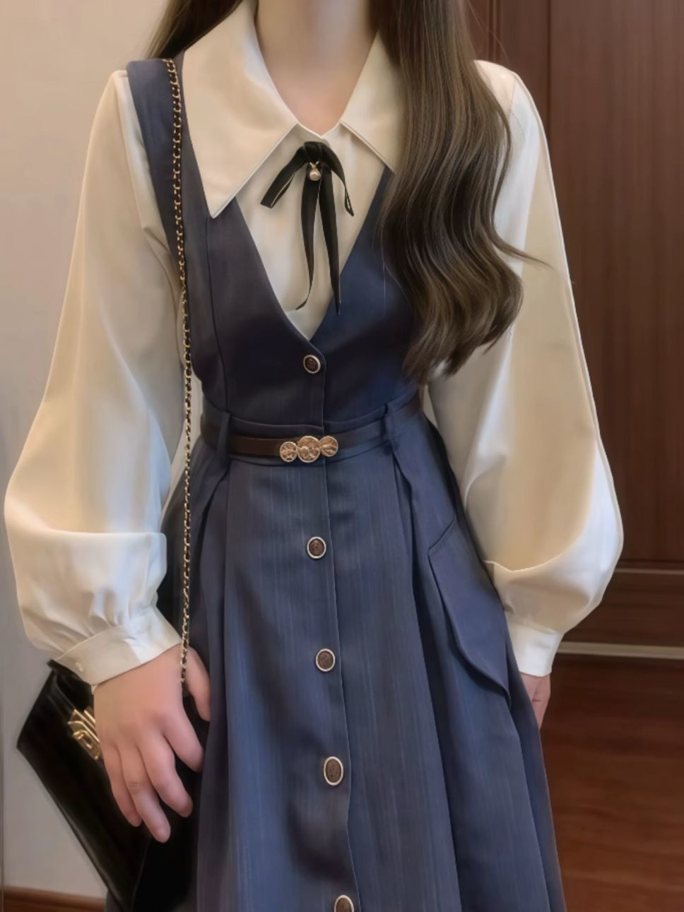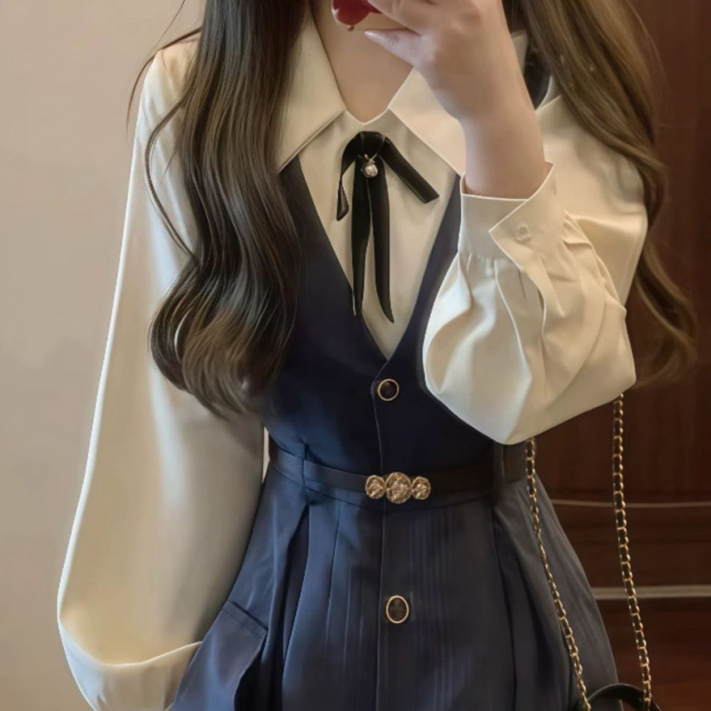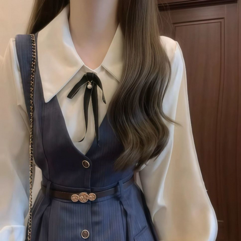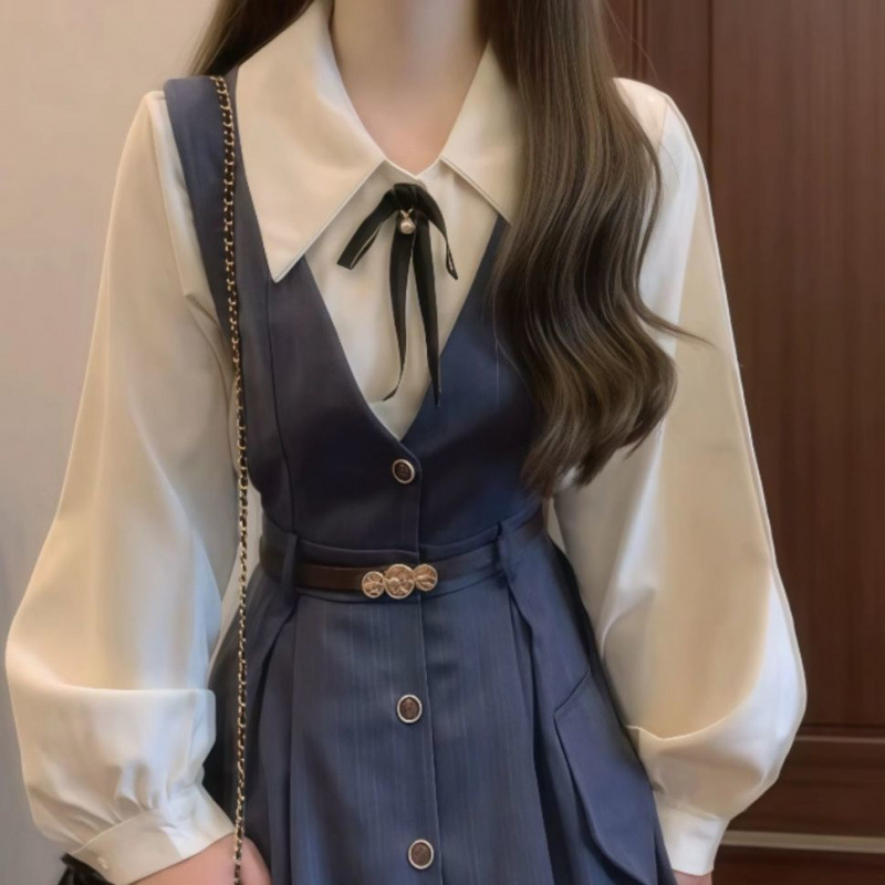 • 네이비 블루 서스펜더 스커트 + 화이트 셔츠 슈트