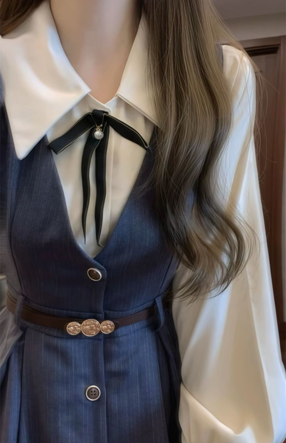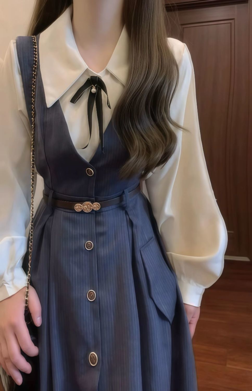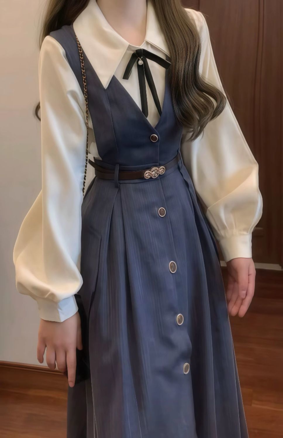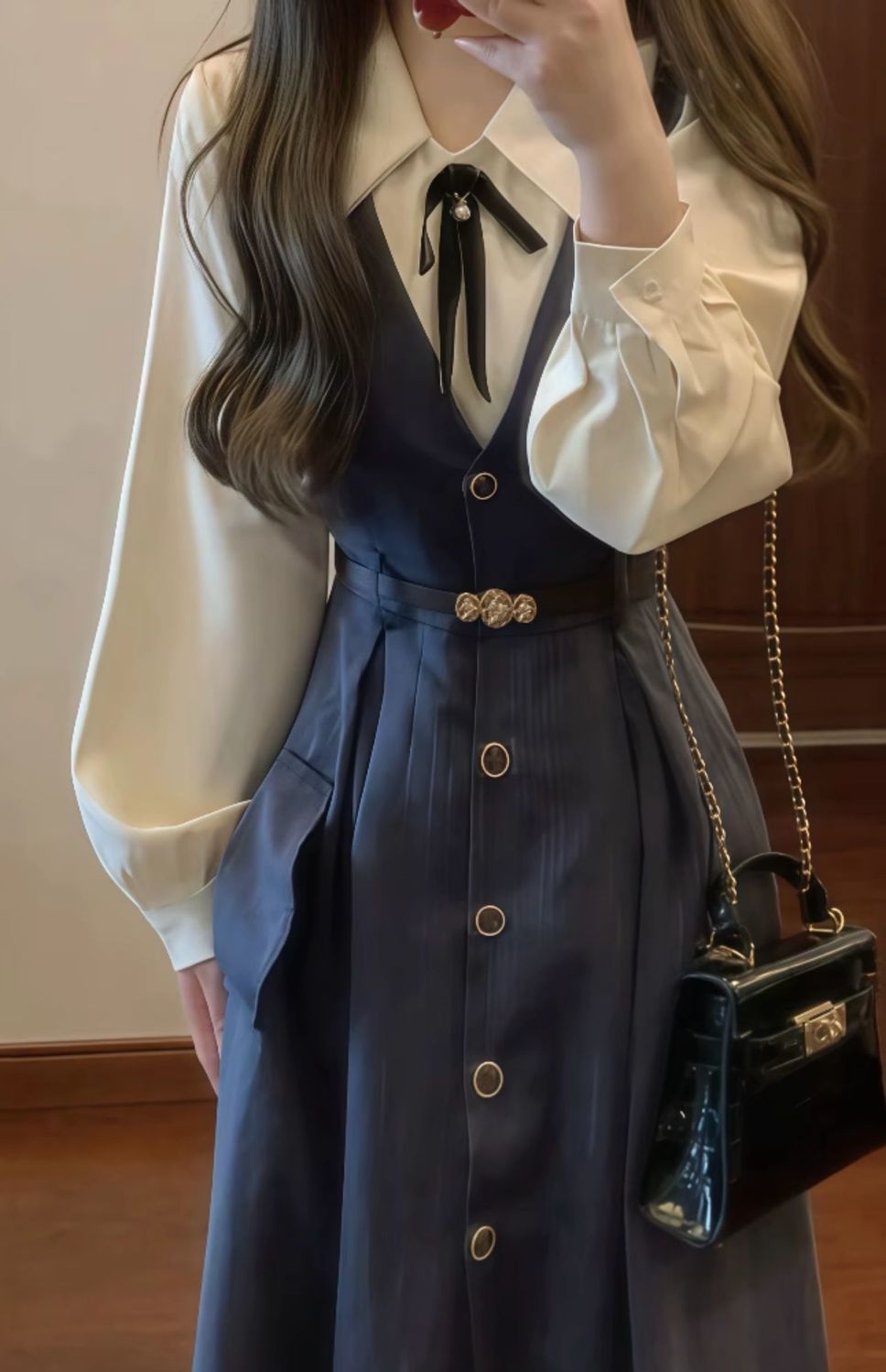 • 네이비 블루 서스펜더 스커트 + 화이트 셔츠 슈트