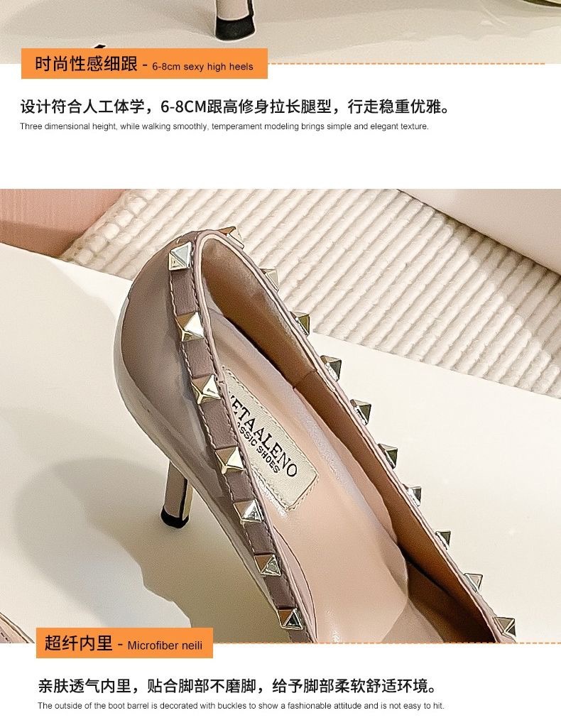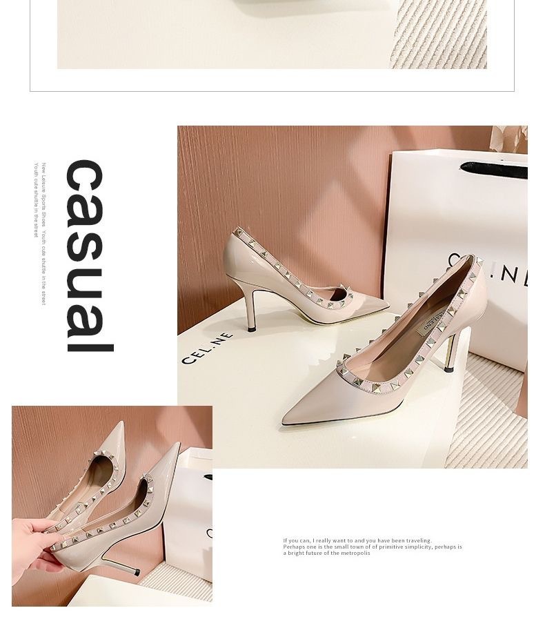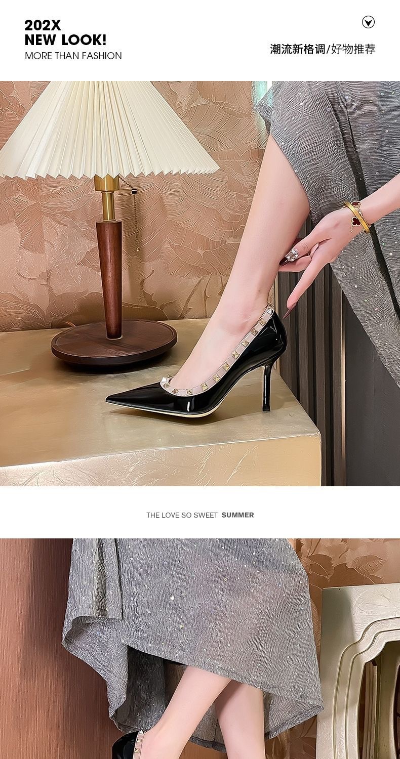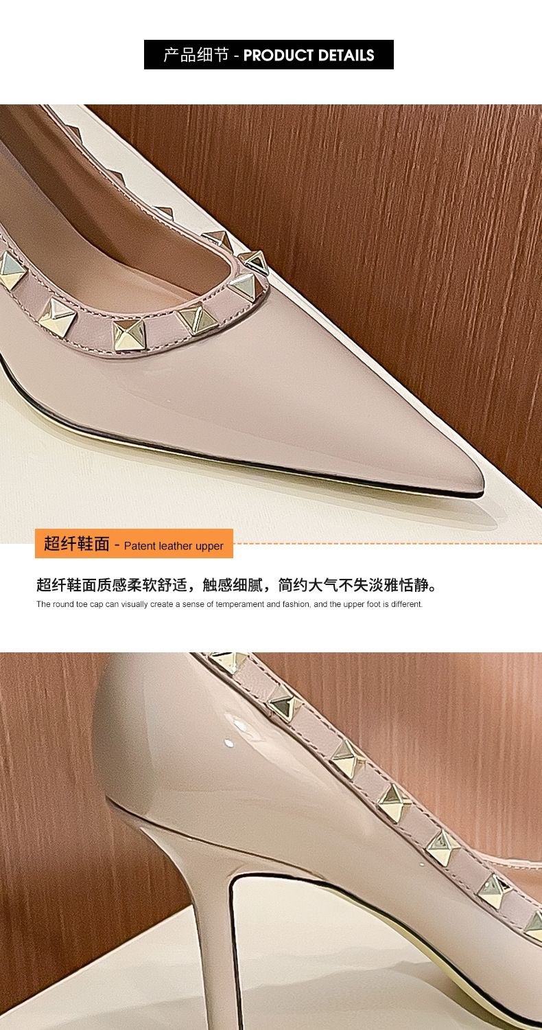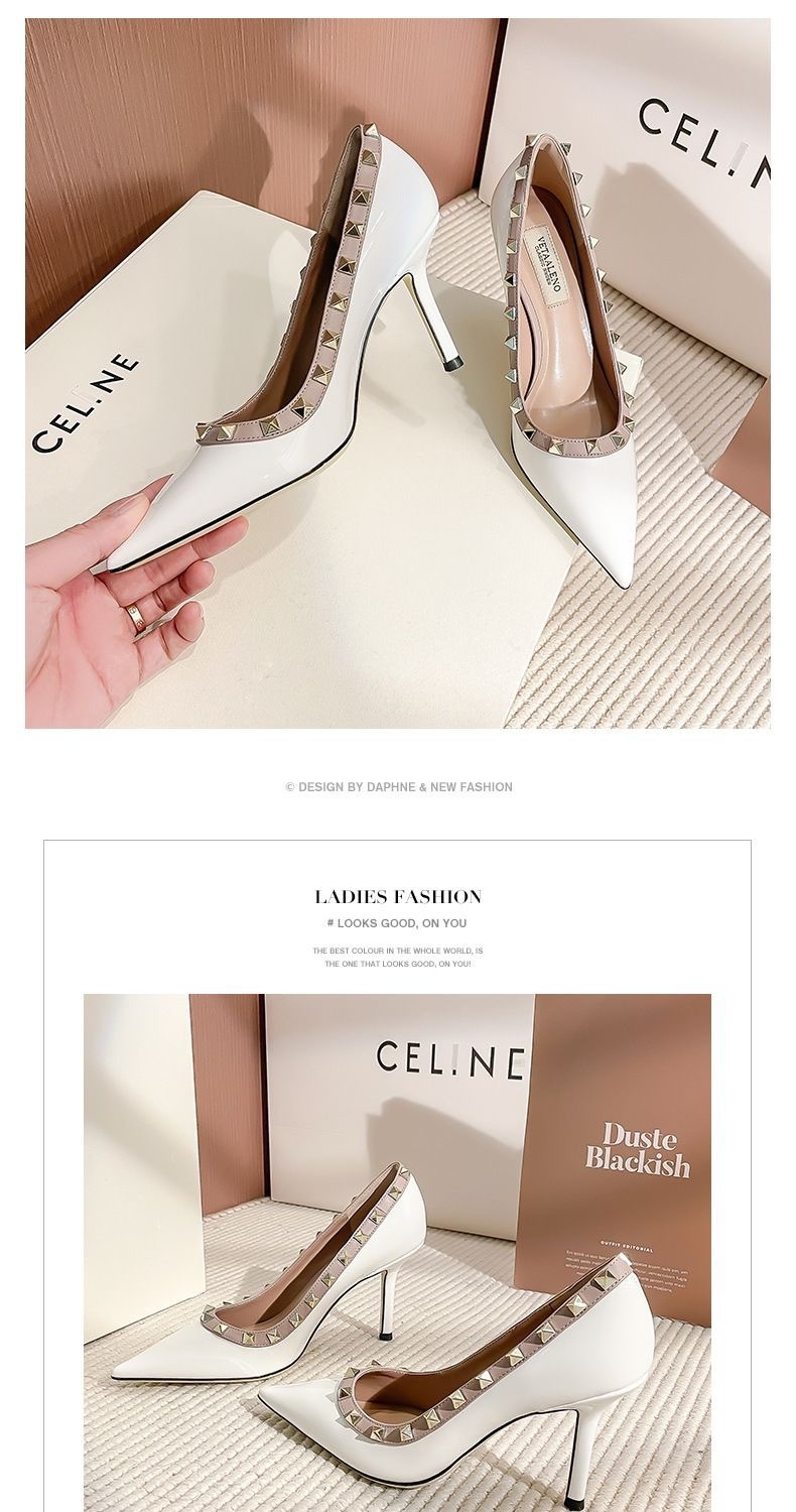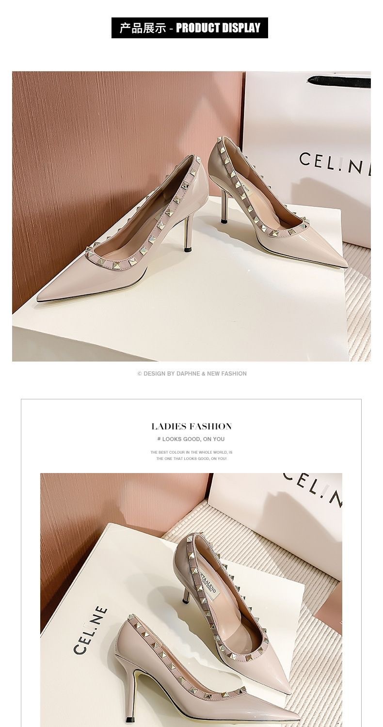 리벳 하이힐 여성 스틸레토 힐 2024 가을 새로운 디자인 감각 틈새 기질 Liu Ding 지적 누드 신발스토어 가기