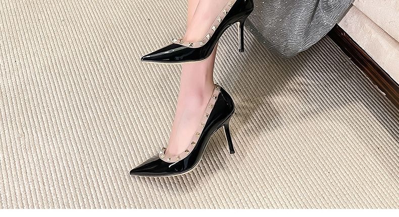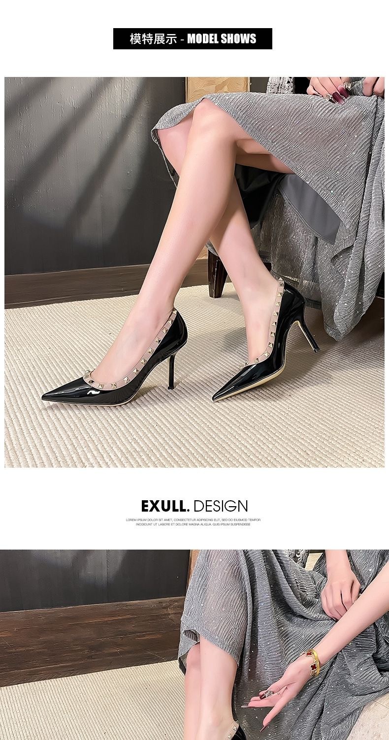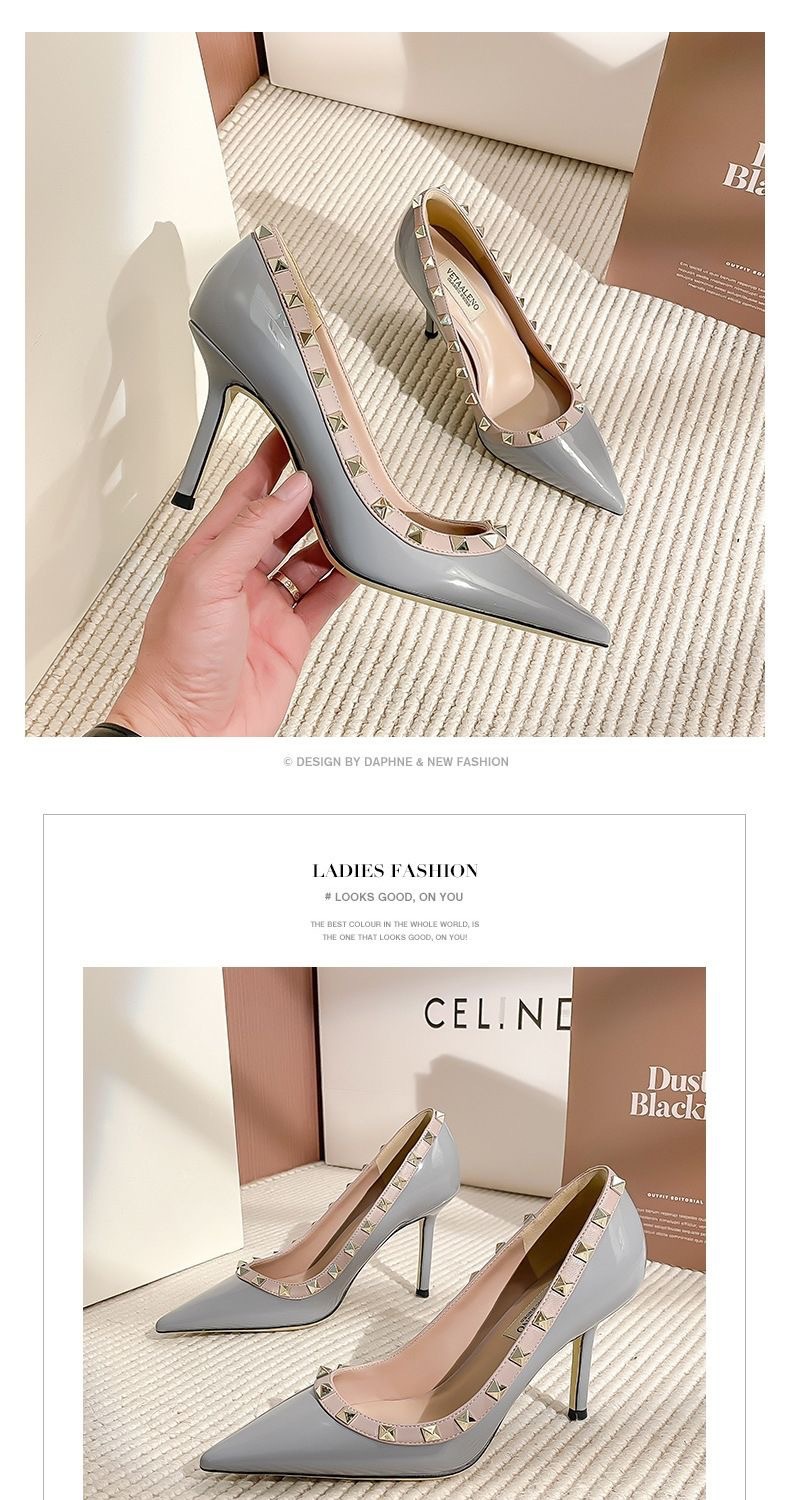 리벳 하이힐 여성 스틸레토 힐 2024 가을 새로운 디자인 감각 틈새 기질 Liu Ding 지적 누드 신발