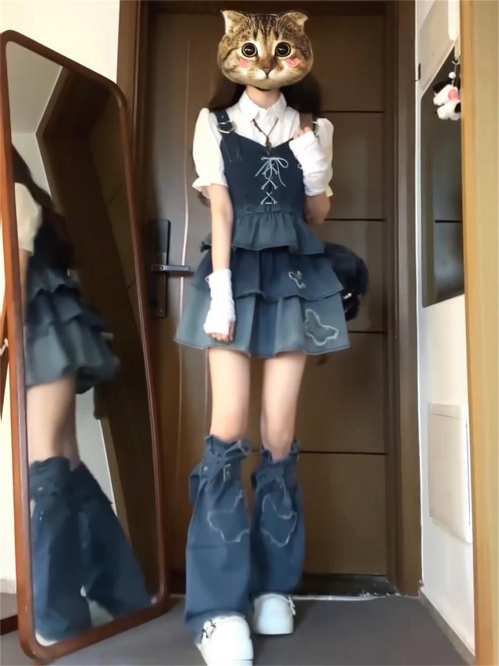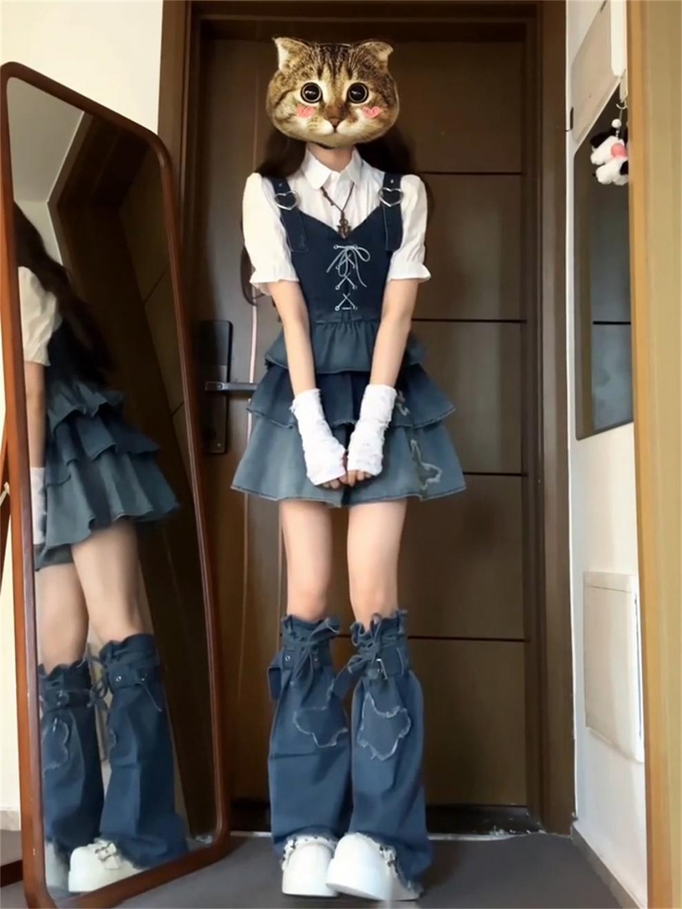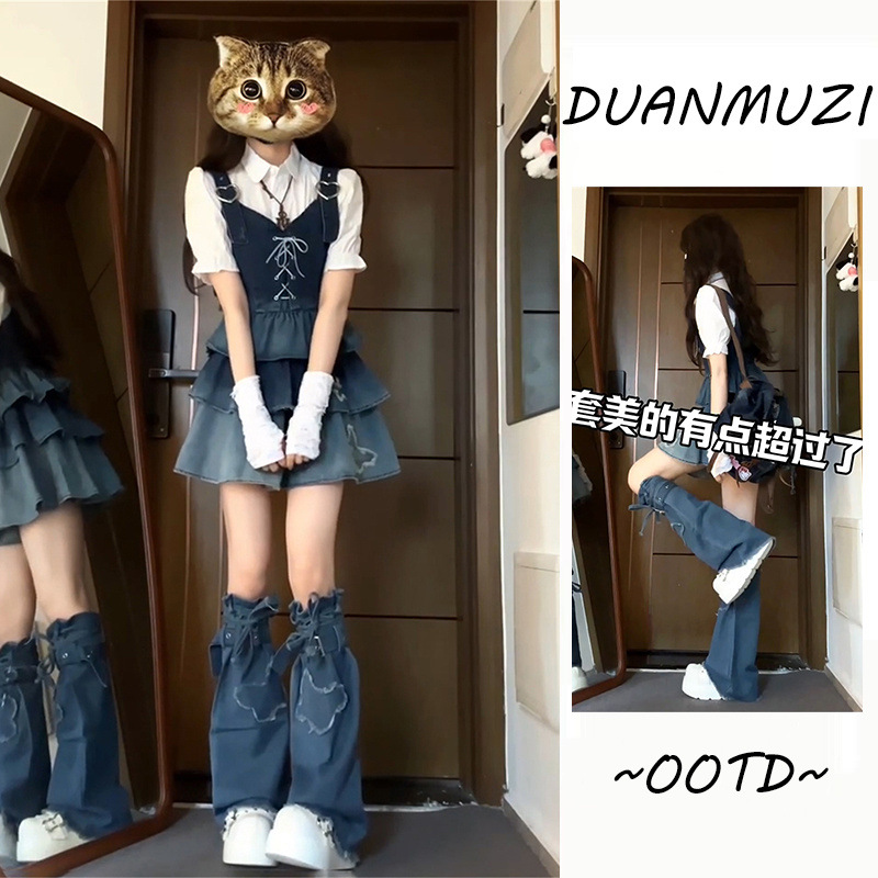DUANMUZI 순수한 욕망 3 피스 그라디언트 컬러 짧은 데님 조끼 화이트 셔츠 데님 케이크 주름 치마