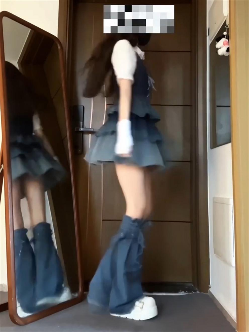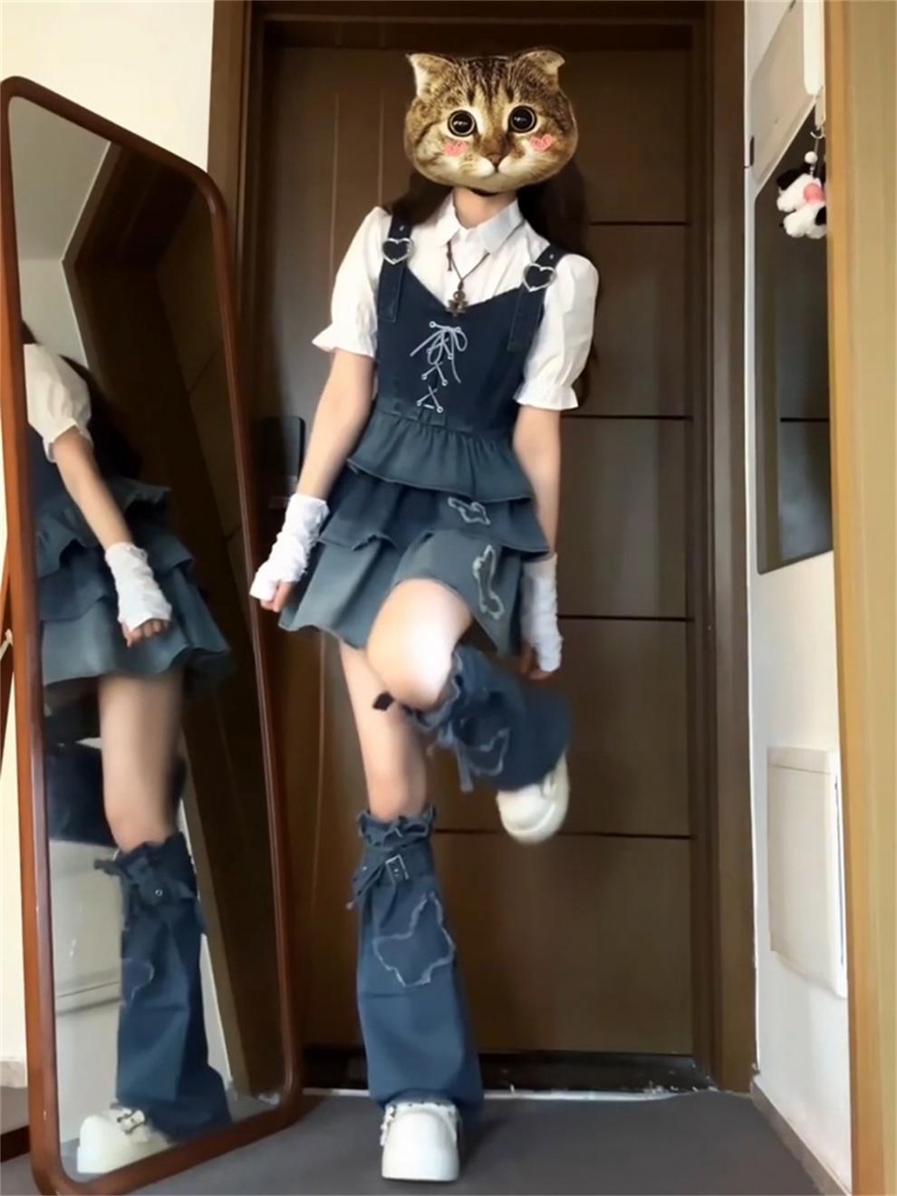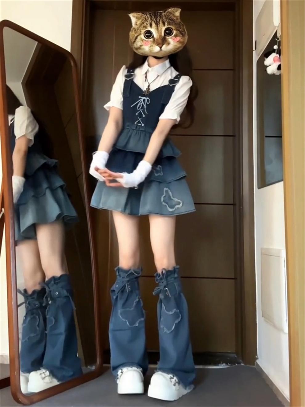 DUANMUZI 순수한 욕망 3 피스 그라디언트 컬러 짧은 데님 조끼 화이트 셔츠 데님 케이크 주름 치마
