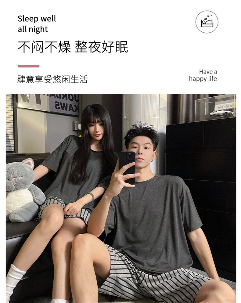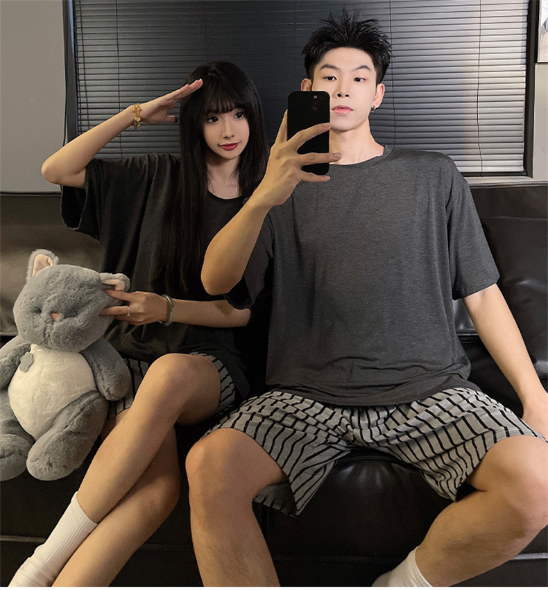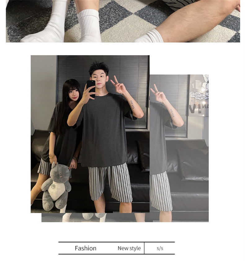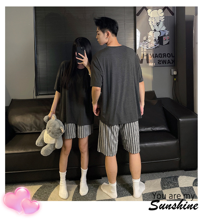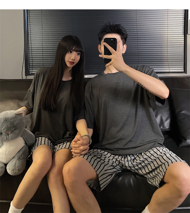 모달 커플 잠옷 세트 여성 여름 패션 수직 줄무늬 단색 짧은 소매 반바지 홈 착용 남성용스토어 가기